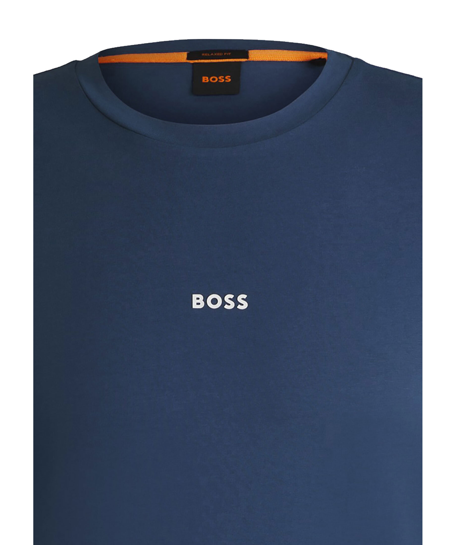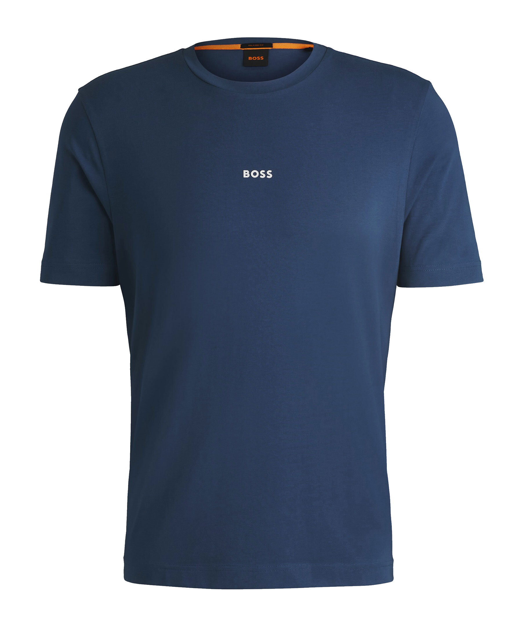 Mörkblå t-shirt från BOSS Orange. T-shirten har korta ärmar, rund halsringning samt en gummerad logotyp mitt på bröstet. Tillverkad i en stretchig bomullsblandning.