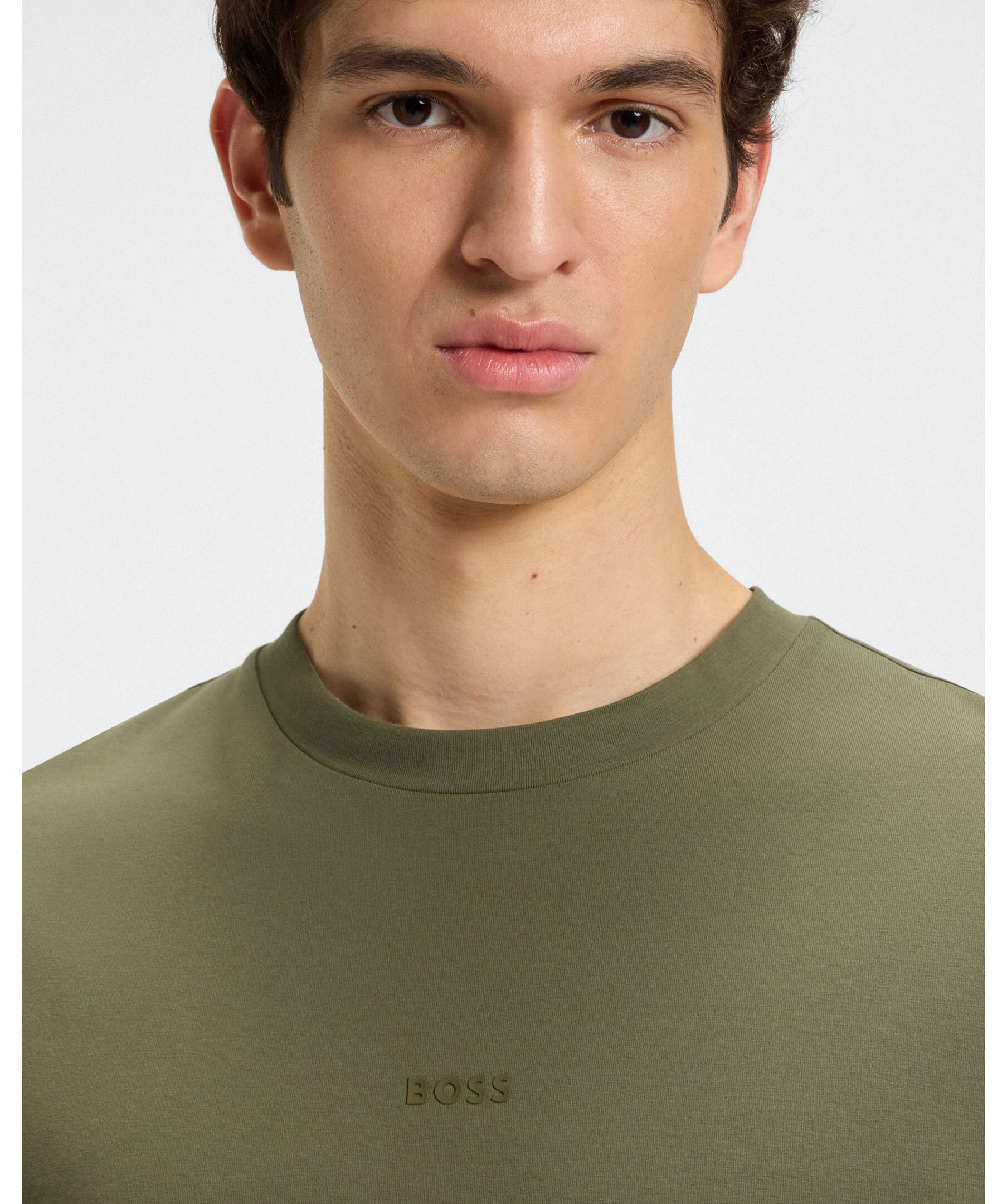 Mörkgrön t-shirt från BOSS Orange. T-shirten har korta ärmar, rund halsringning samt en gummerad logotyp mitt på bröstet. Tillverkad i en stretchig bomullsblandning.
