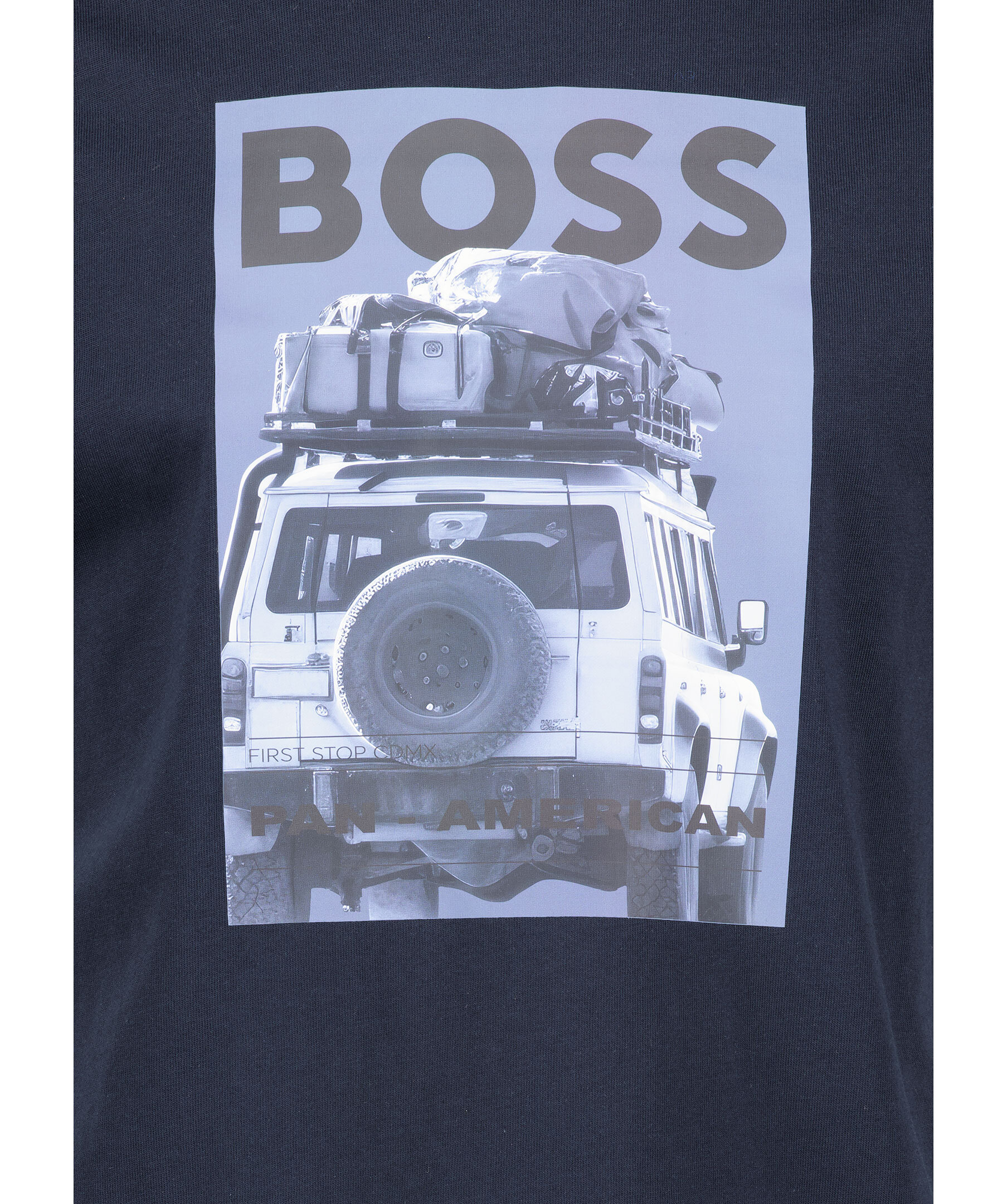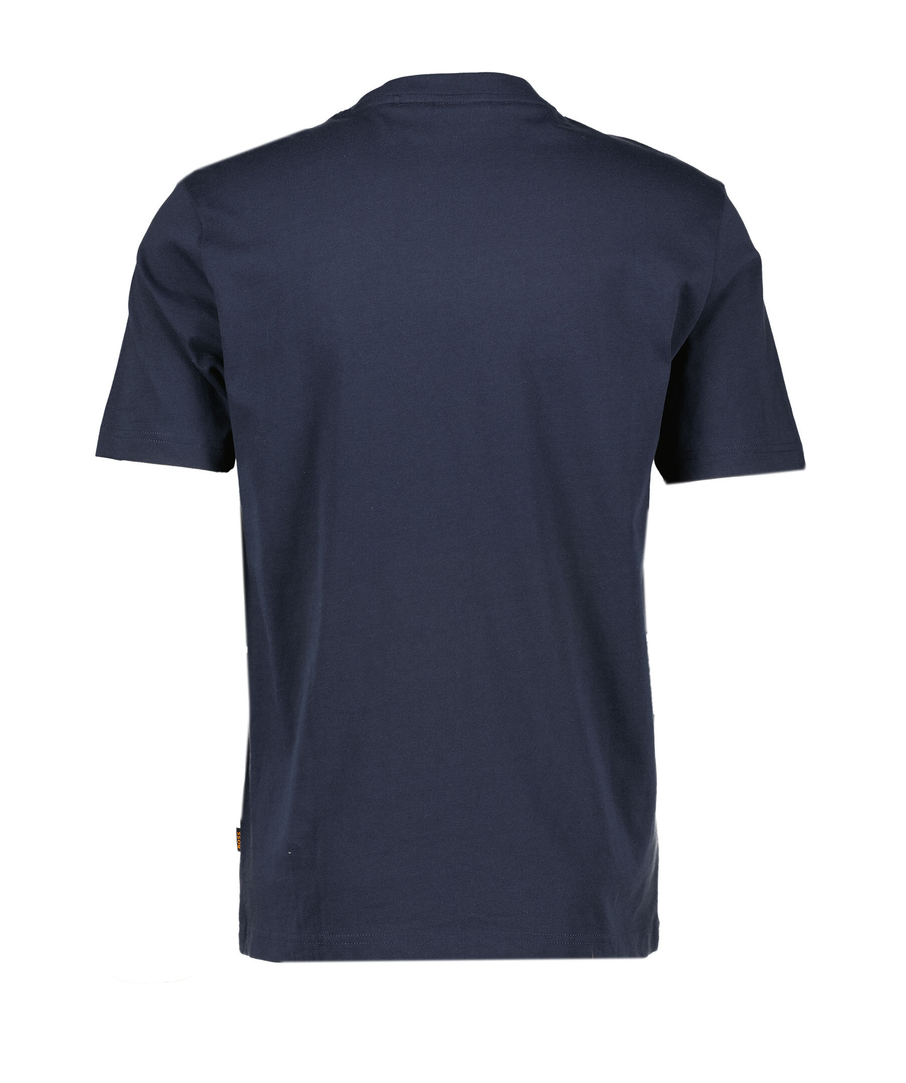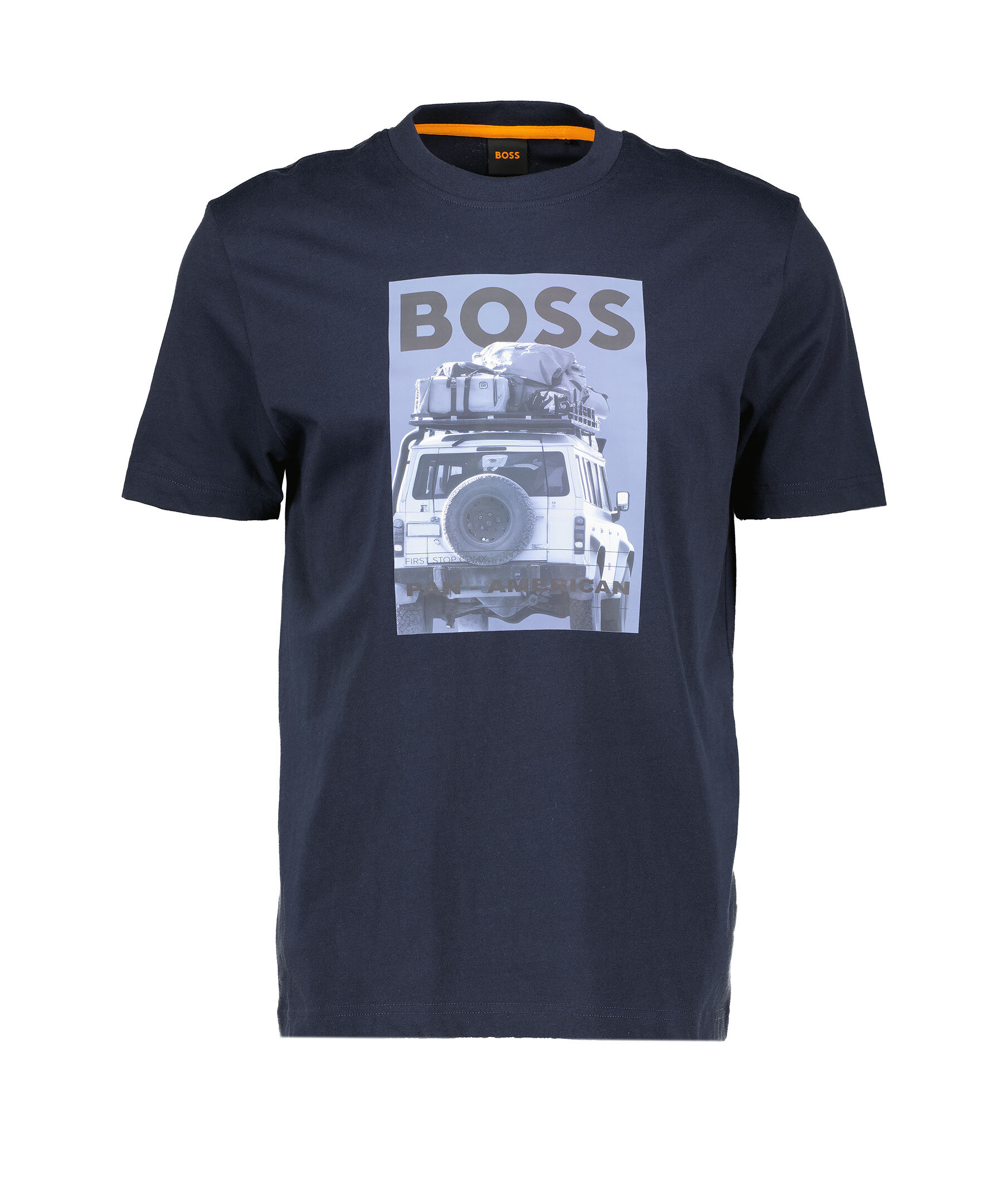 Mörkblå t-shirt från Boss Orange. T-shirten har ribbstickad krage och tryck på framsidan, tillverkad av 100% bomull.
