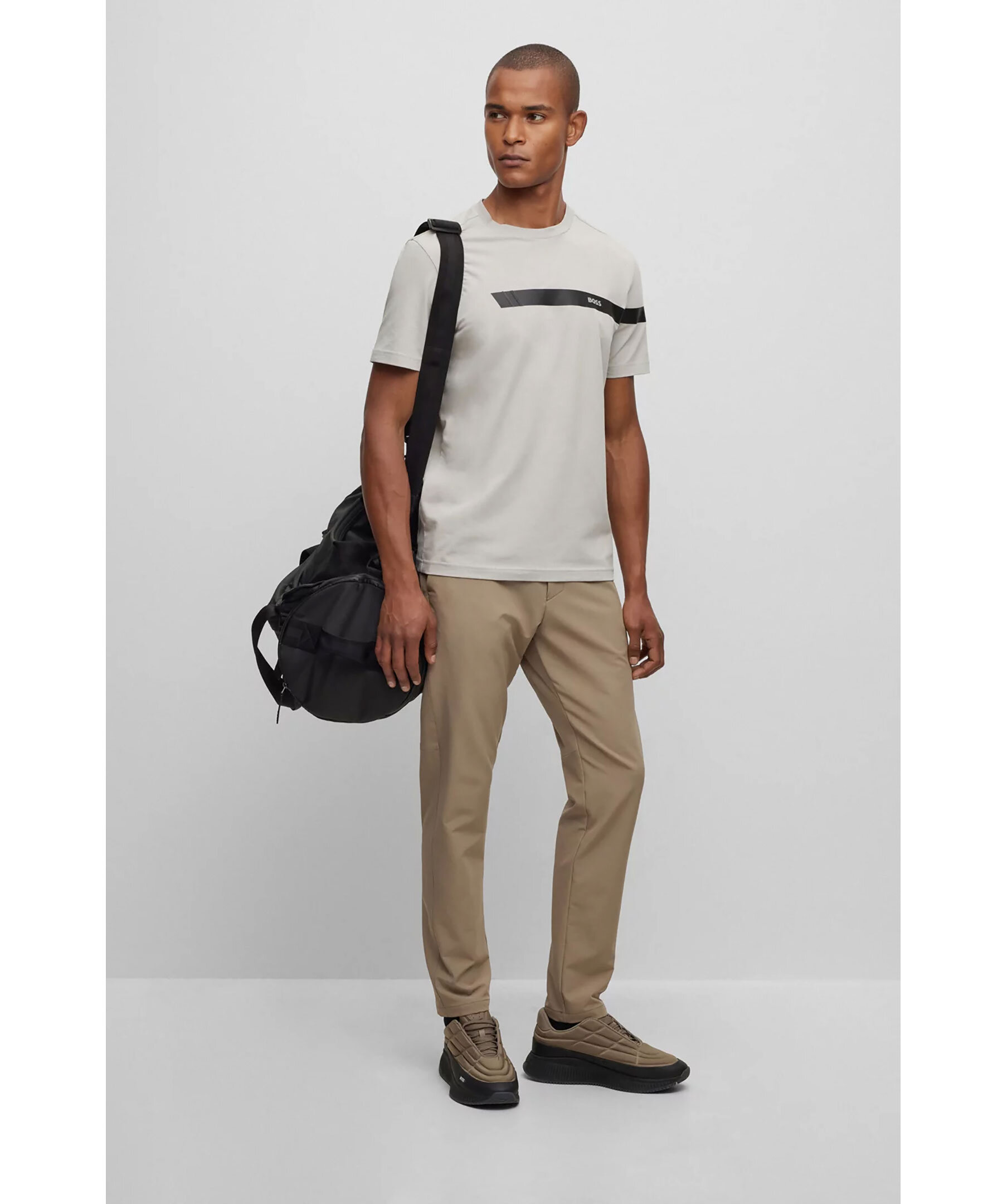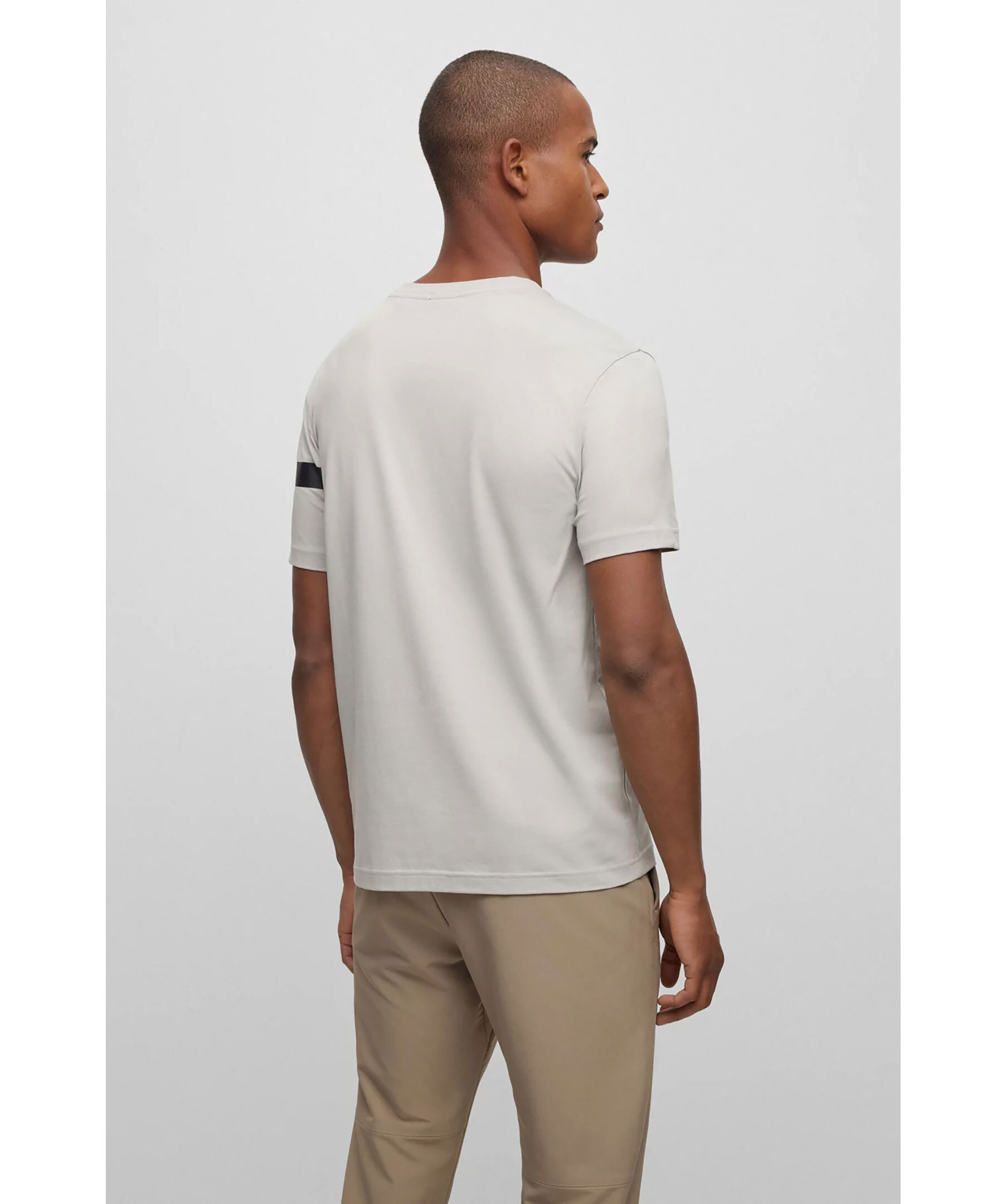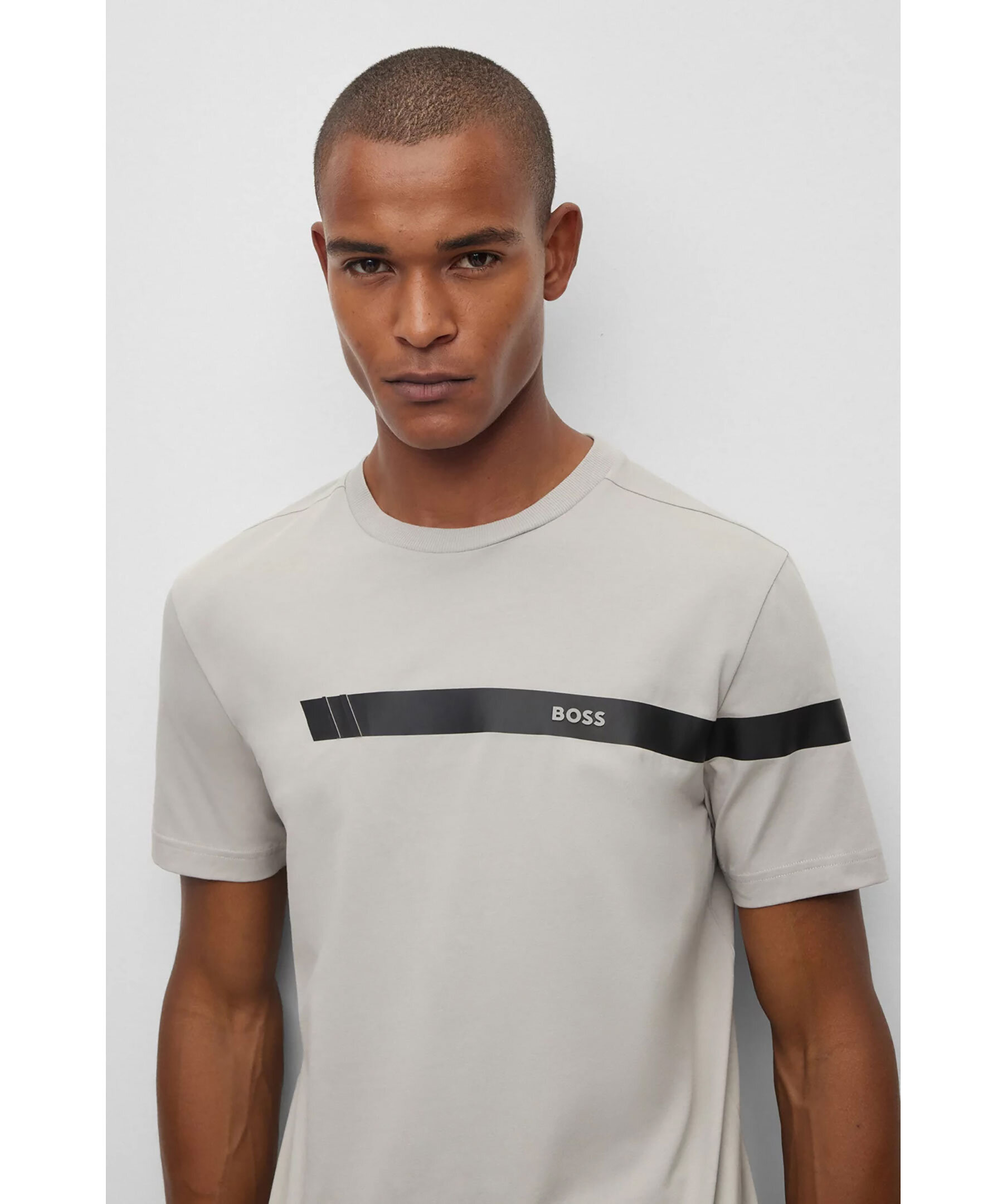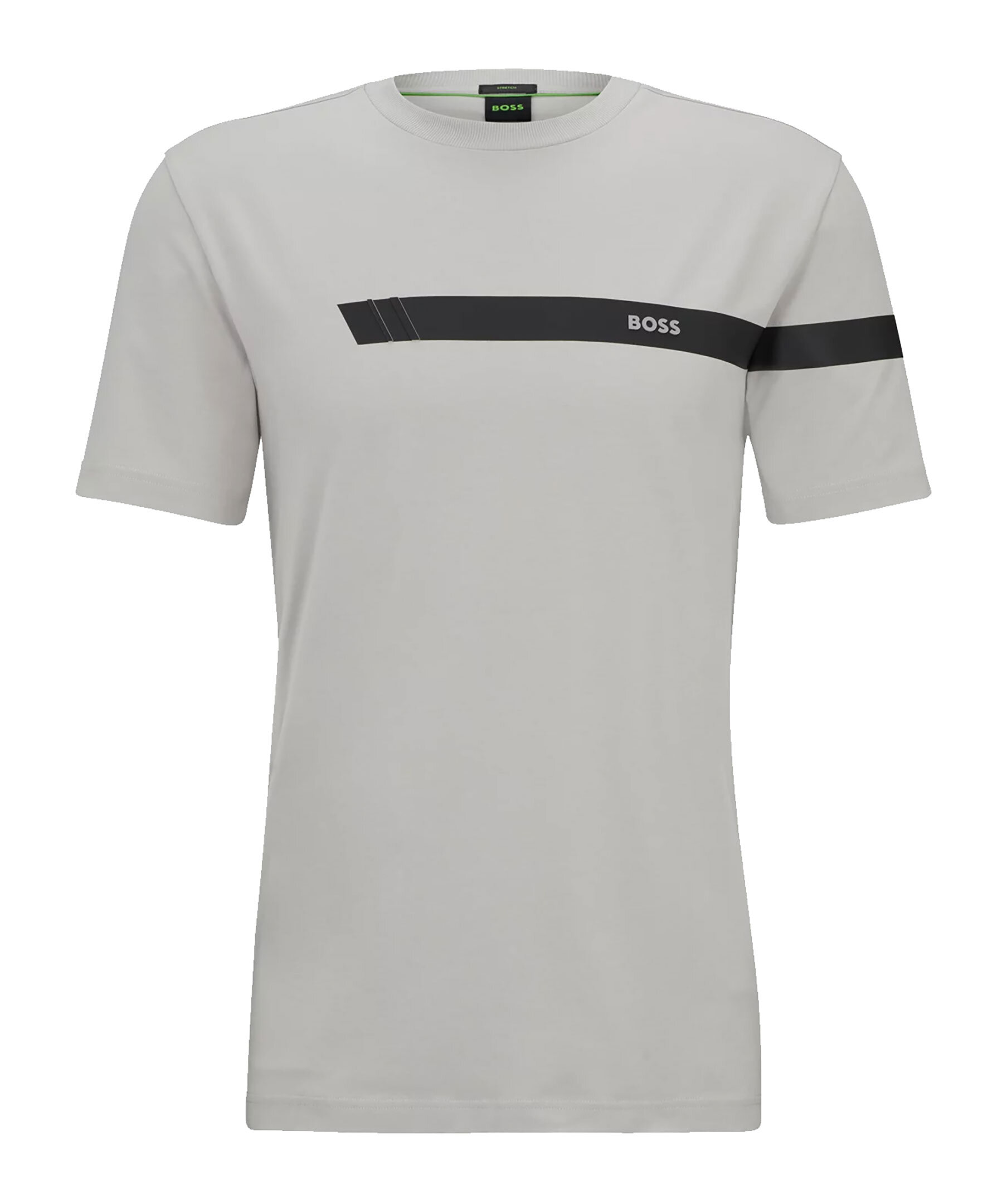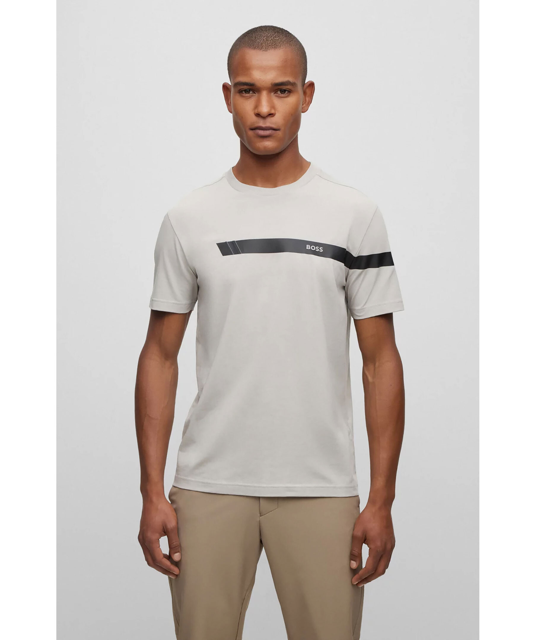 Grå kortärmad T-shirt från BOSS Green Menswear. Rak passform i stretchig bomullsjersey med sportig tryckt rand i svart och logotyp. Normal passform.