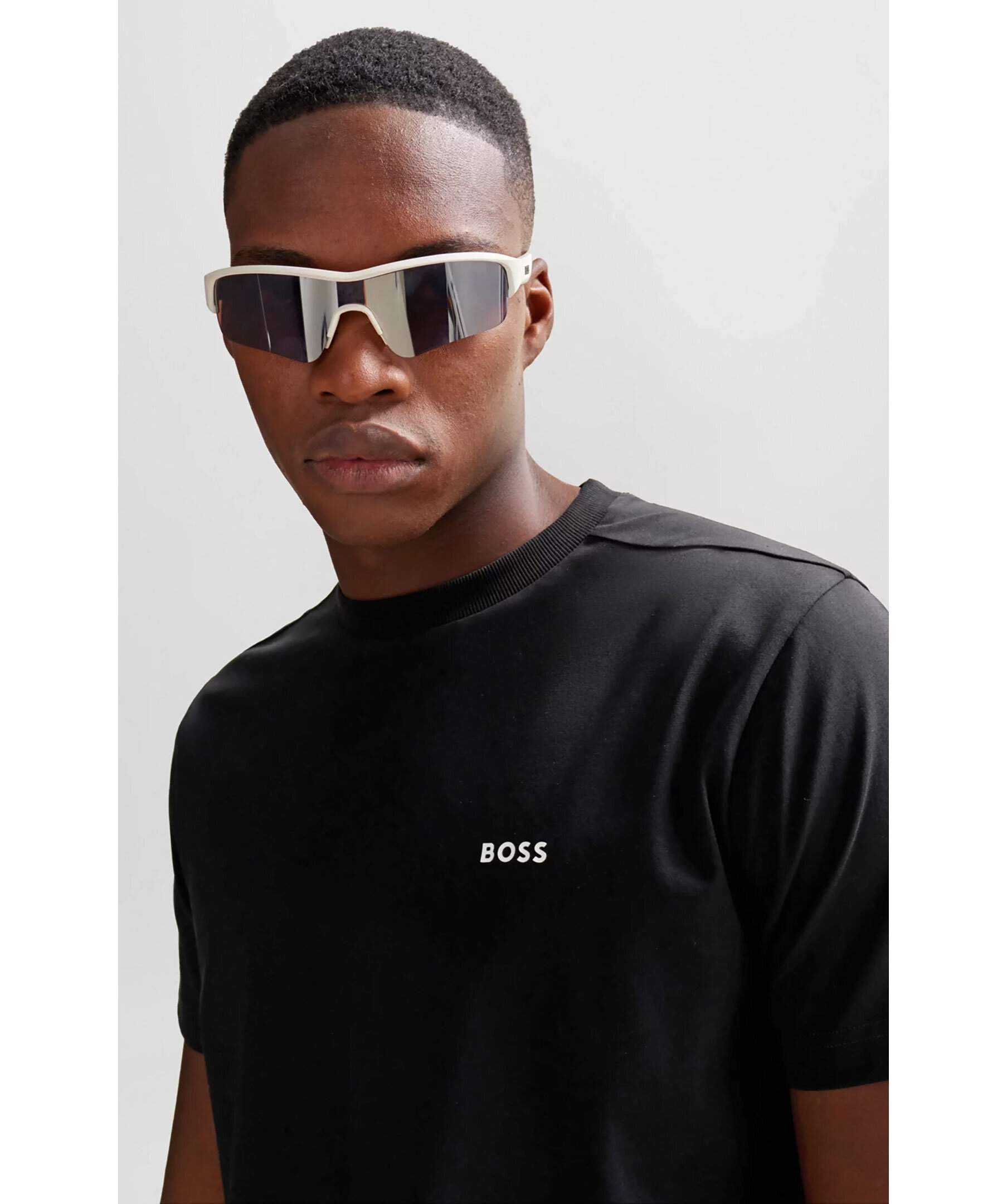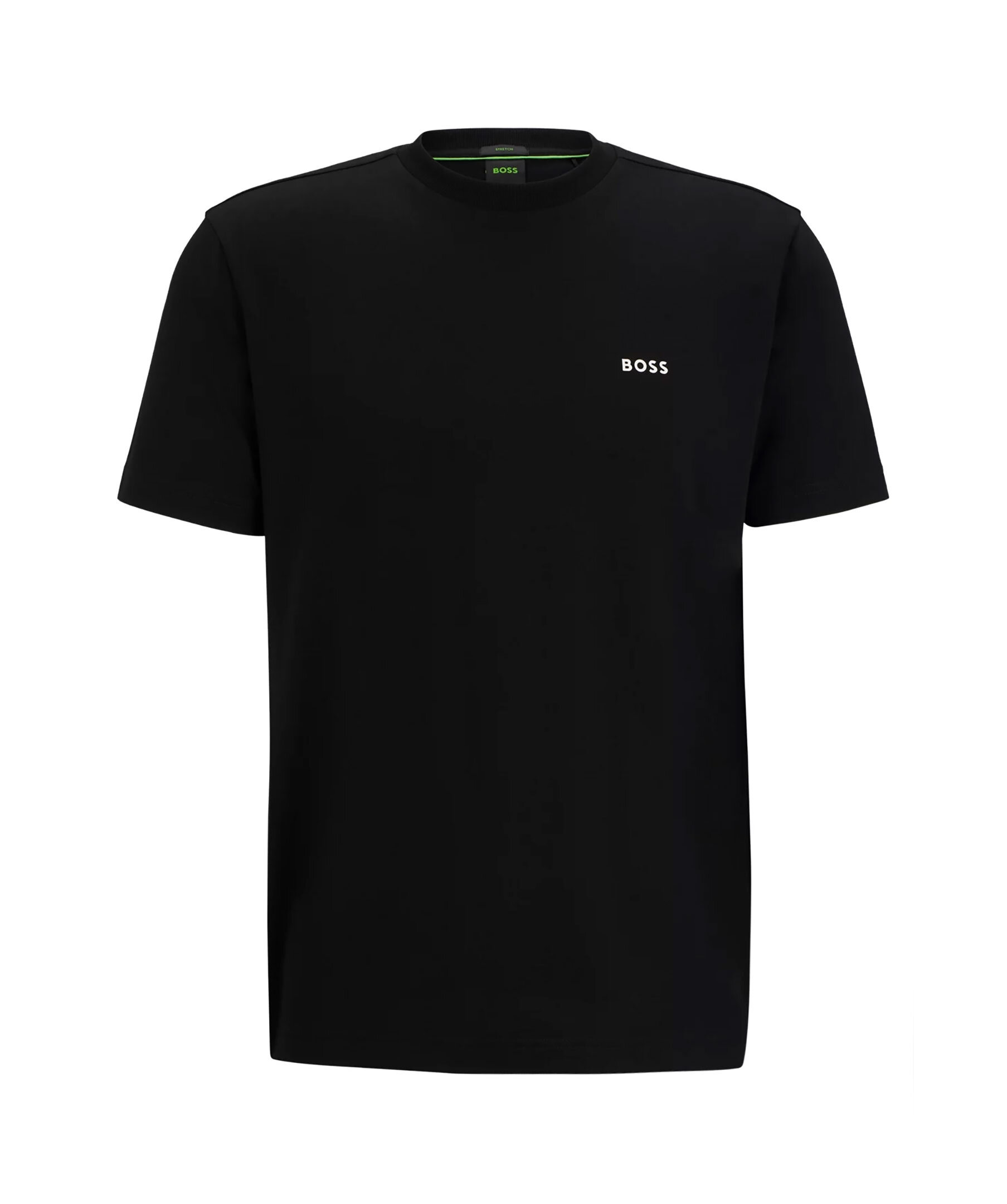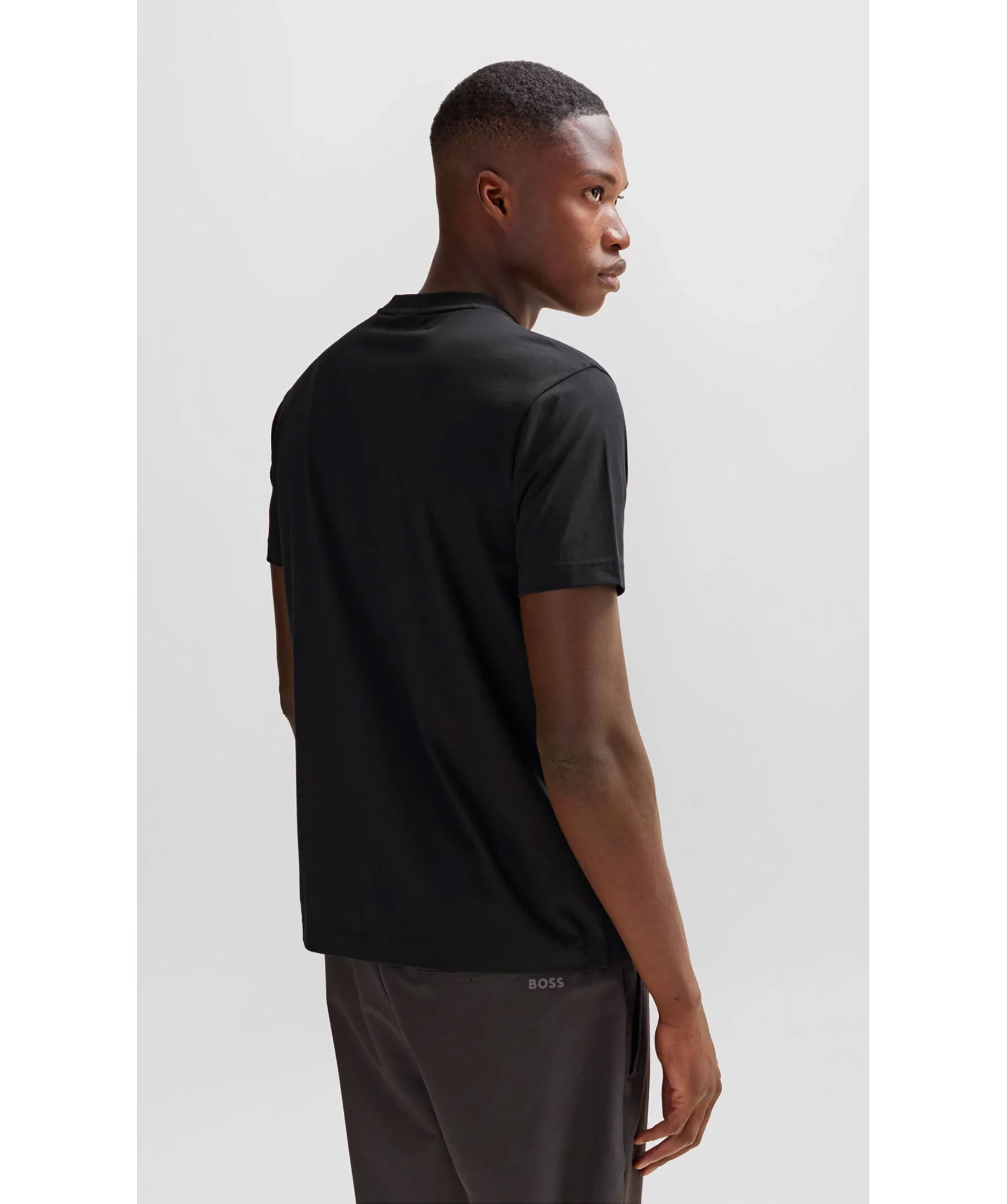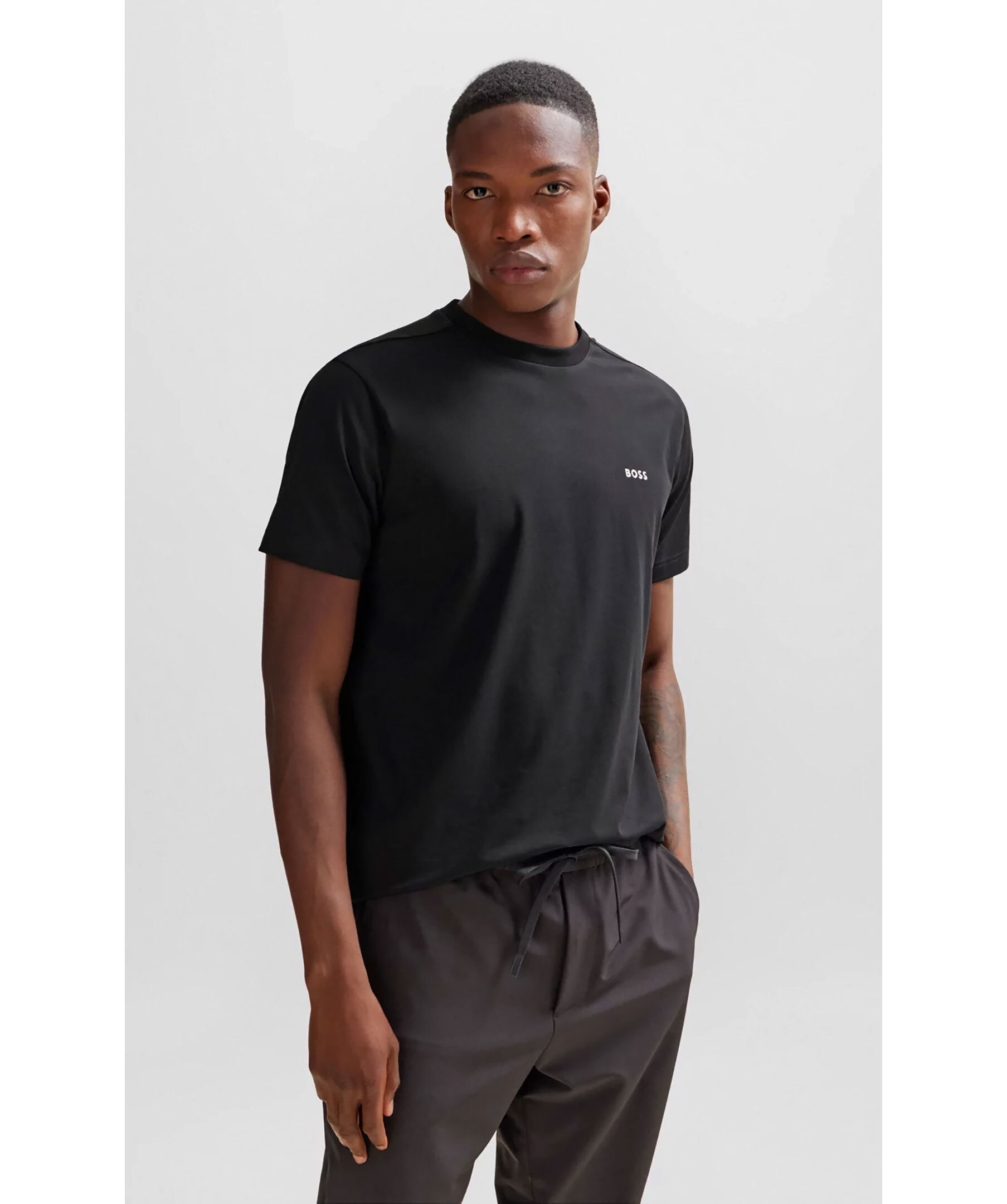 Svart T-shirt från BOSS Green. Rundad halsringning med ribbstickad mudd. Tryckt logotyp i vitt på vänster bröst. Tillverkad i Bomulls blandning.