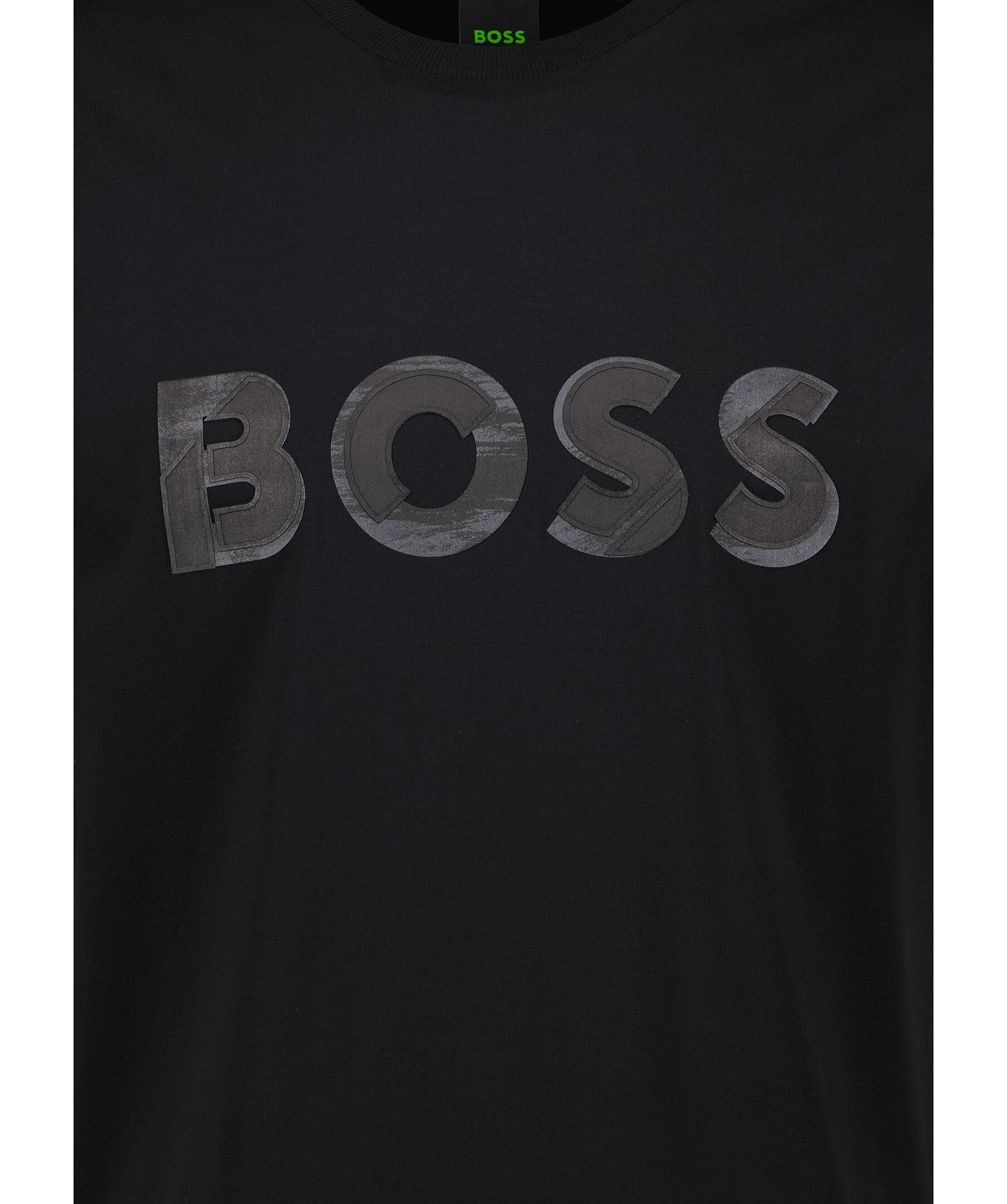 Svart T-shirt från BOSS Green. Svart tryck över bröstet och magen. Rundad halsringning med ribbstickad kant. Gummerad logotyp på vänster bröst och vänster ärm. Tillverkad i 100% bomull.