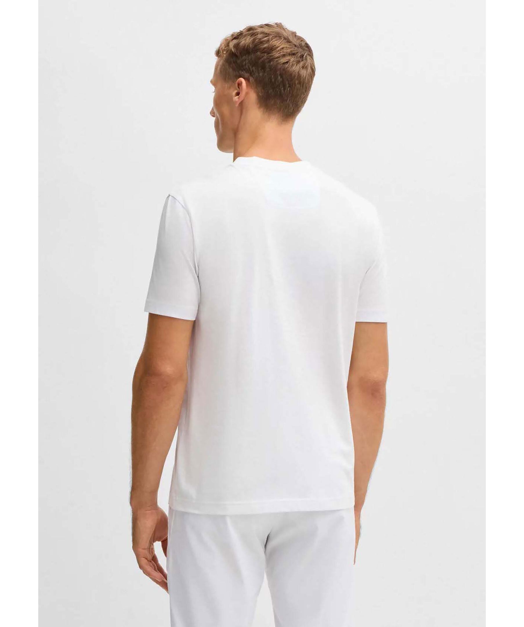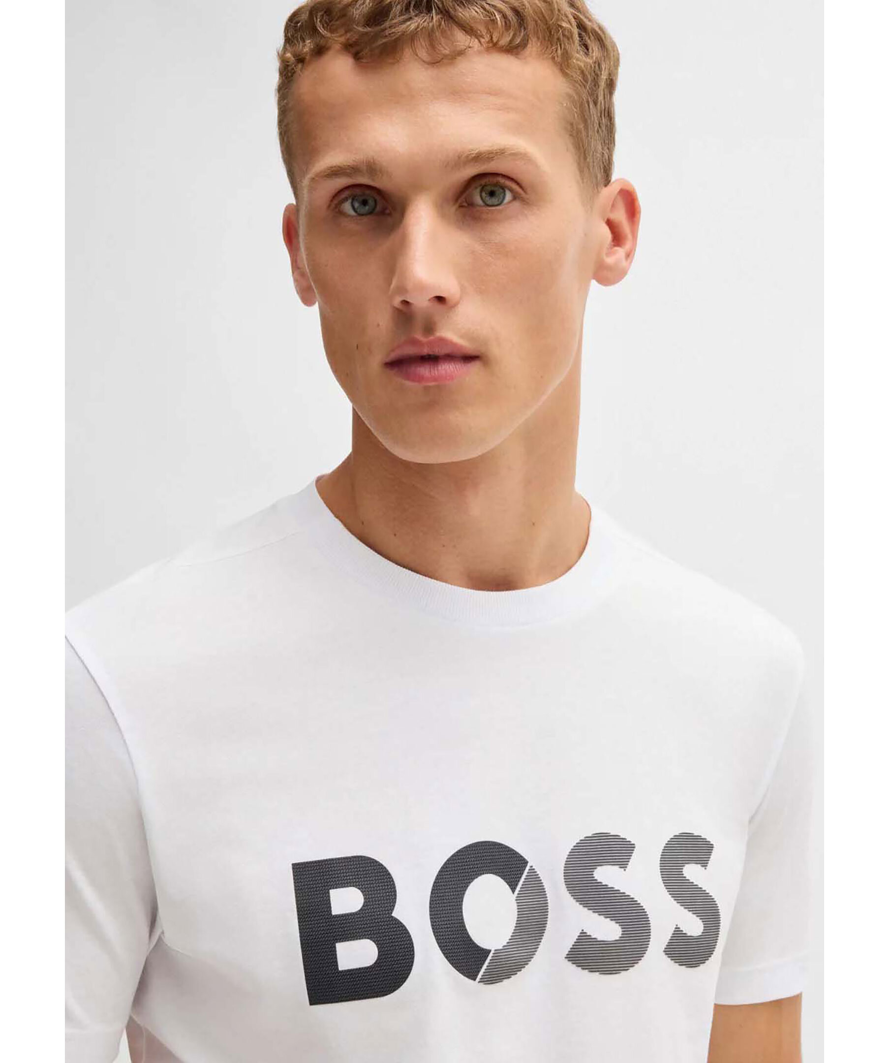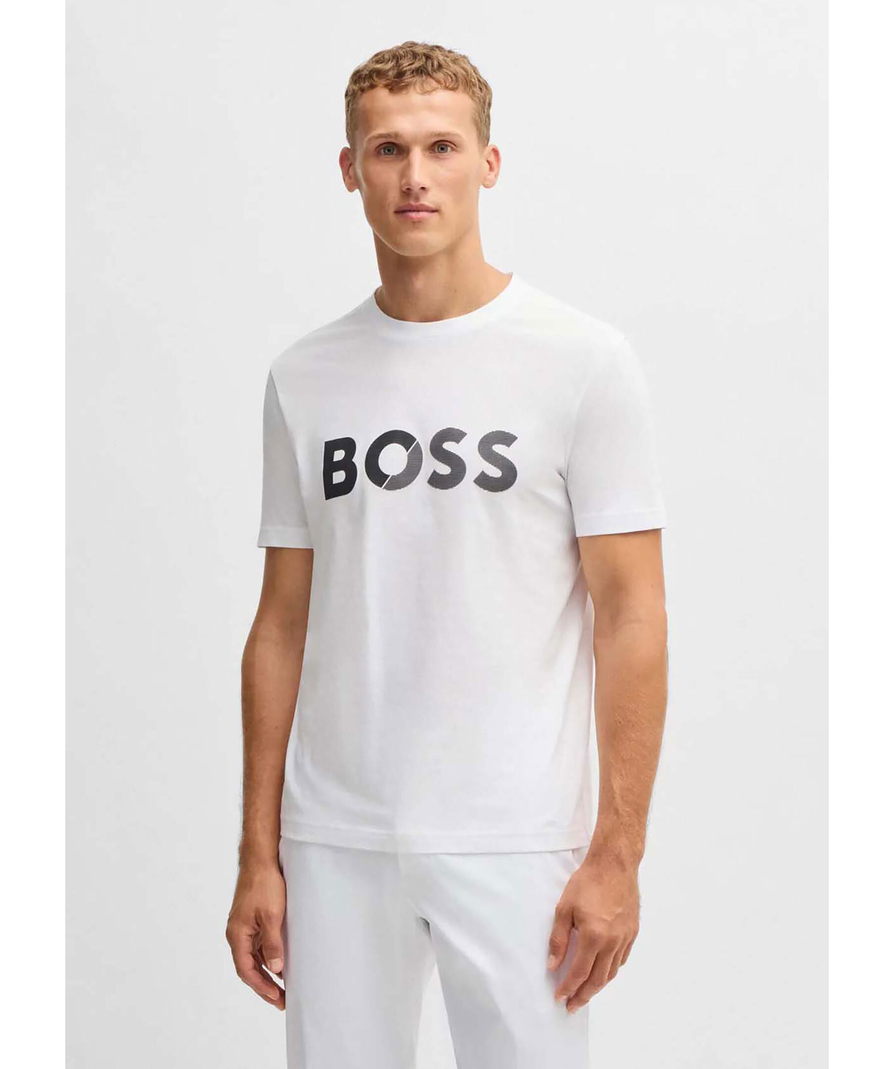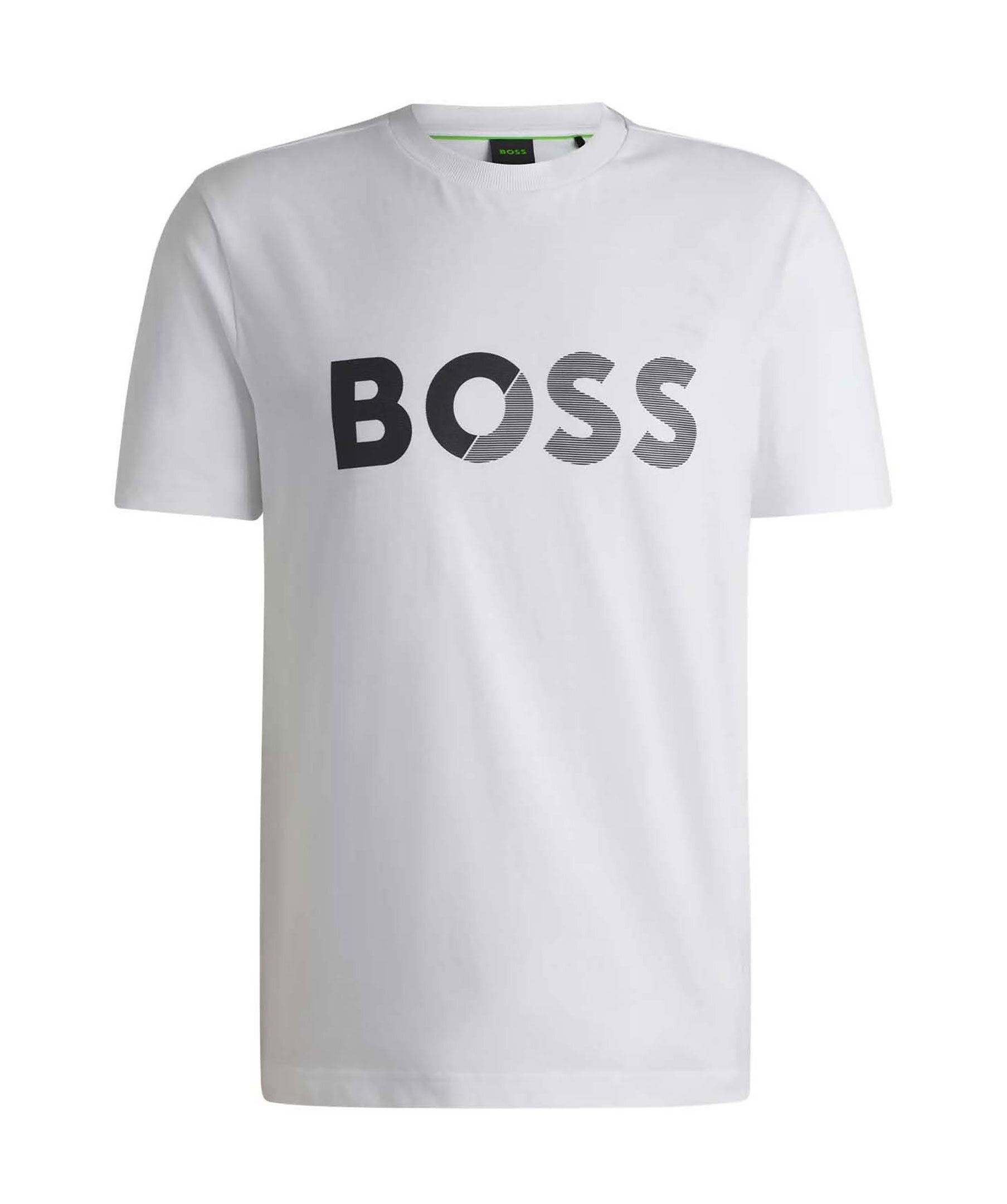 Vit t-shirt från BOSS Green med stort logotyptryck på bröstet. T-shirten har rundad halsringning och korta ärmar. Tillverkad i bomull.