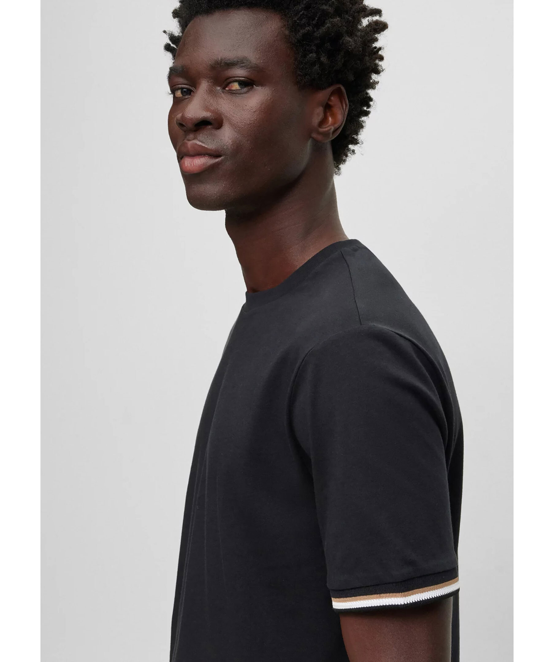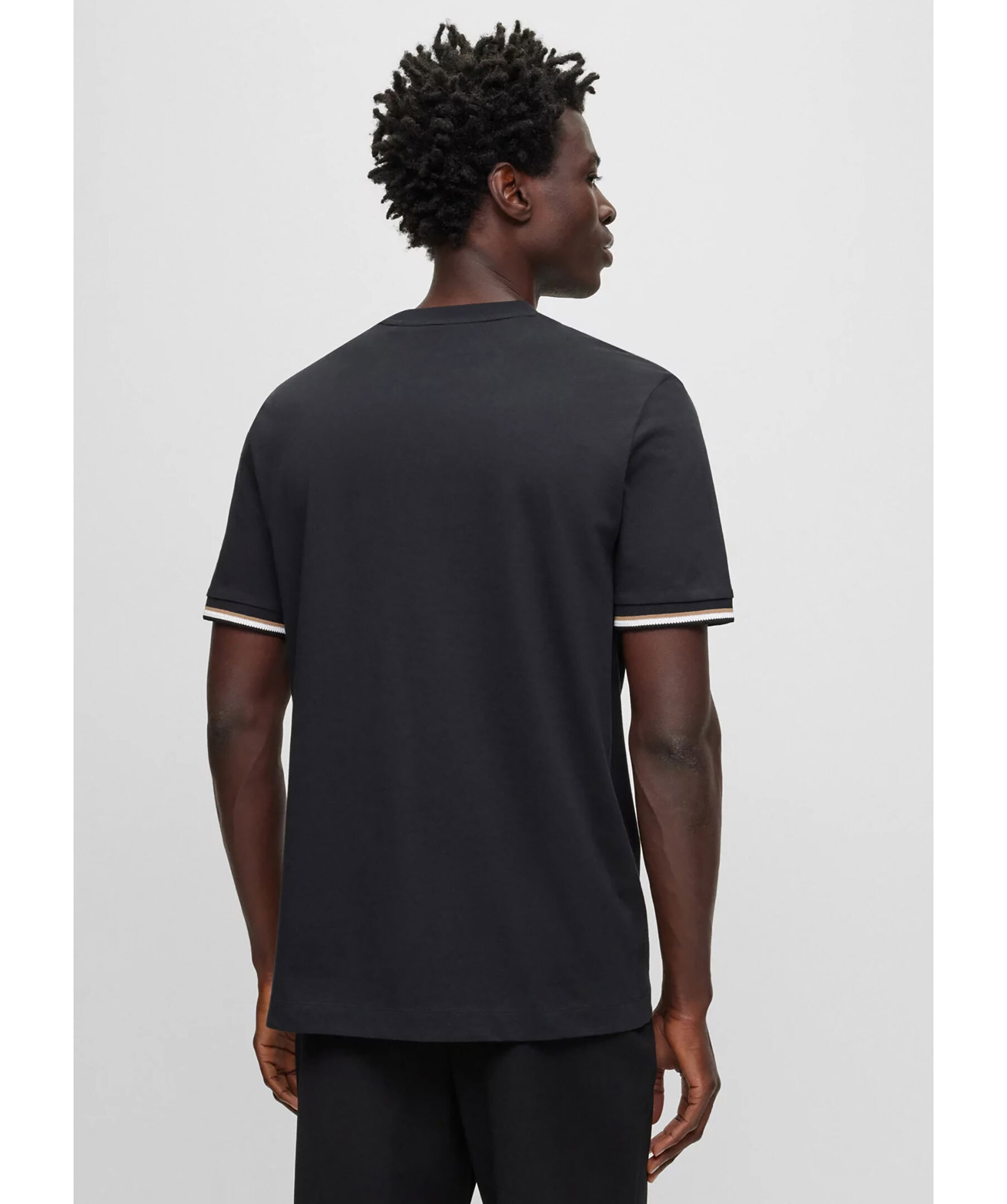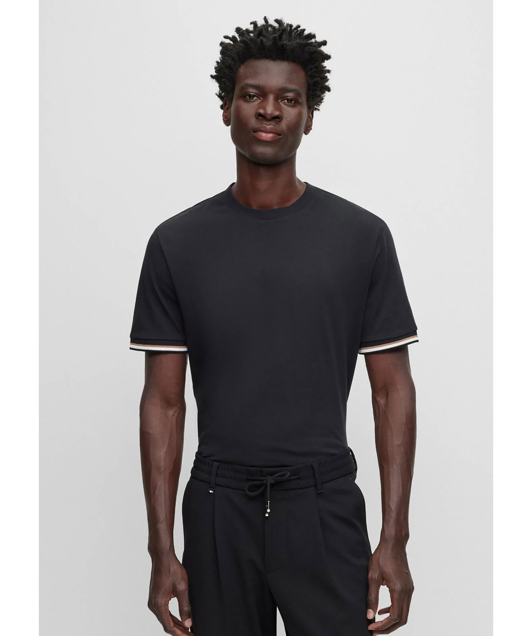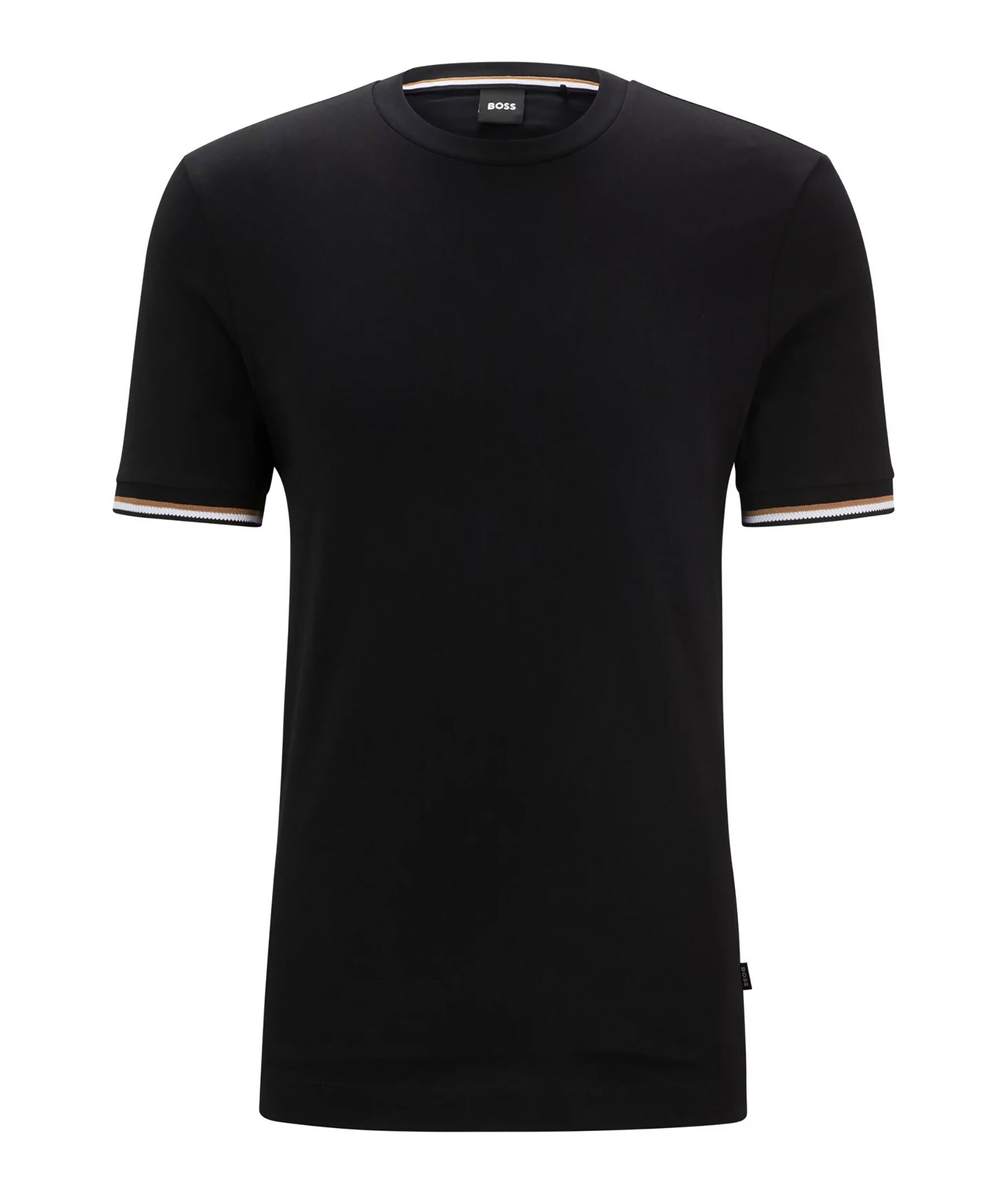 Svart T-shirt i regular fit från BOSS Black. Tillverkad av single jersey och med deras signaturfärger i ärmsluten. T-shirten har rundad hals.