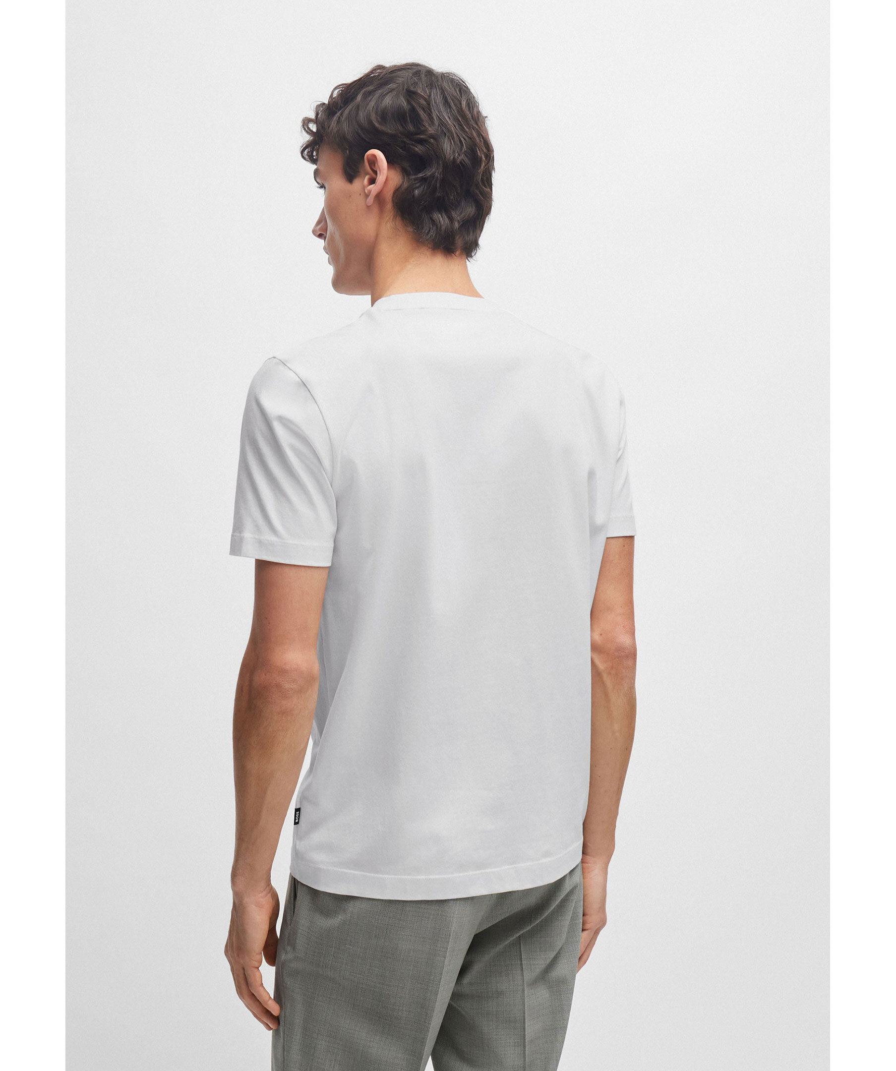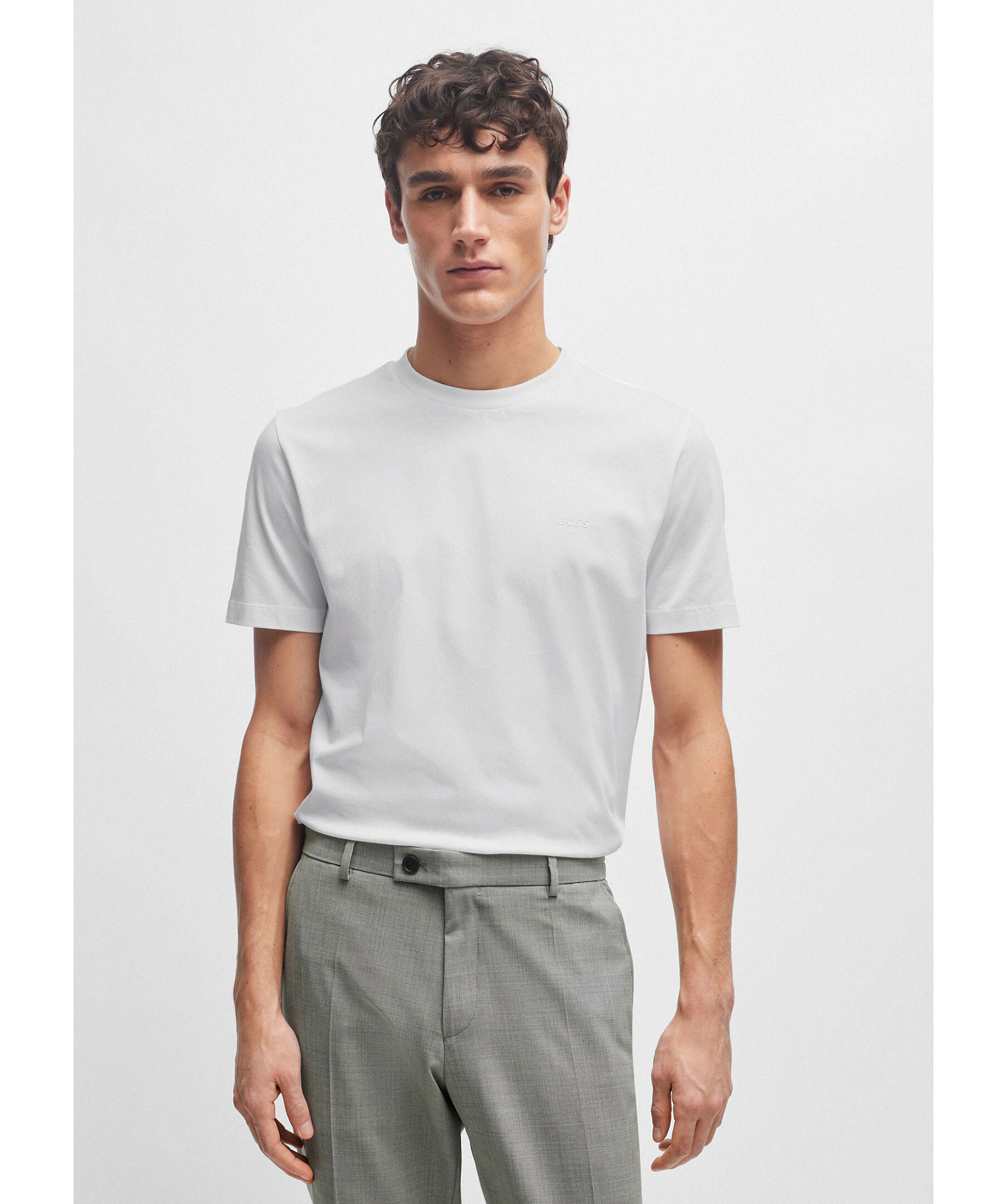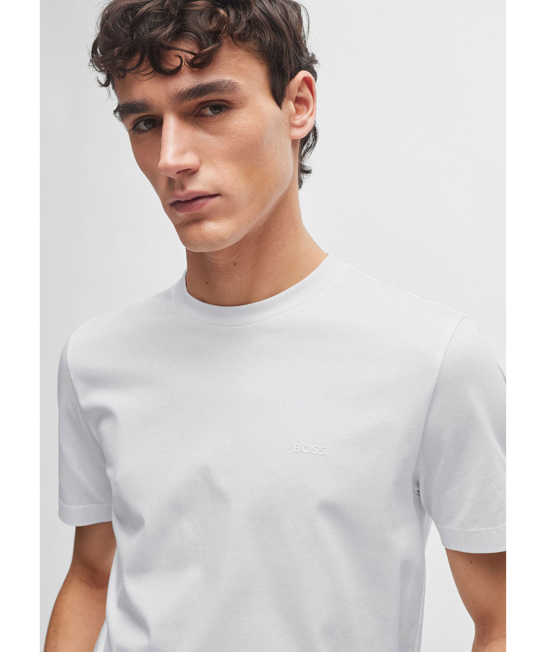 Vit t-shirt från BOSS Black. Rundad halsringning. Gummerad logotyp på vänster bröst. Tillverkad i 100% bomull. Liten lapp med logotyp på vänster sida.
