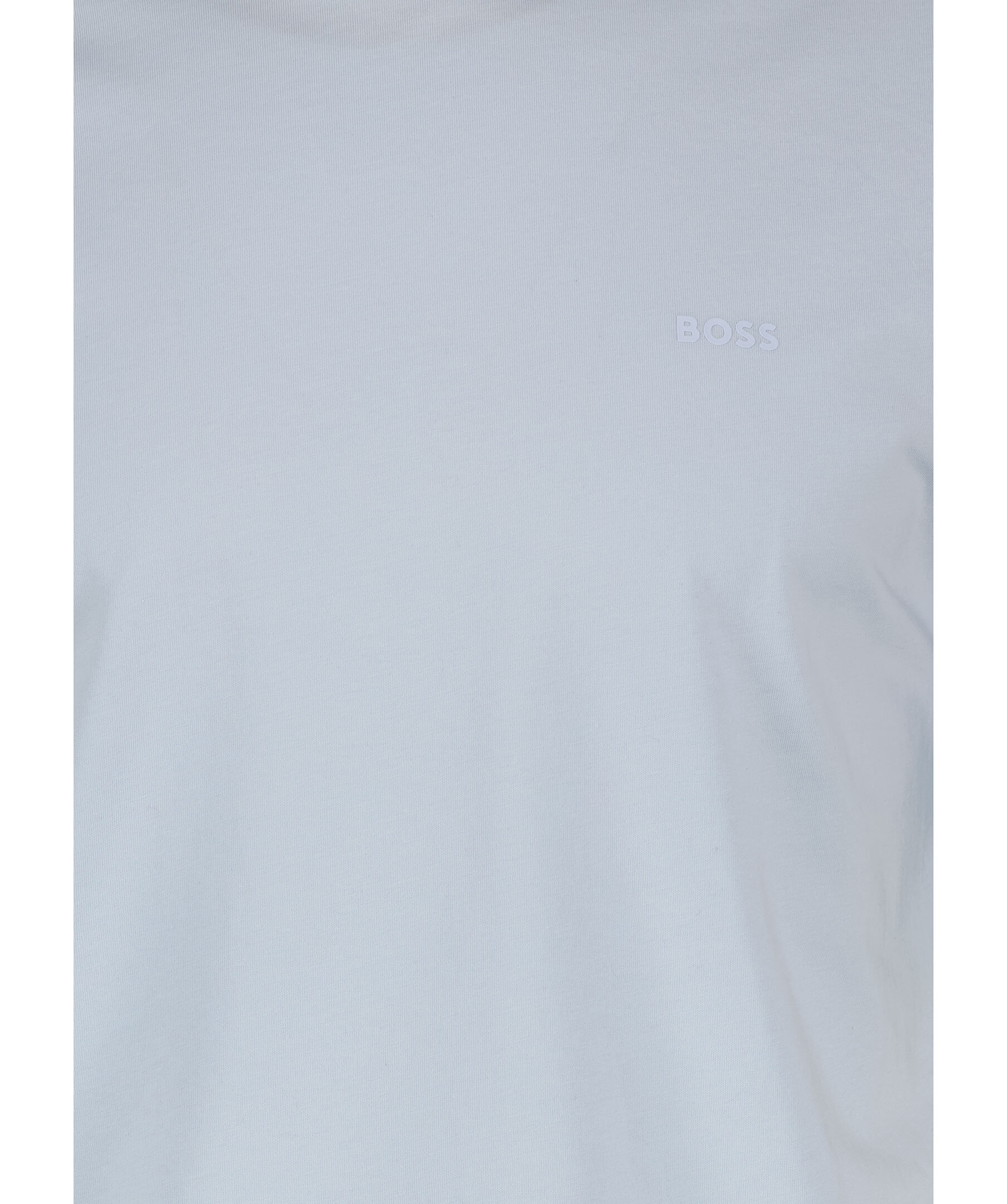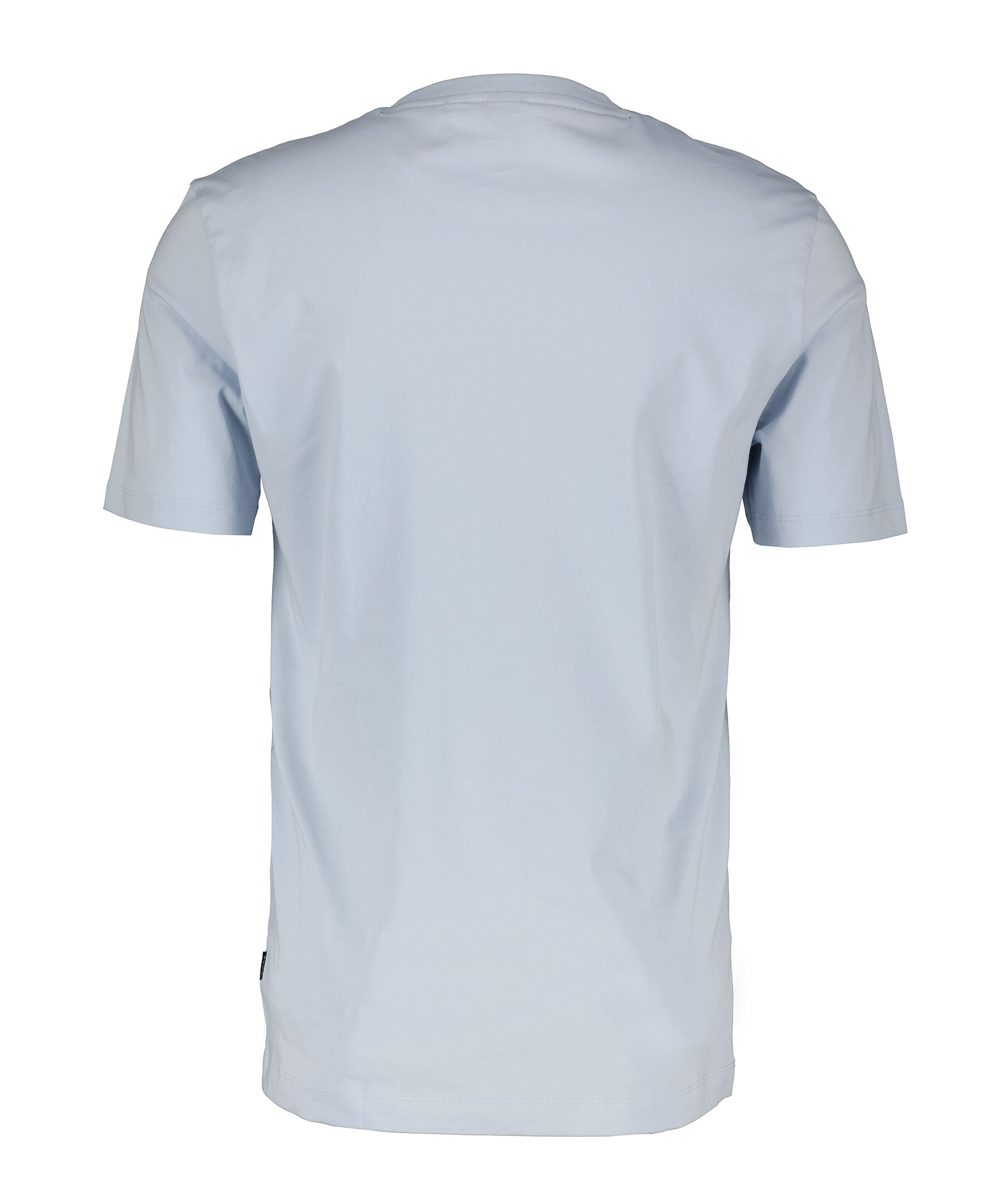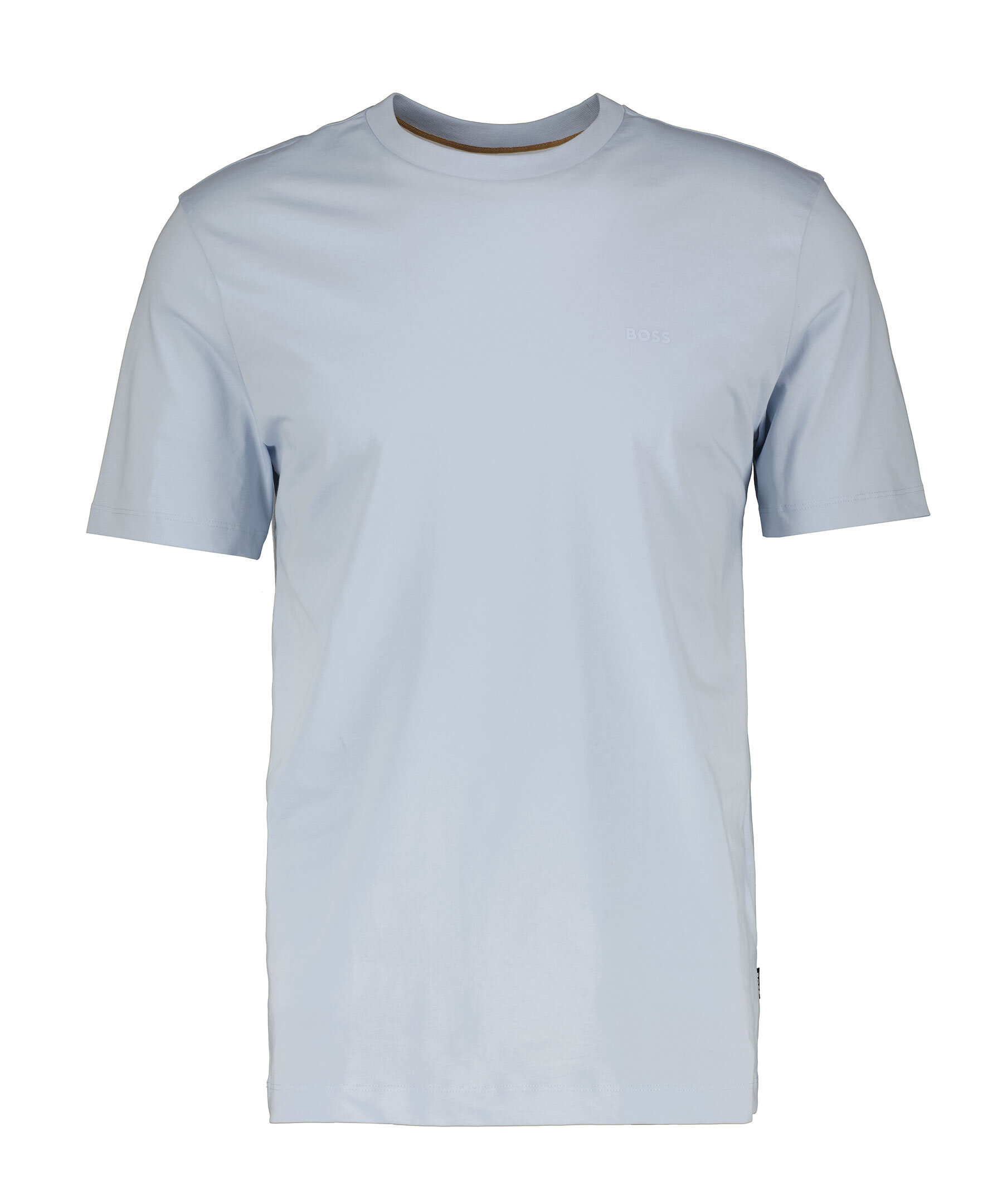 Ljusblå t-shirt från BOSS Black. Rundad halsringning. Gummerad logotyp på vänster bröst. Tillverkad i 100% bomull. Liten lapp med logotyp på vänster sida.