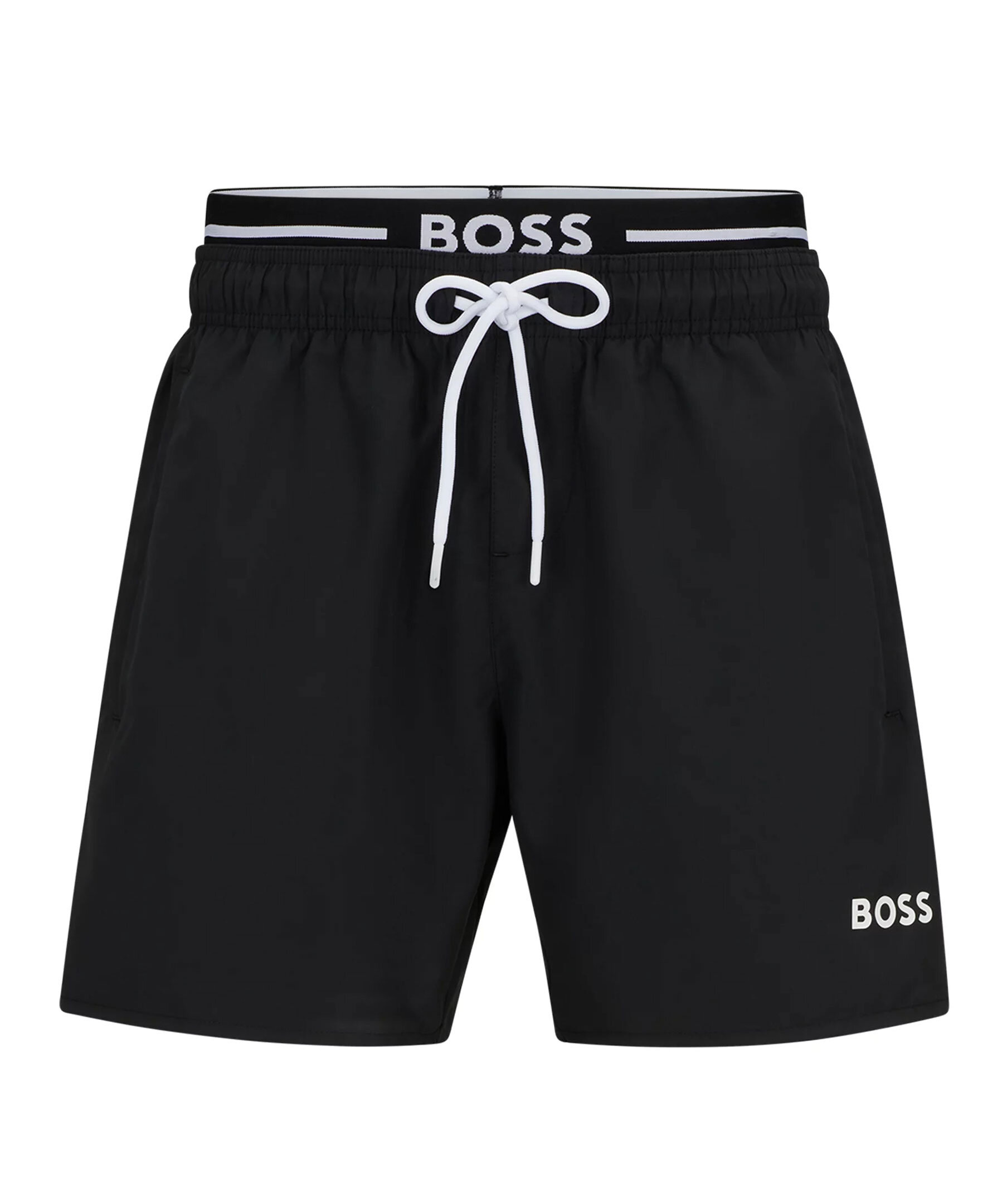 Svarta badbyxor från BOSS Black. Tillverkade i 100% polyester. Dragsko och resår i midjan. Tryckt logotyp i svart på vänster lår. Två fickor framtill, en bakficka med kardborre.
