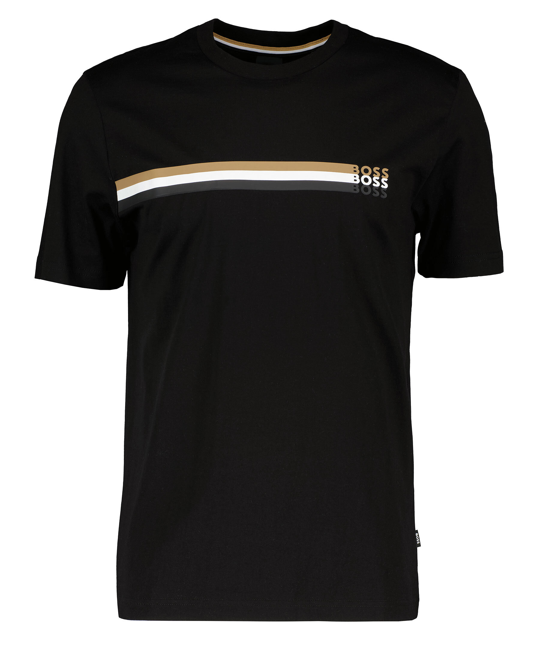 Svart T-shirt från BOSS Black. Gummerade ränder och logotyp i guld, svart och vitt över bröstet. Rundad halsringning. Tillverkad i 100% bomull.