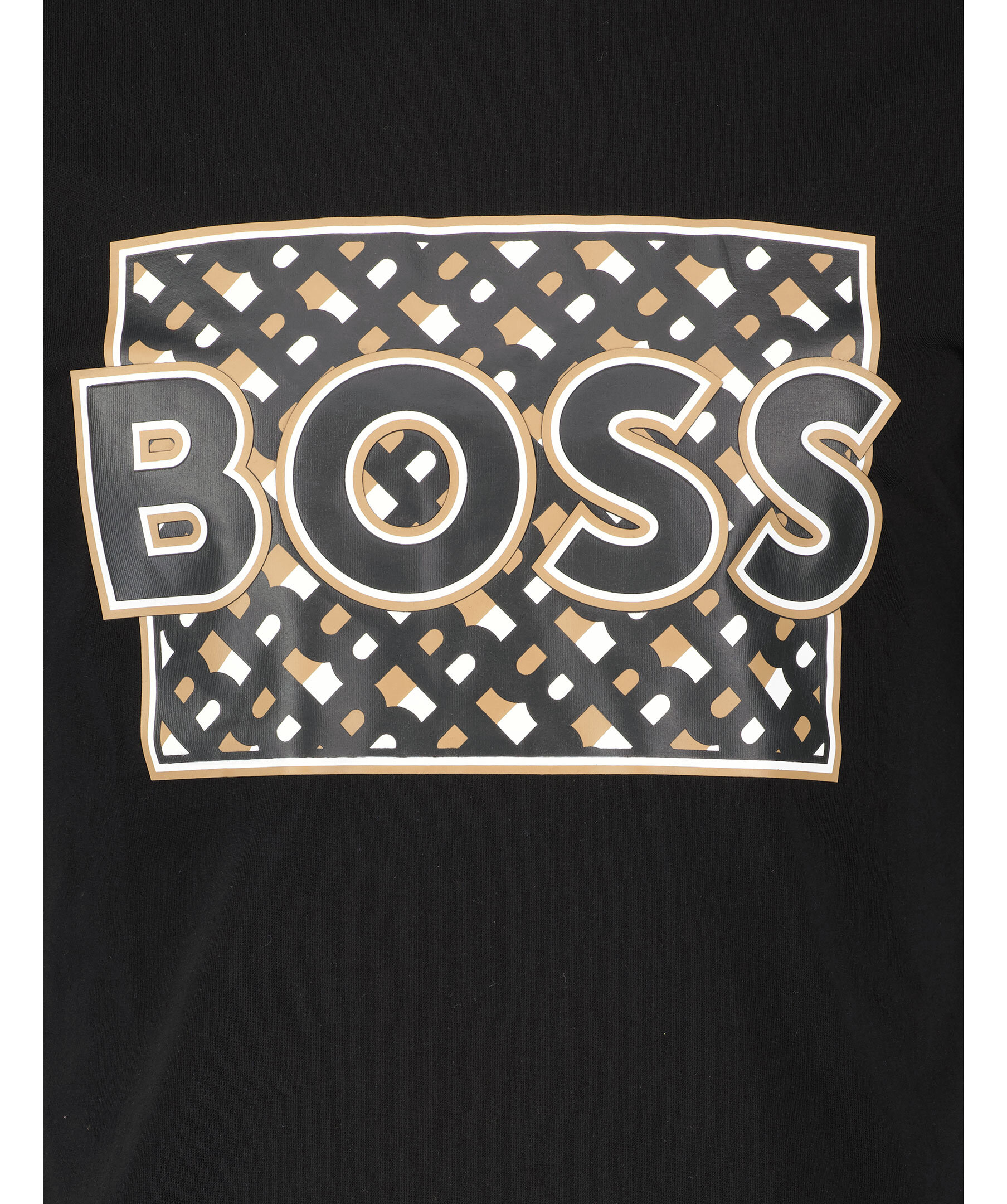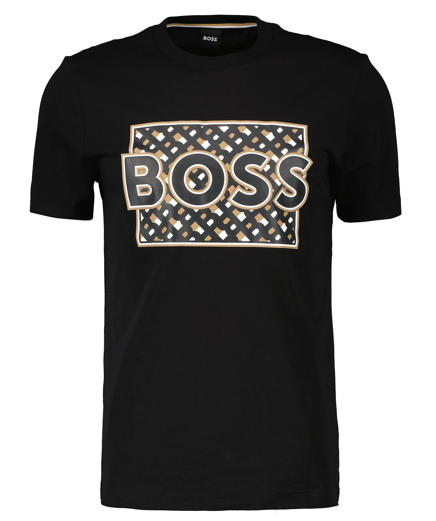Svart t-shirt från BOSS Black. Gummerad logotyp med monogrammönster i vitt och beige över bröstet. Rundad halsringning. Tillverkad i 100% bomull.