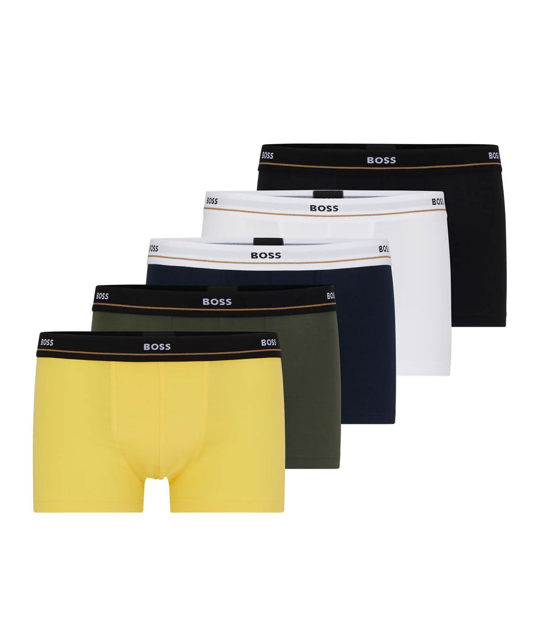 Fem par bekväma kalsonger från BOSS Black. Tillverkad i stretchig bomull. Logga i midjeband och kamelränder. Kommer i svart, vitt, marinblått, militärgrönt samt gult.