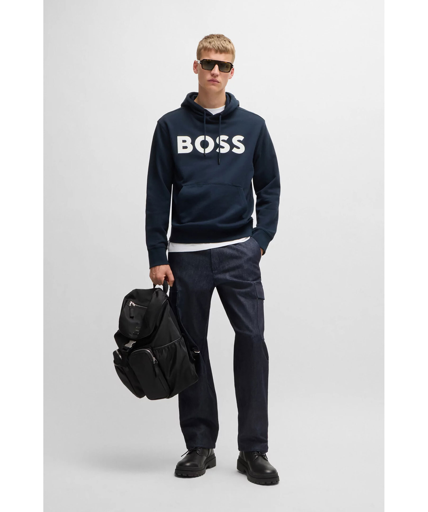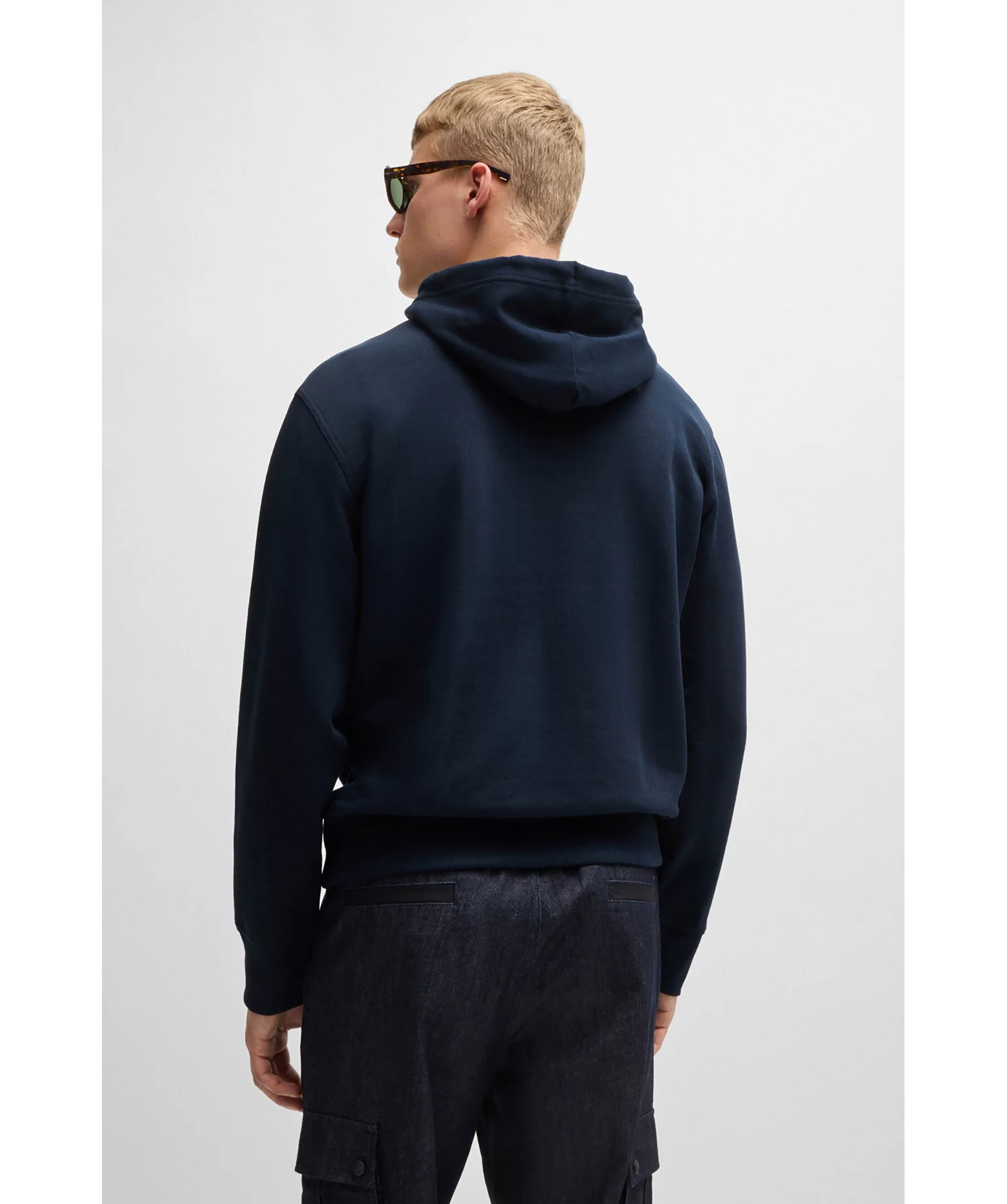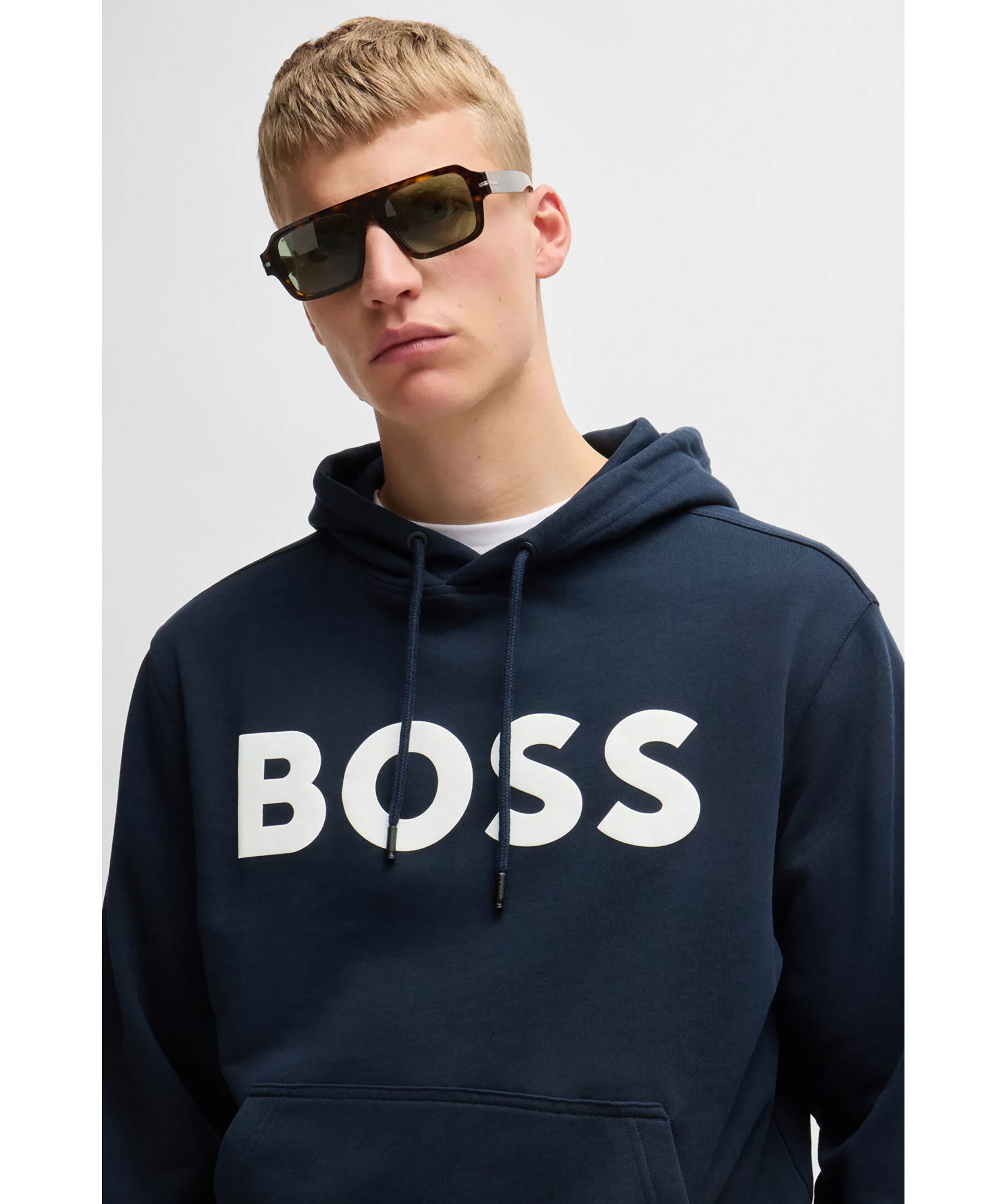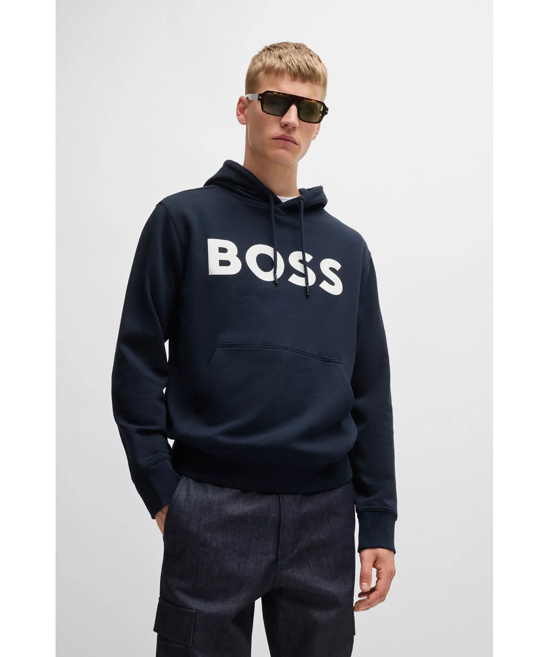 Mörkblå hoodie från BOSS Orange. Hoodien har en stor kontrastlogga på bröstet, huva med dragsko och känguruficka fram. Mudd vid ärm- och tröjavslut. Tillverkad av 100% bomull.