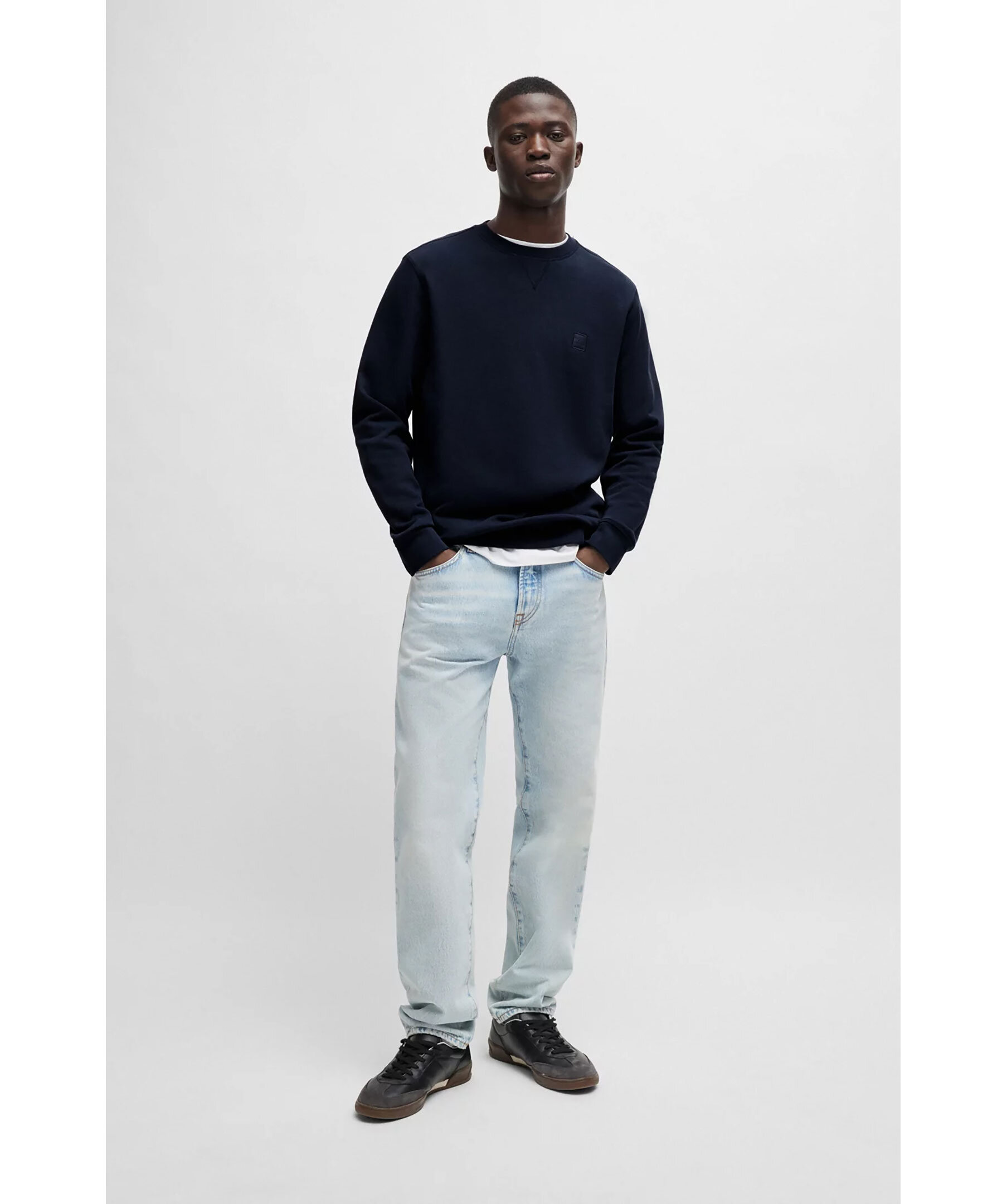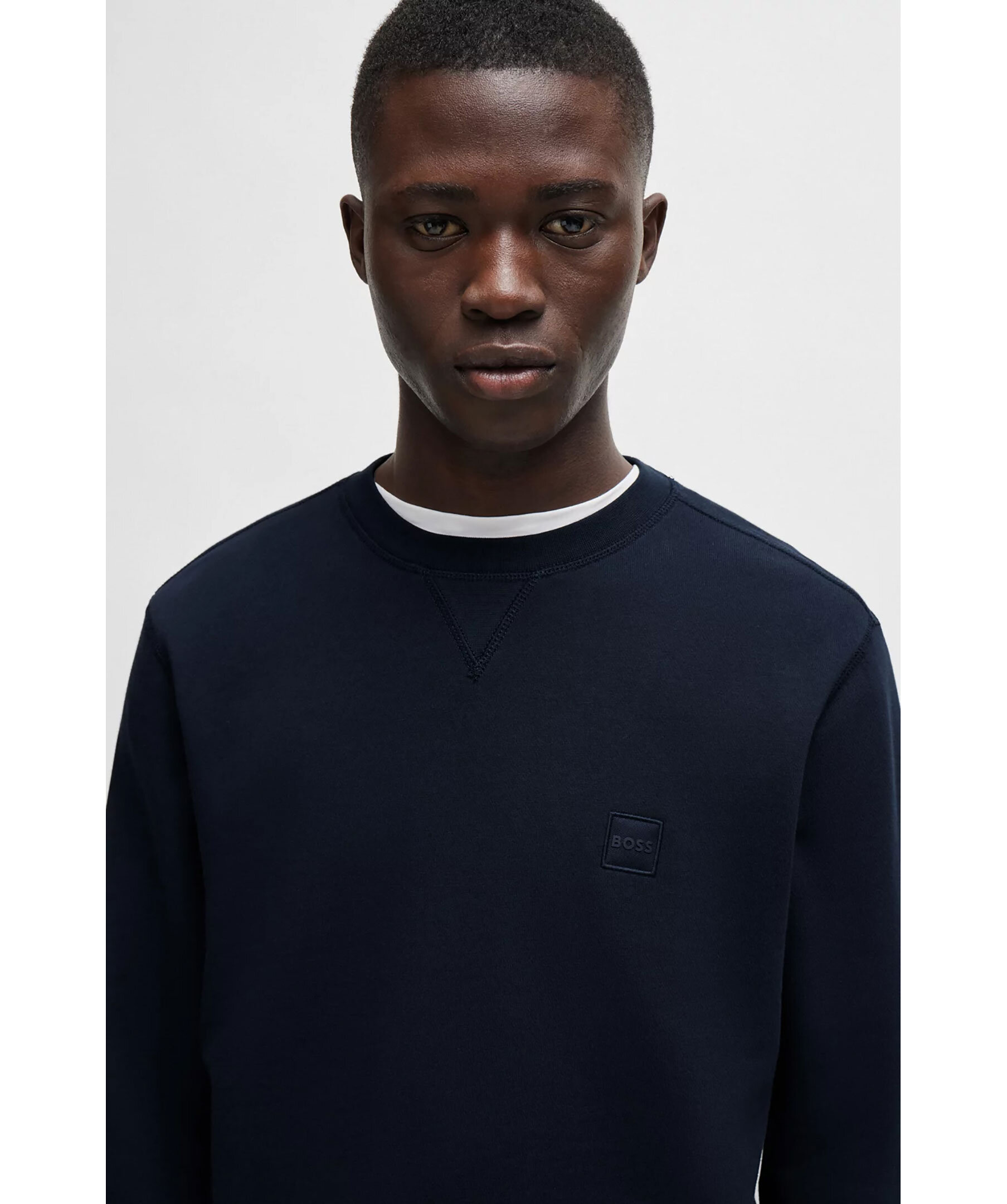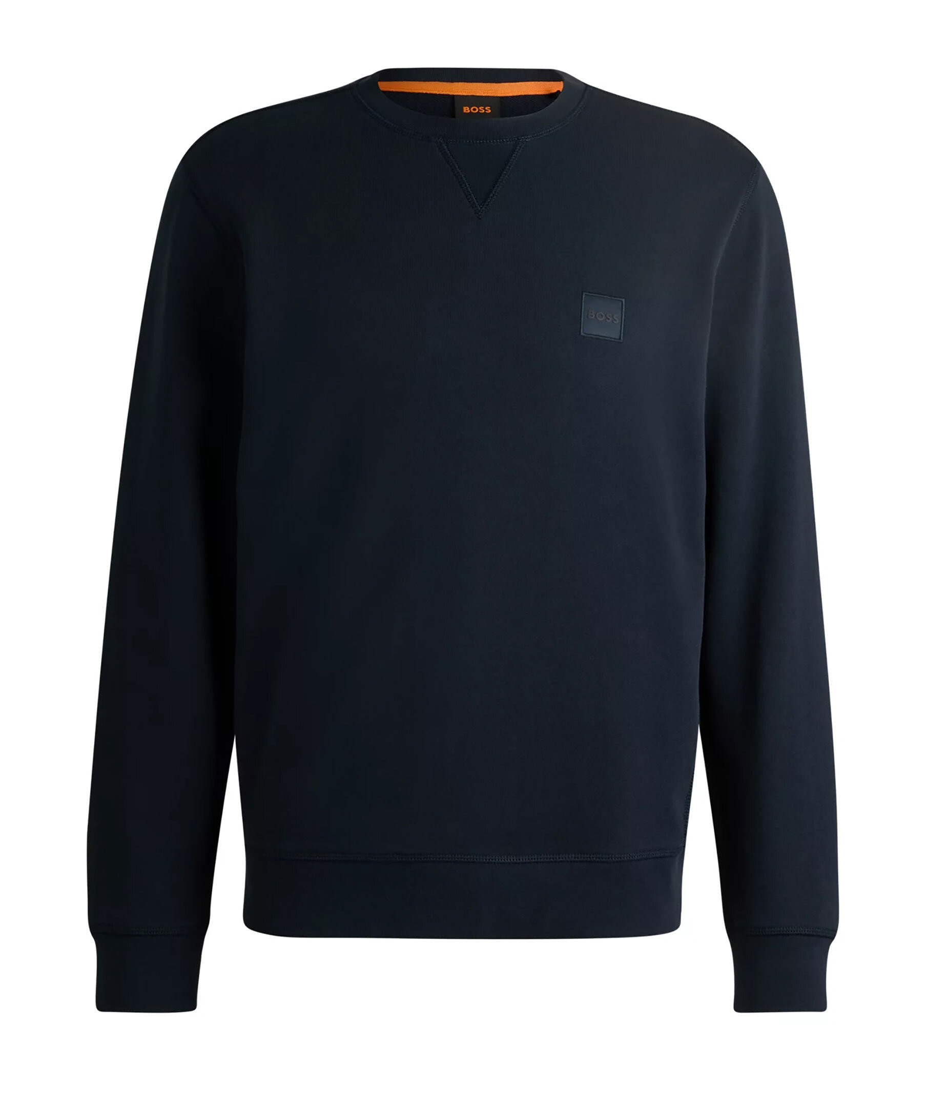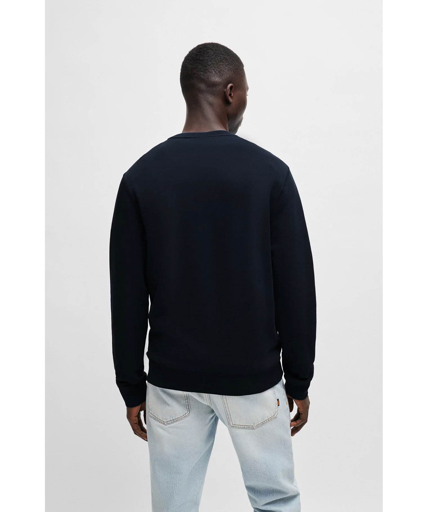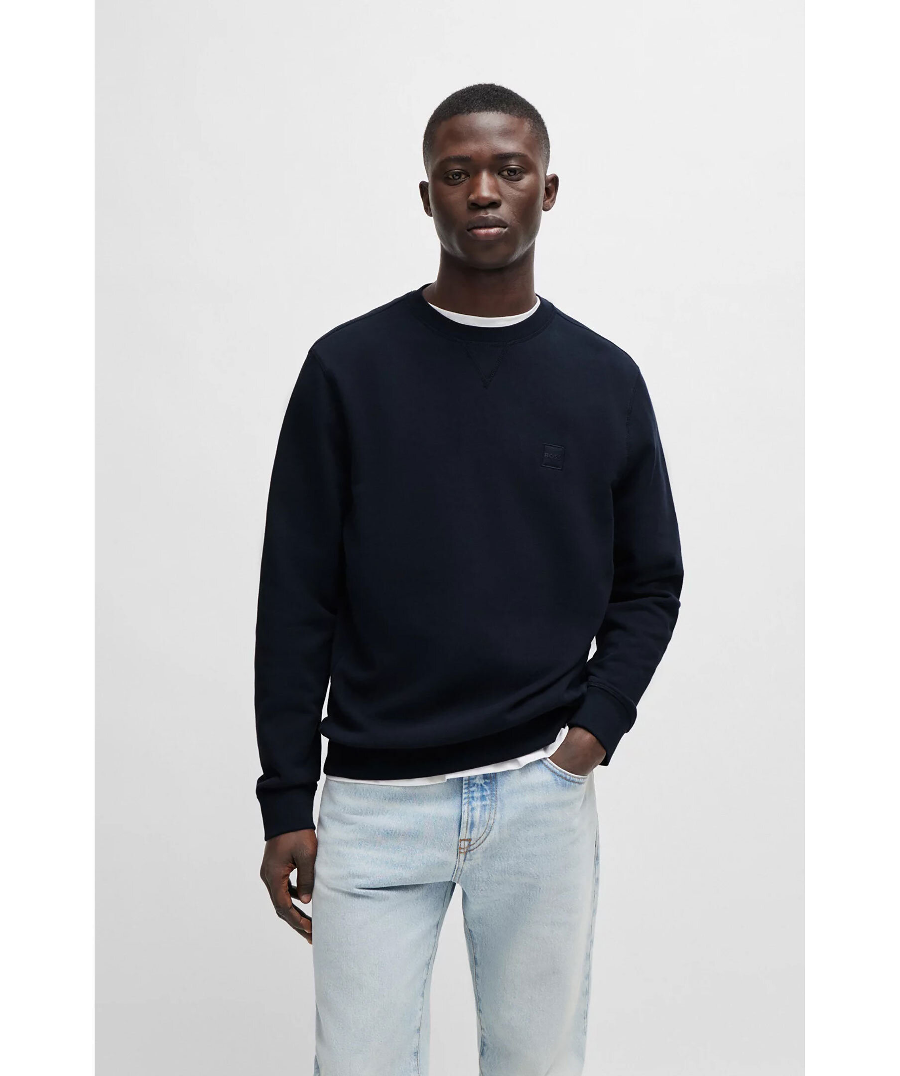 Mörkblå sweatshirt från BOSS. Sweatshirten har rund och ribbstickad halsringning, ribbstickade muddar vid ärm- och plaggslut samt logotyp-patch på bröstet. Tillverkad i bomull.