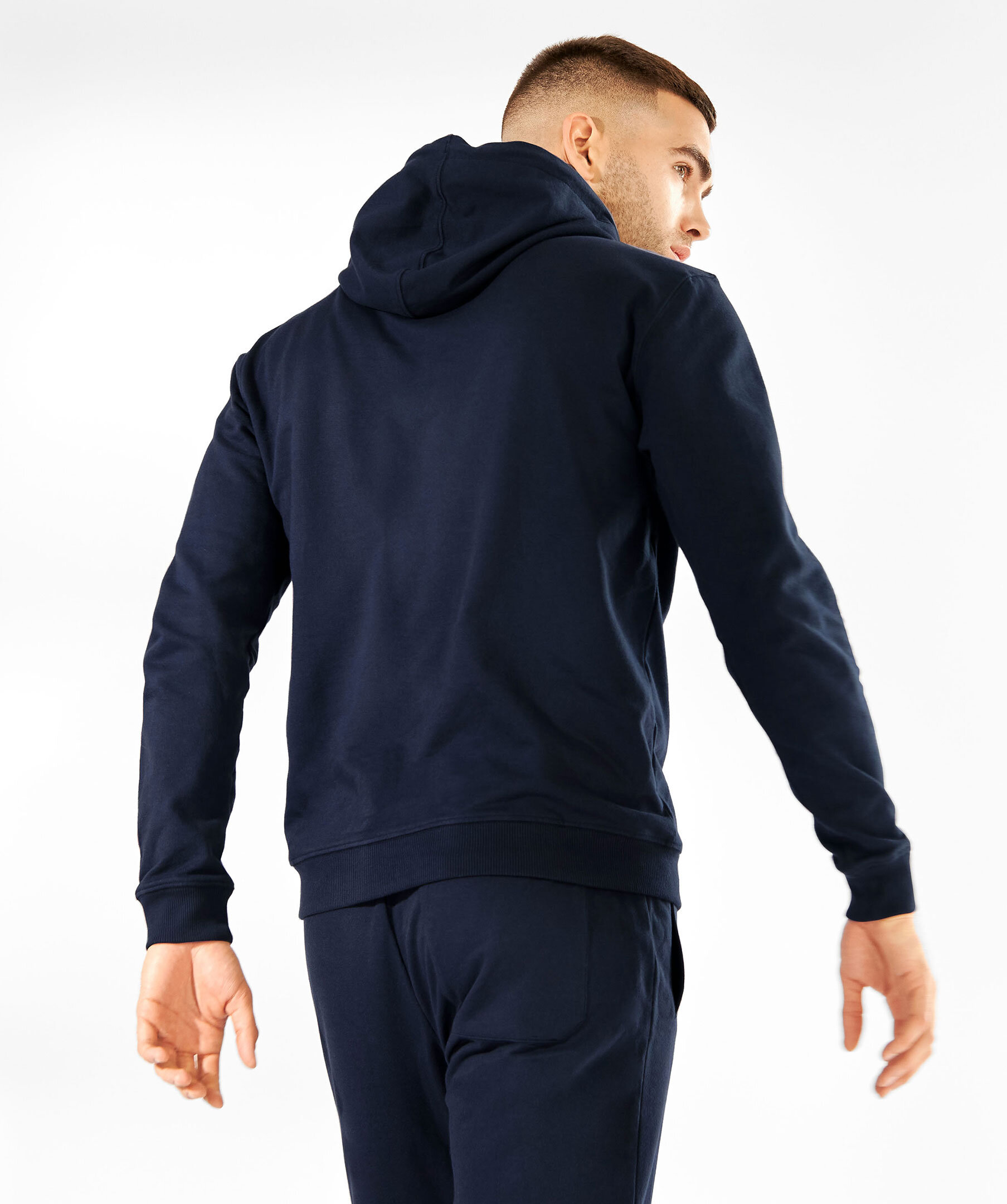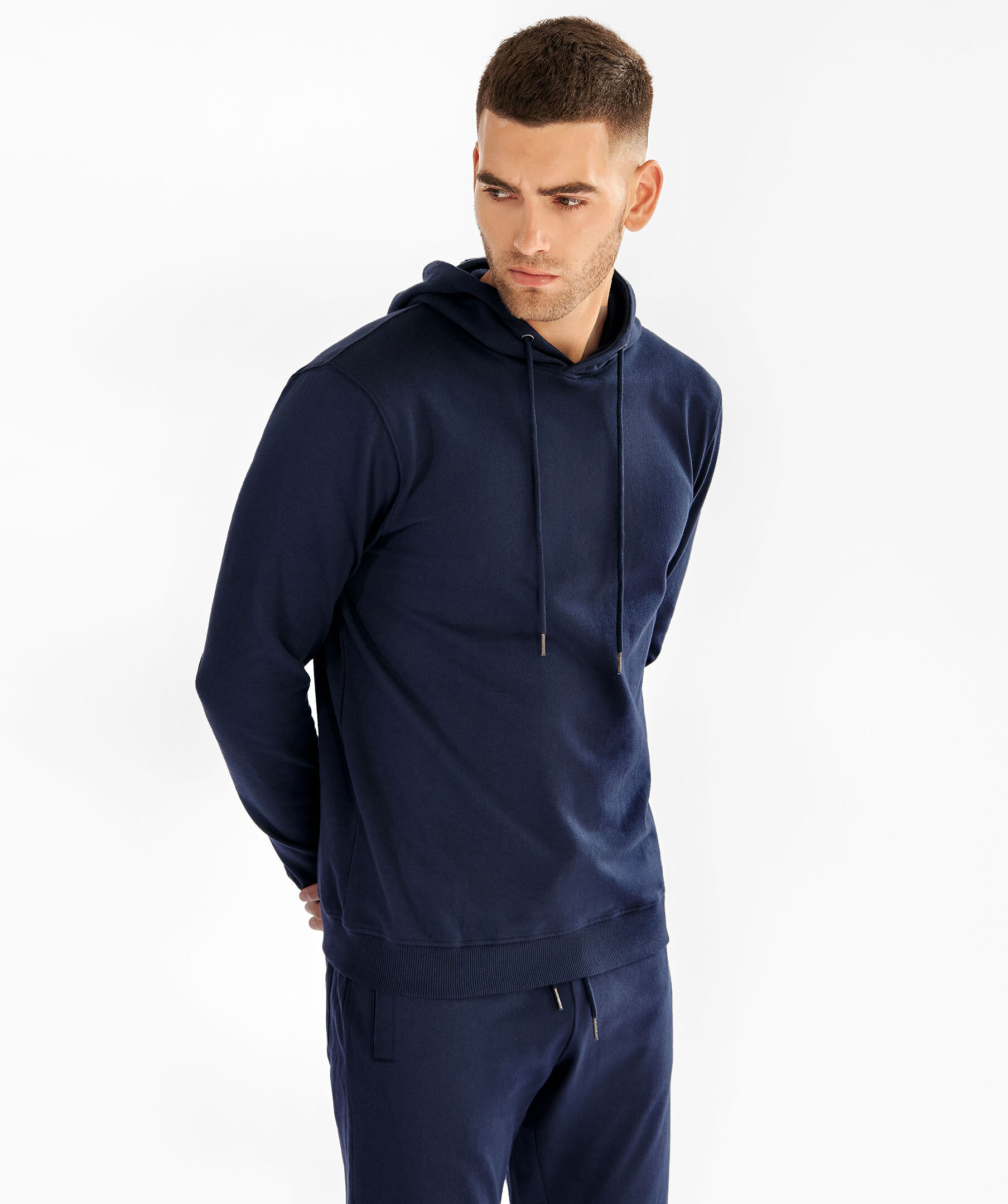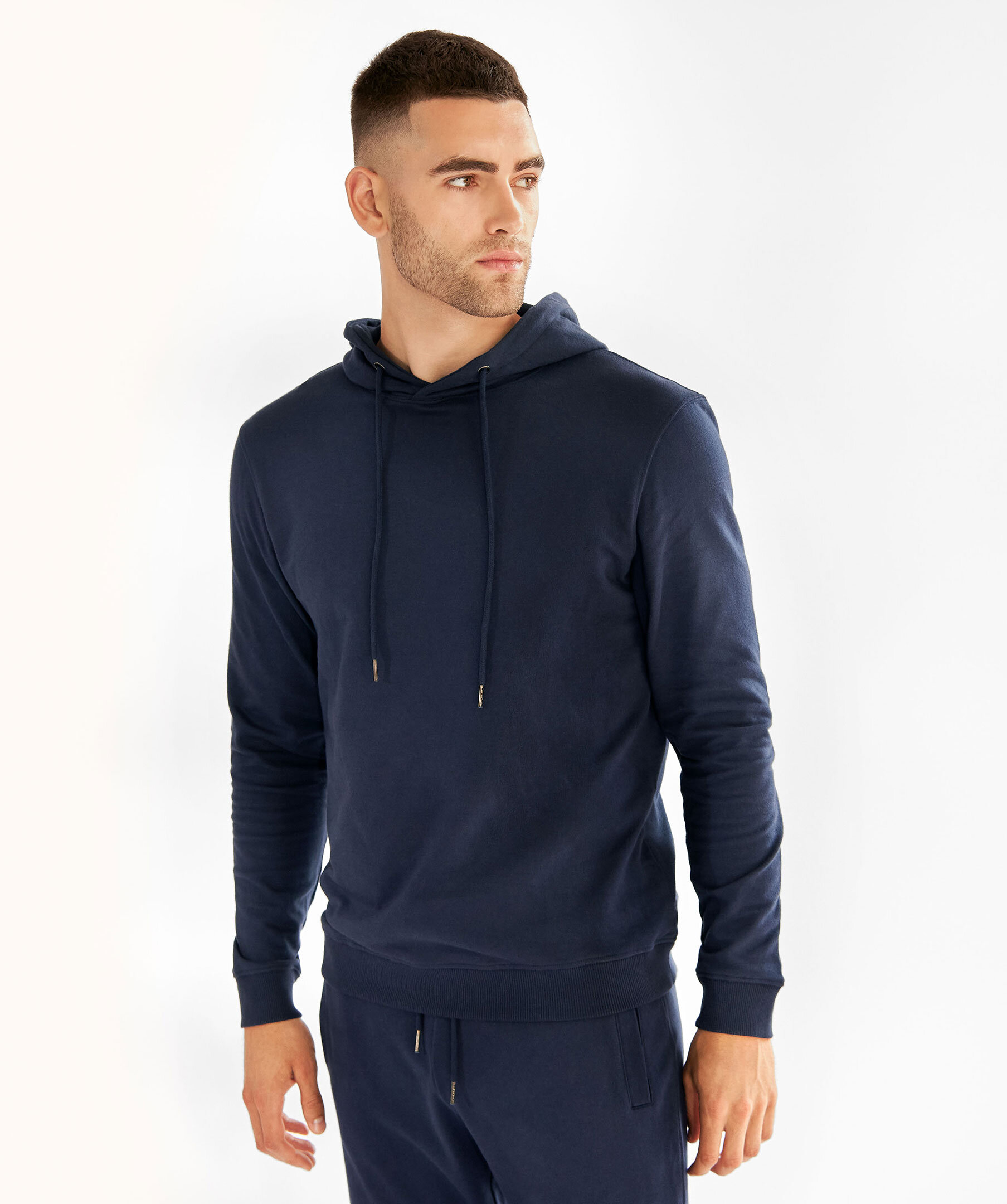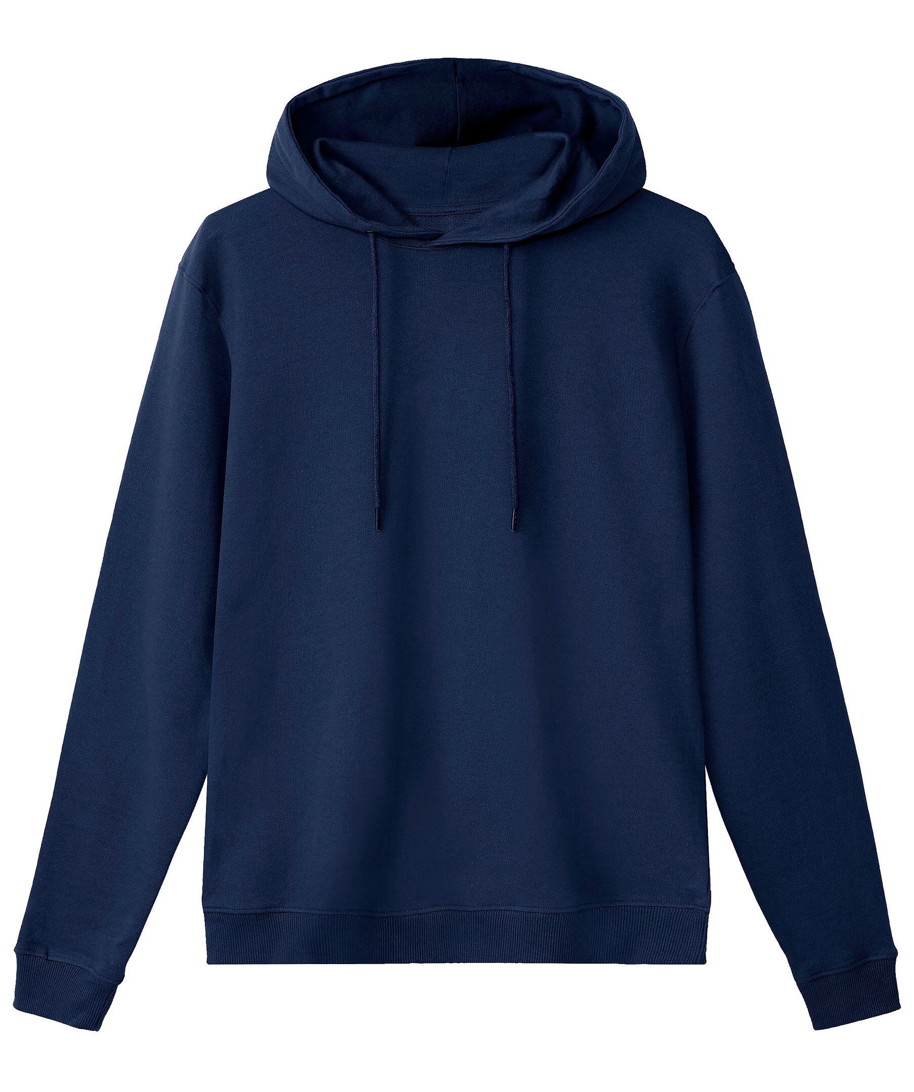 Marinblå hoodie från Bread & Boxers. Tillverkad i 100% mjuk ekologisk bomull, muddar i ärmslut och snören i luvan.