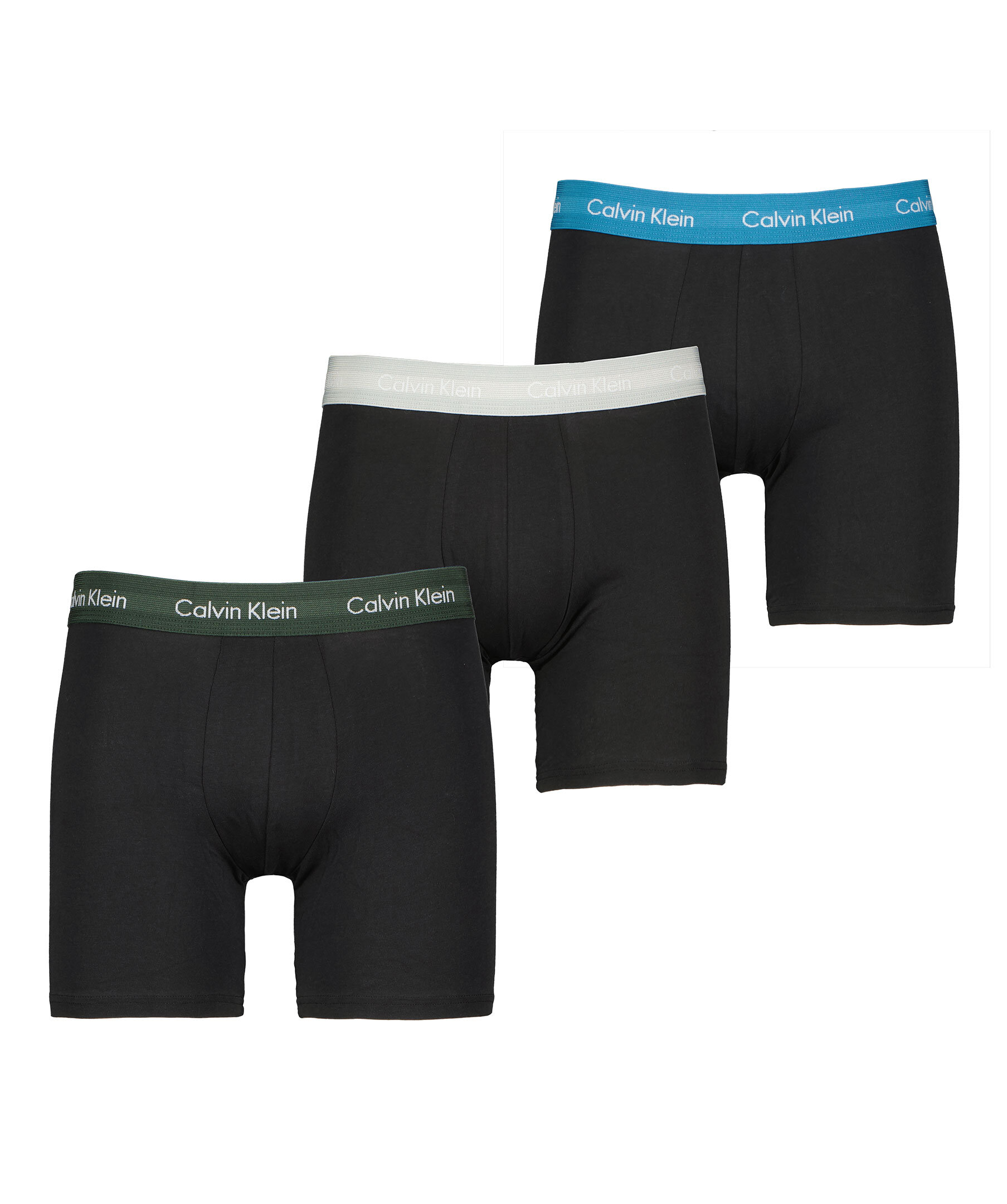 3-pack kalsonger från Calvin Klein. Kommer i svart med olika färger på resårerna i mörkgrön, blå och ljusgrå. Tillverkade i stretchig bomull.