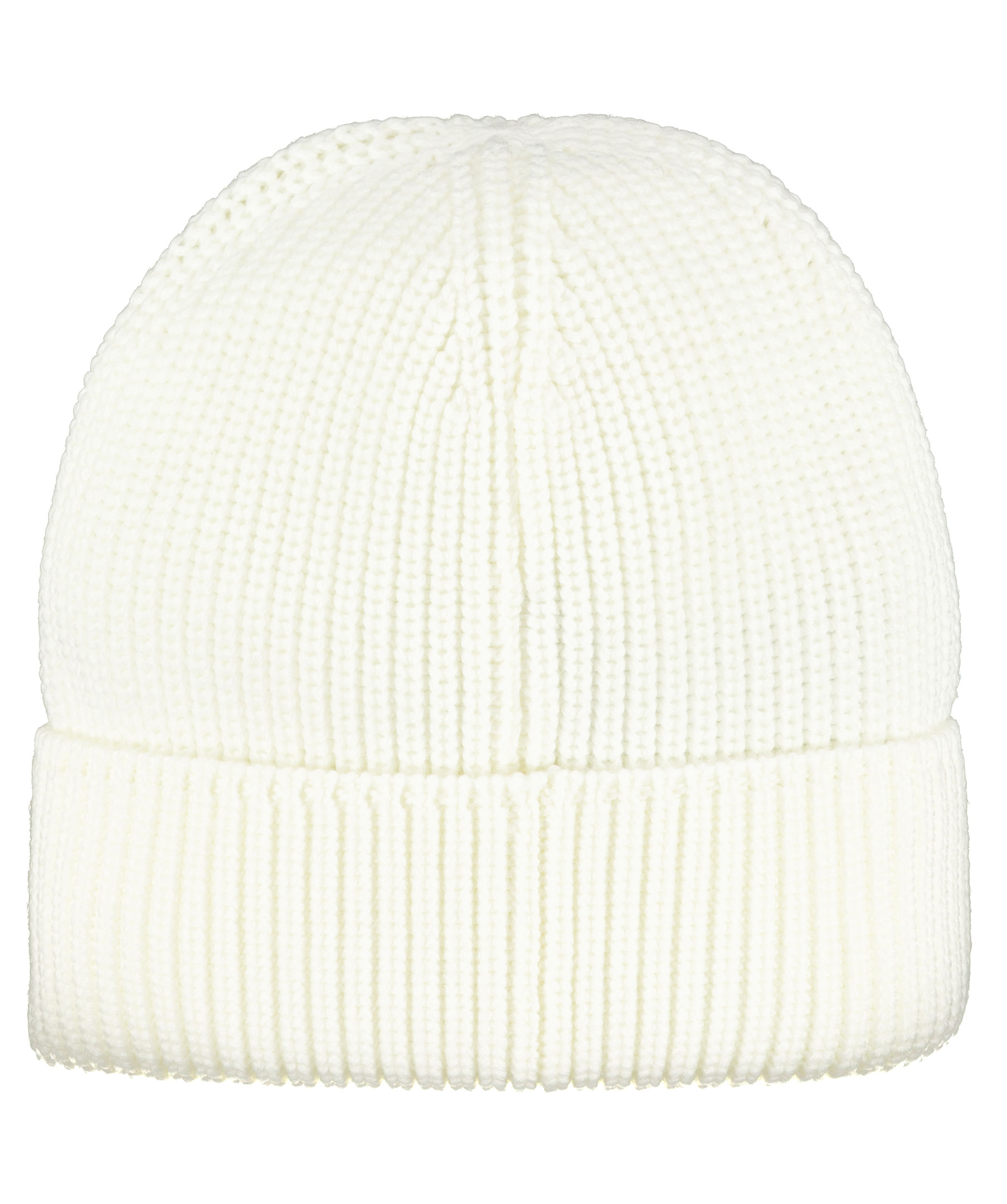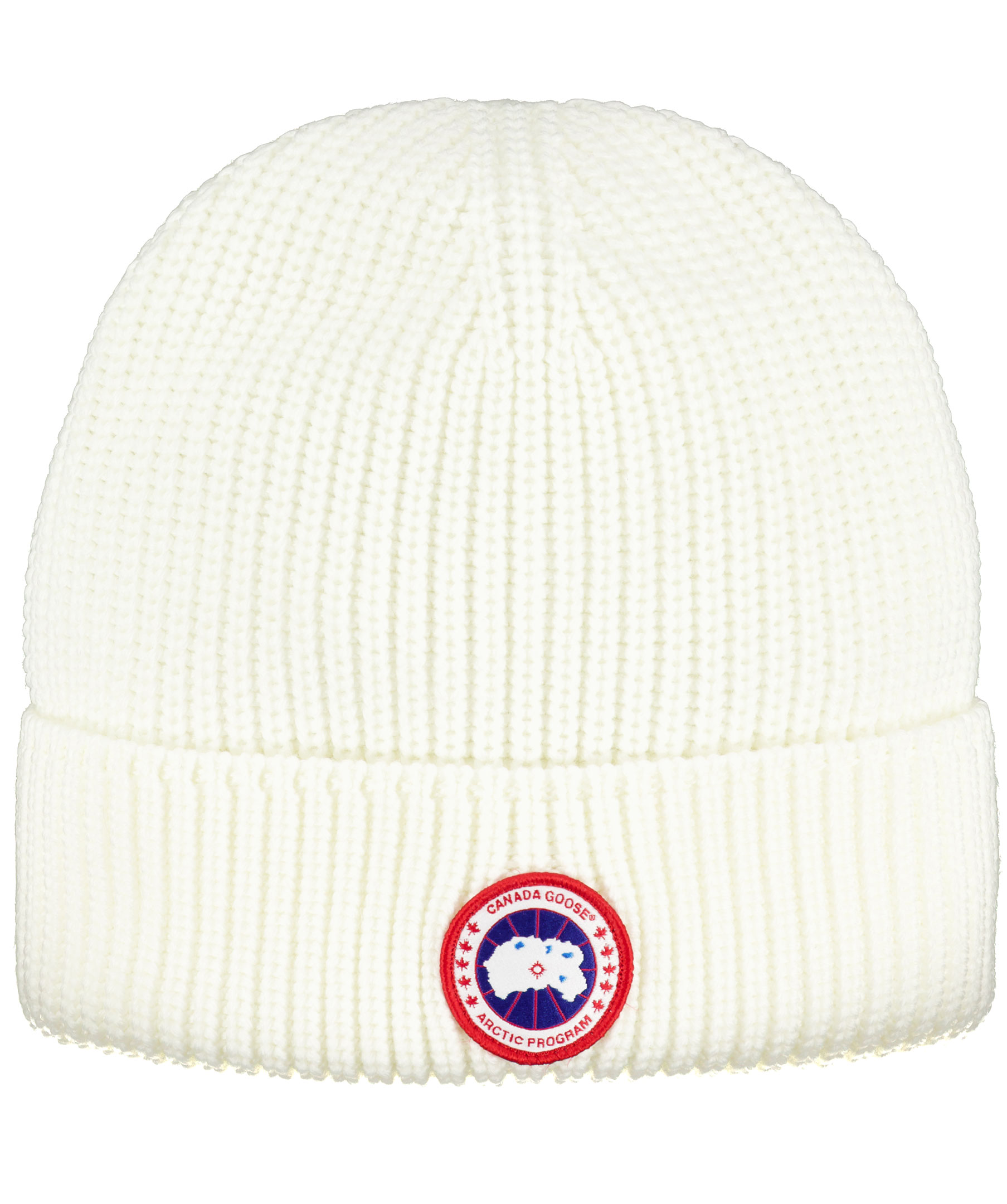 Vit ribbstickad mössa från Canada Goose. Broderad logga fram, uppvikt kant. Tillverkad i 100% ull.