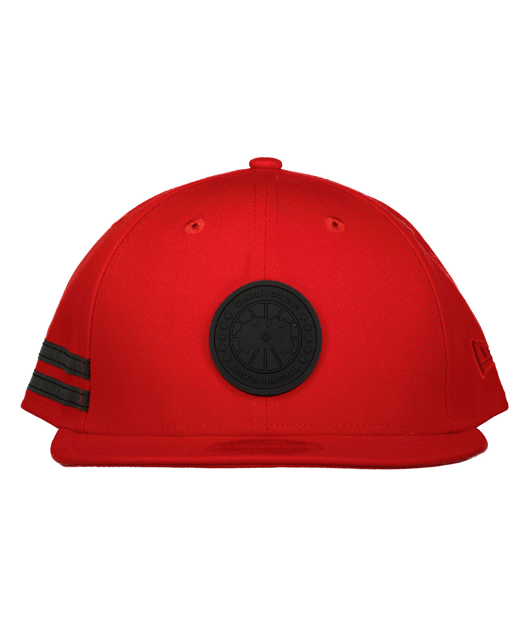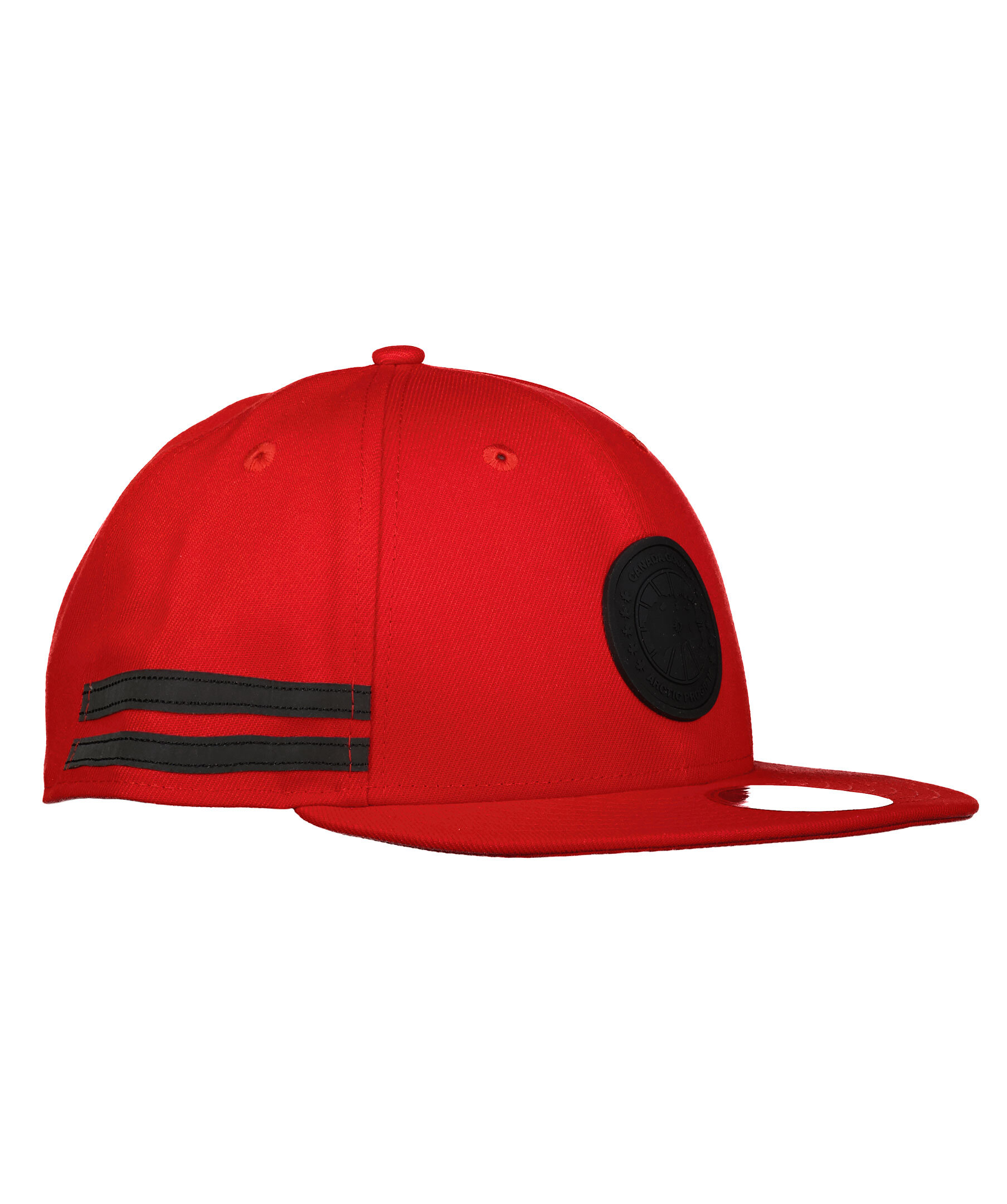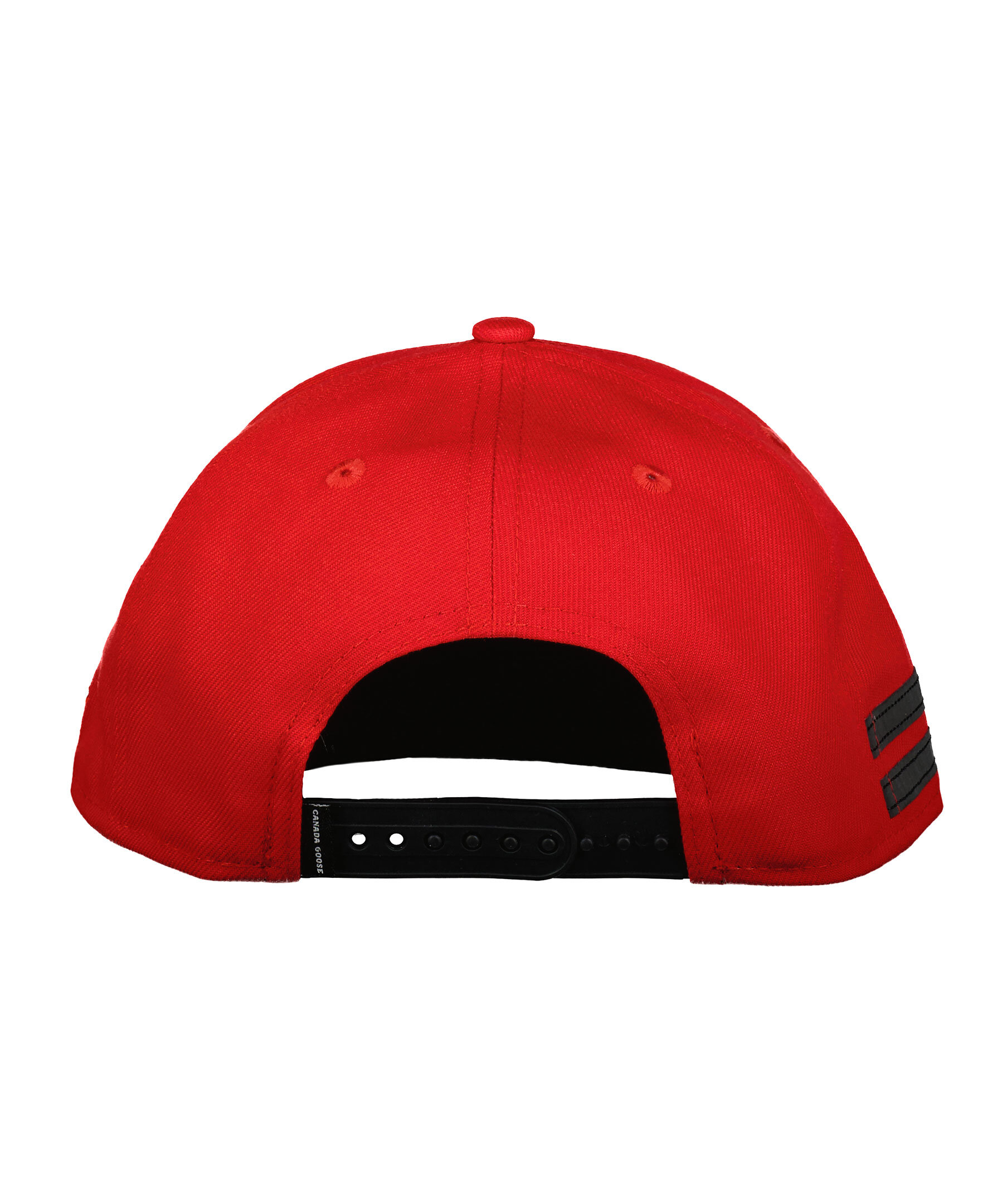 Röd keps från Canada Goose i polyester. Stor, logotyp i svart gummi fram. Kepsens skärm är rak och det går att justera kepsen baktill med spänne i plast.