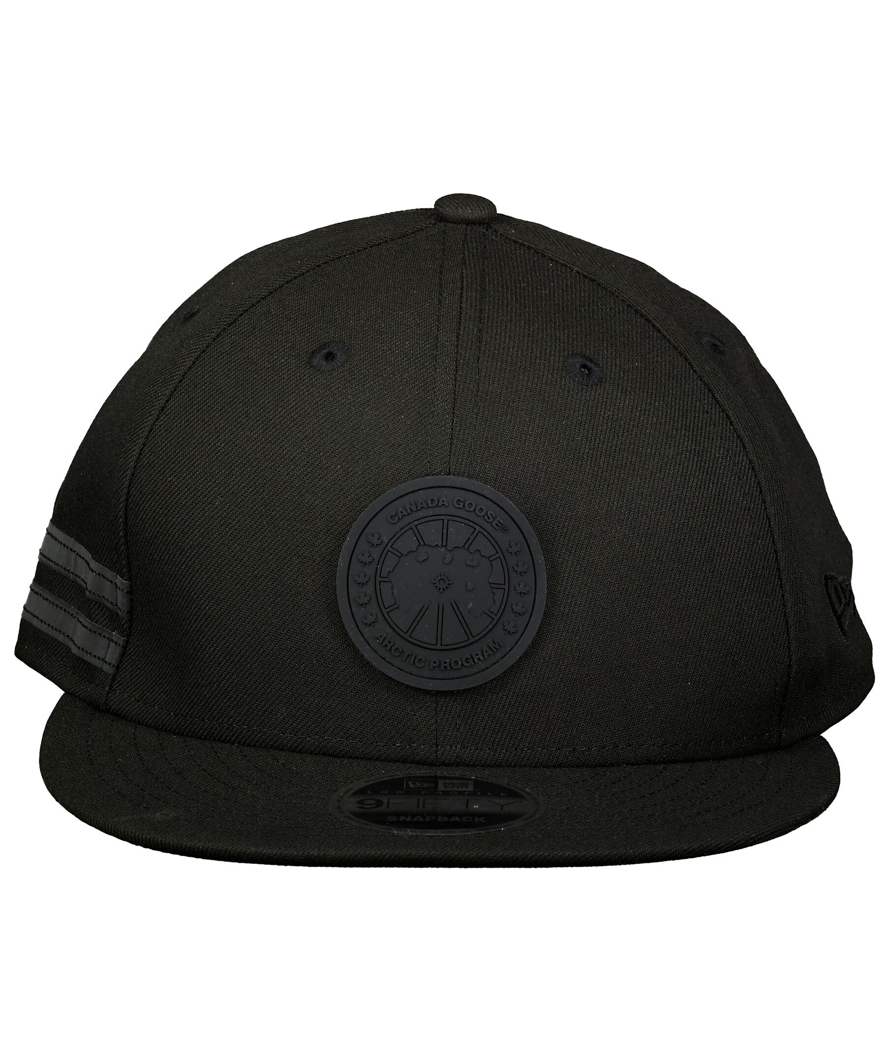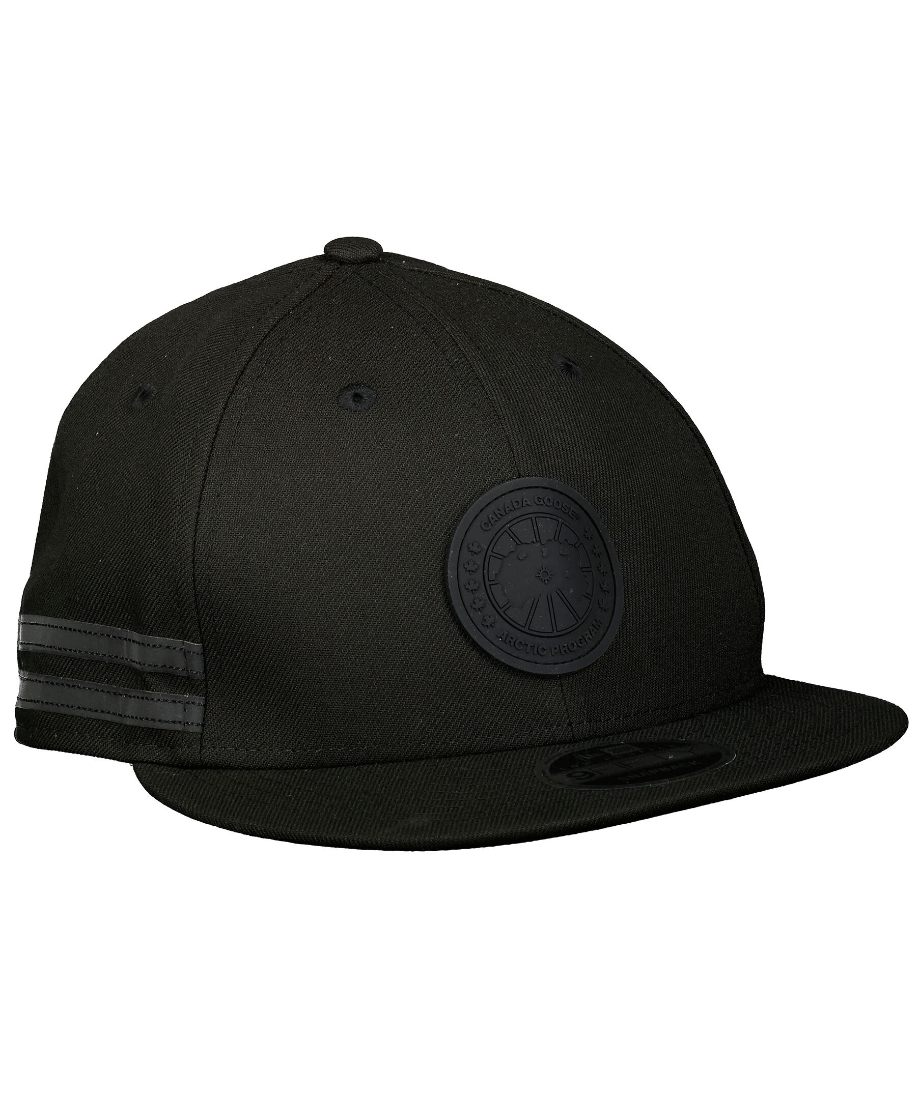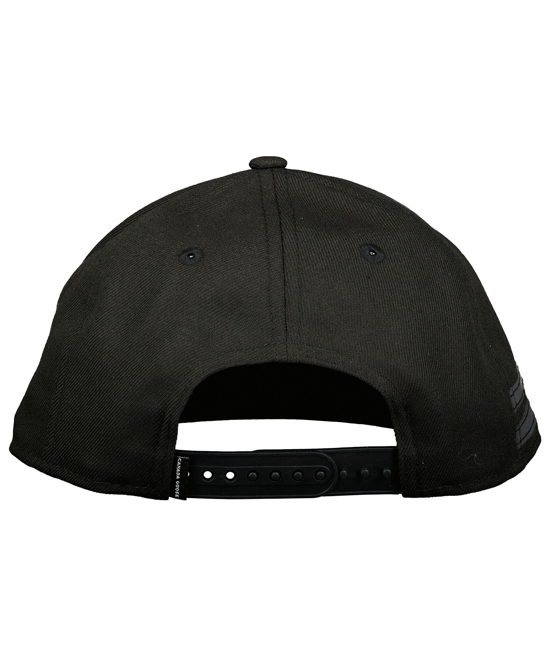 Svart keps från Canada Goose i polyester. Stor, logotyp i svart gummi fram. Kepsens skärm är rak och det går att justera kepsen baktill med spänne i plast.