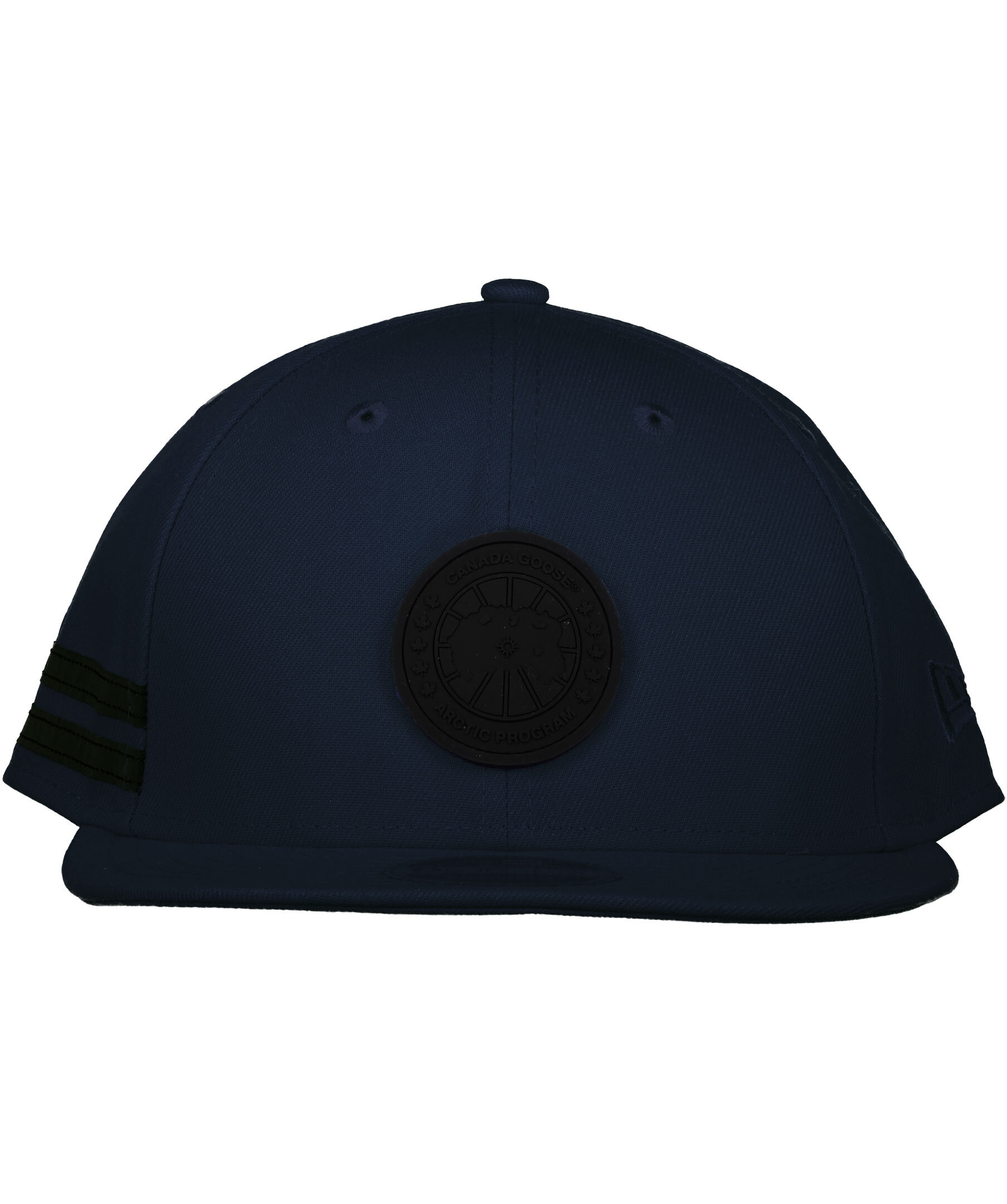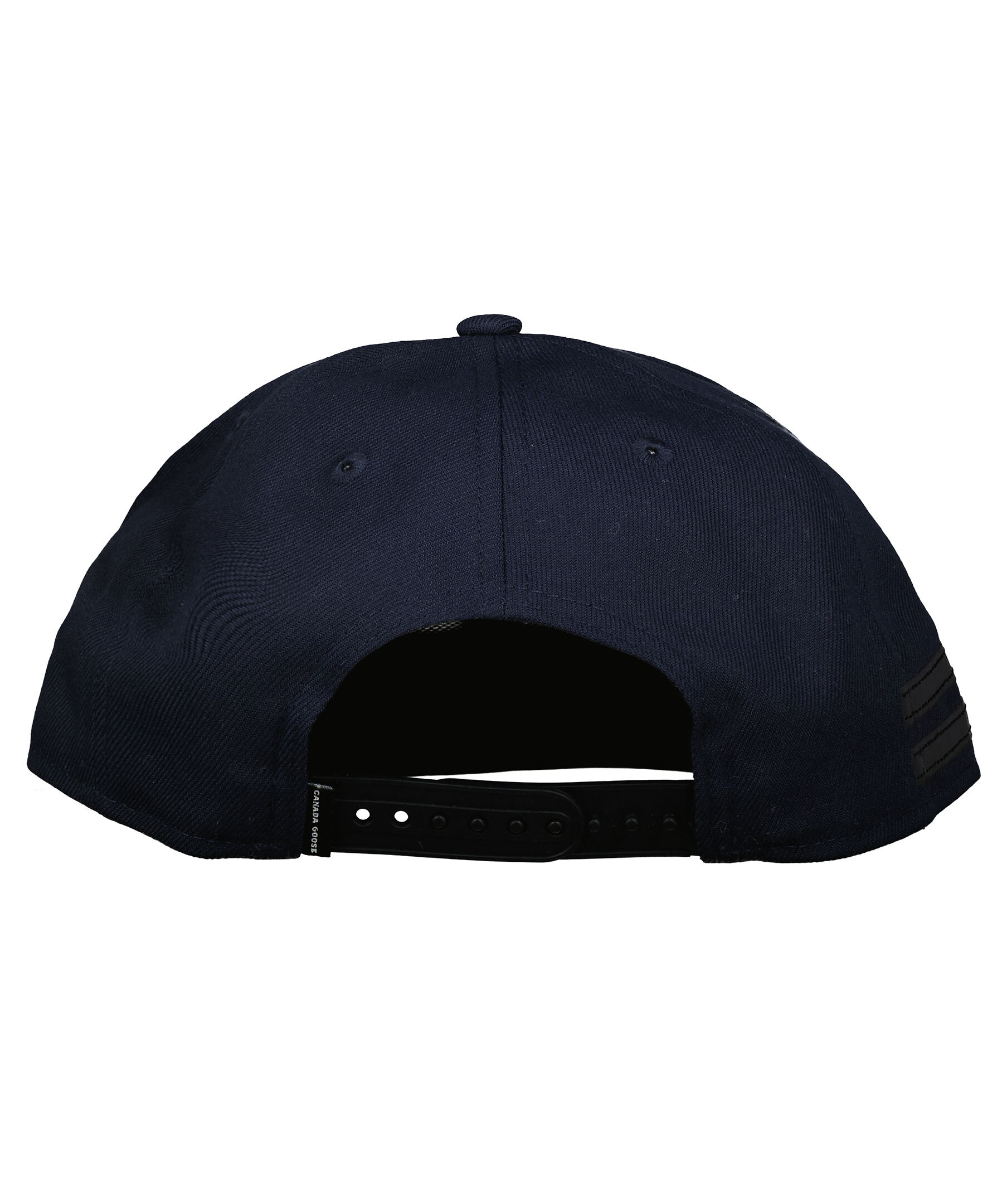 Mörkblå keps från Canada Goose i polyester. Stor, logotyp i svart gummi fram. Kepsens skärm är rak och det går att justera kepsen baktill med spänne i plast.