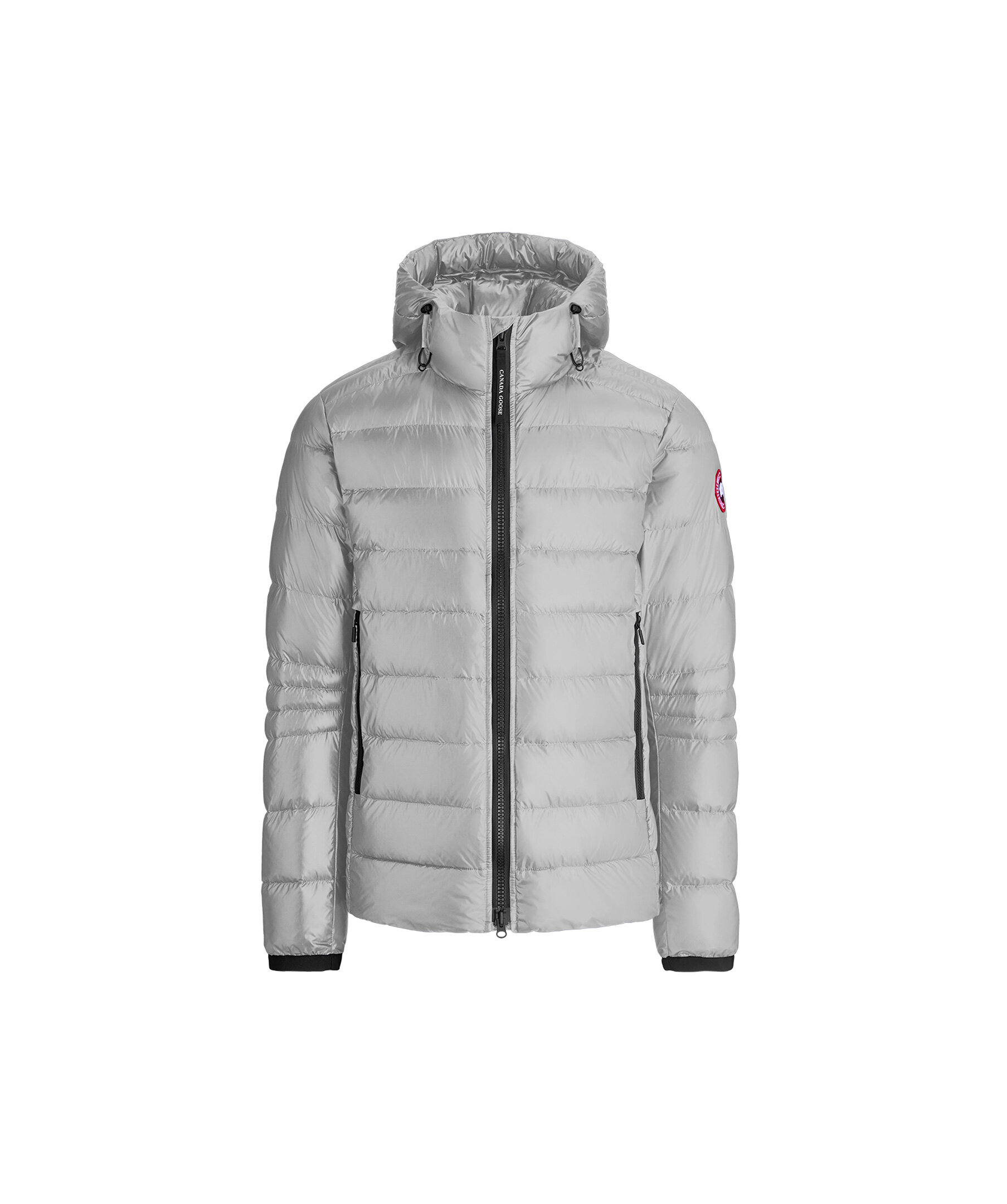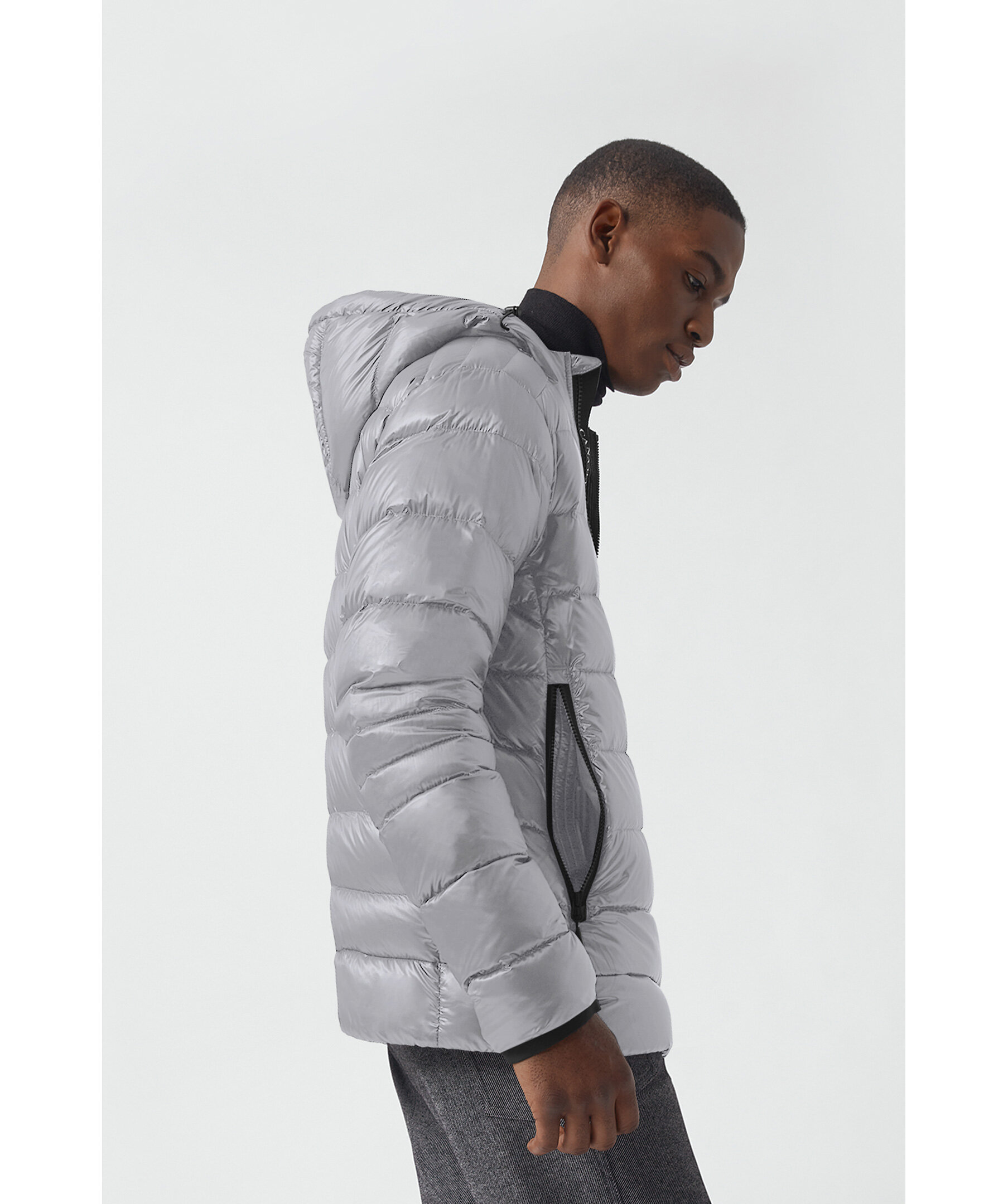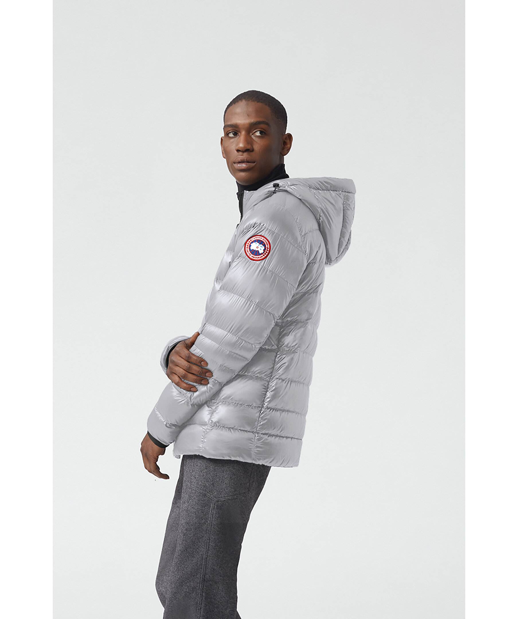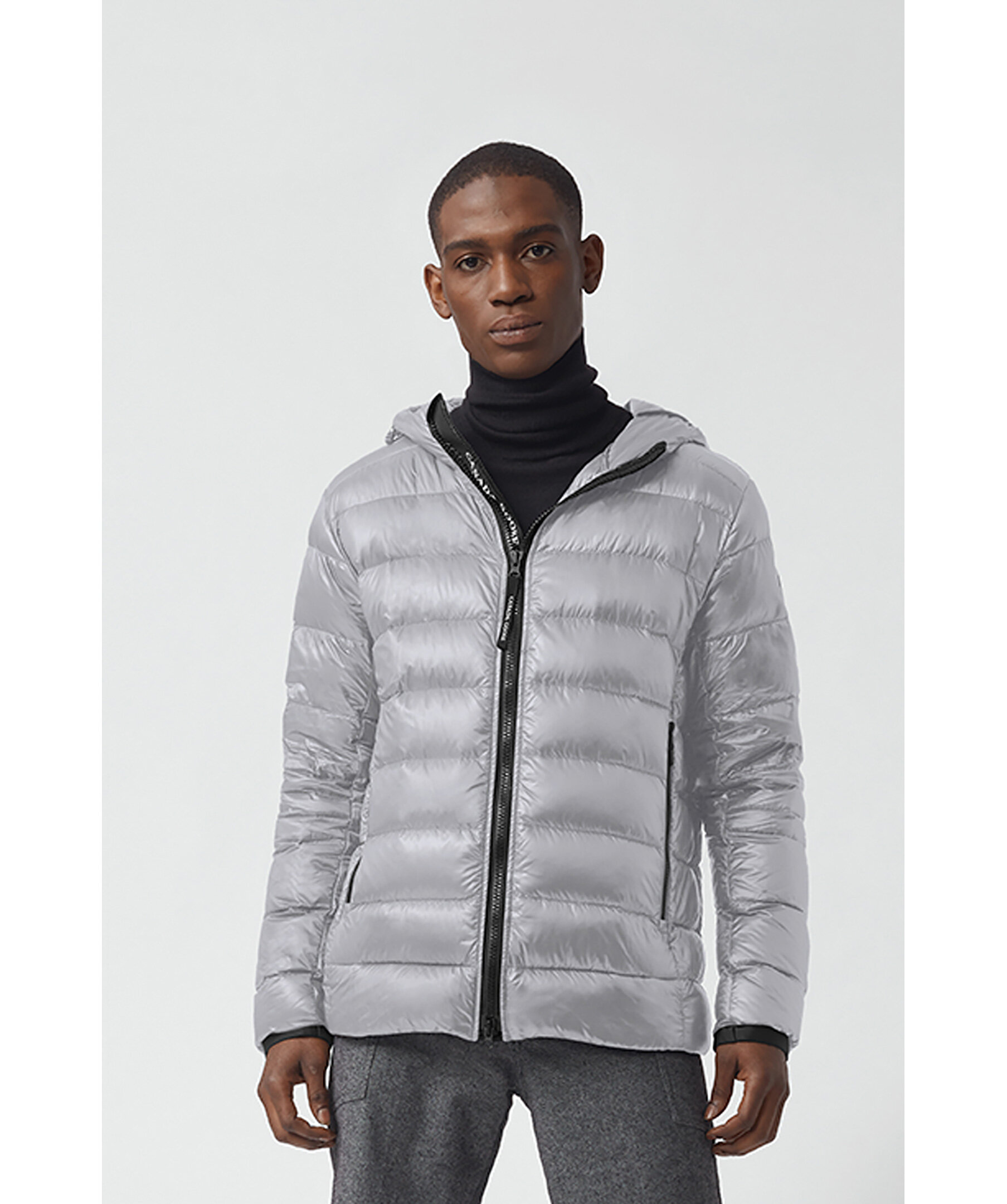 Grå lättviktsdunjacka med luva i en smal passform från Canada Goose. Jackan är vind och vattenavvisande. Två framfickor och två innerfickor. Smal elastiskt mudd vid ärmslut. Tygpatch med logotyp på vänster ärm. Dragsko vid plaggslut och luva. Stängs med en tvåvägsdragkedja och går att packa ihop lätt.