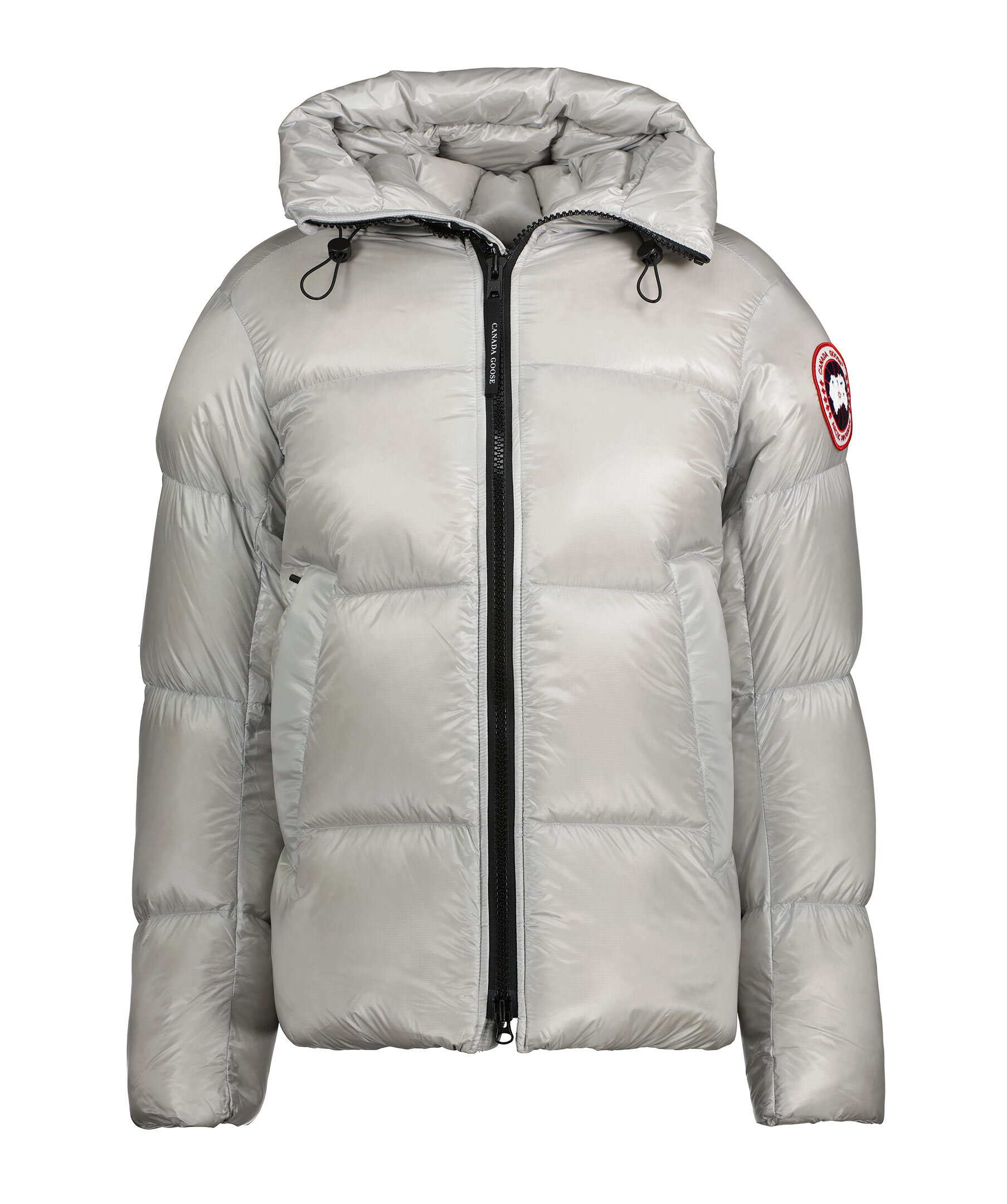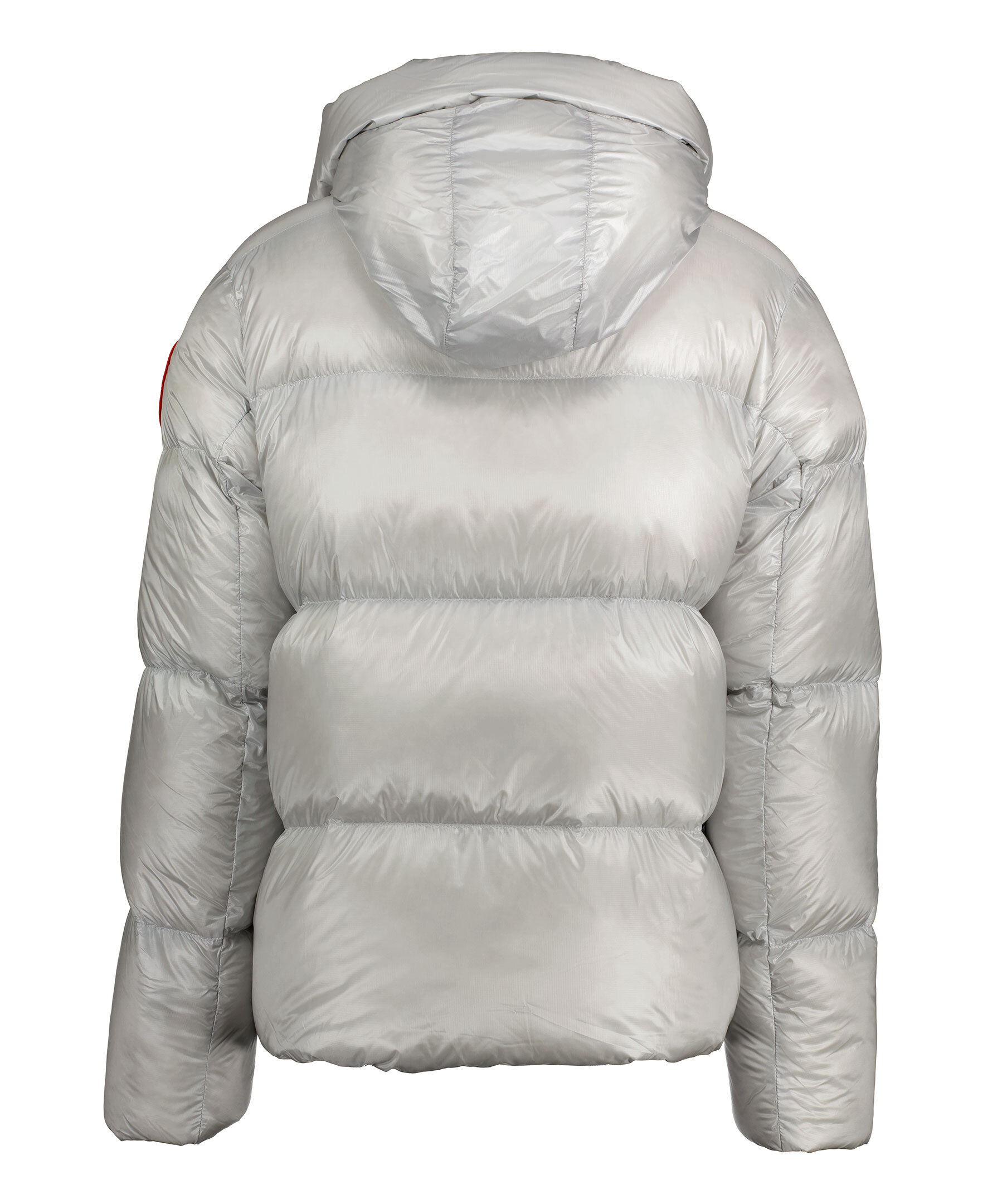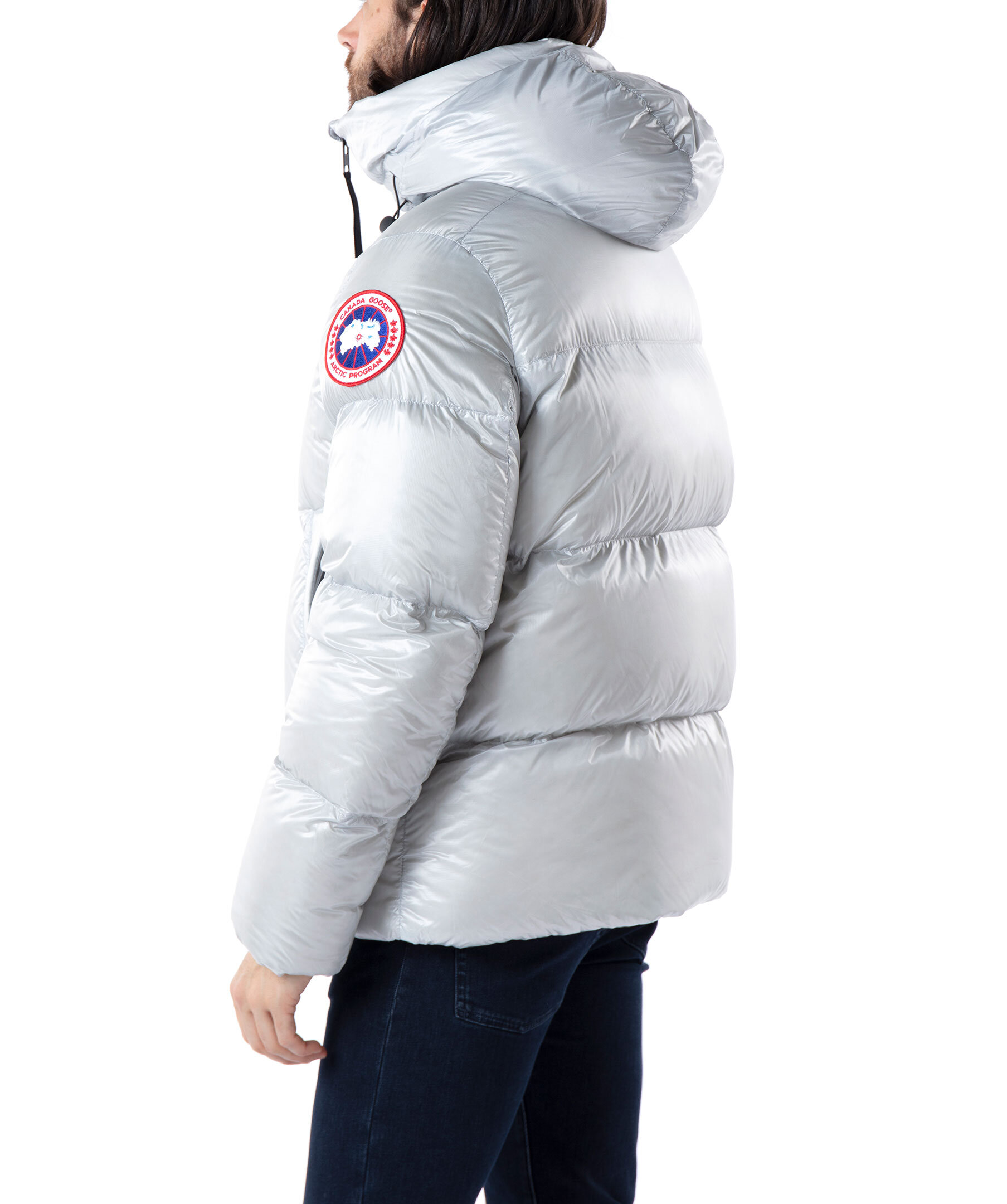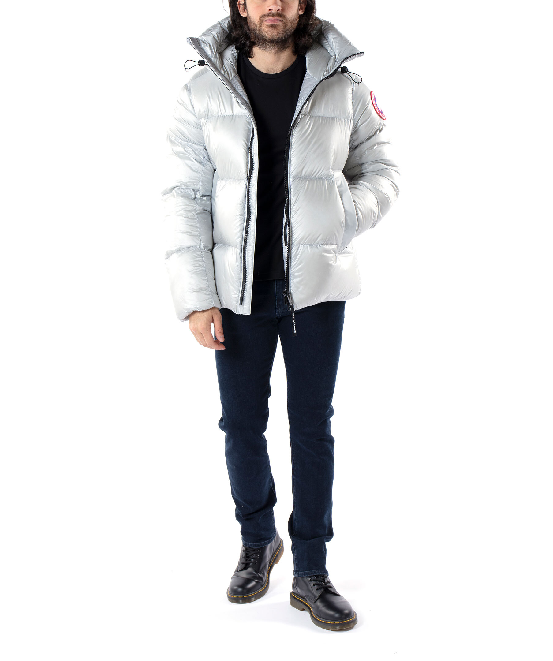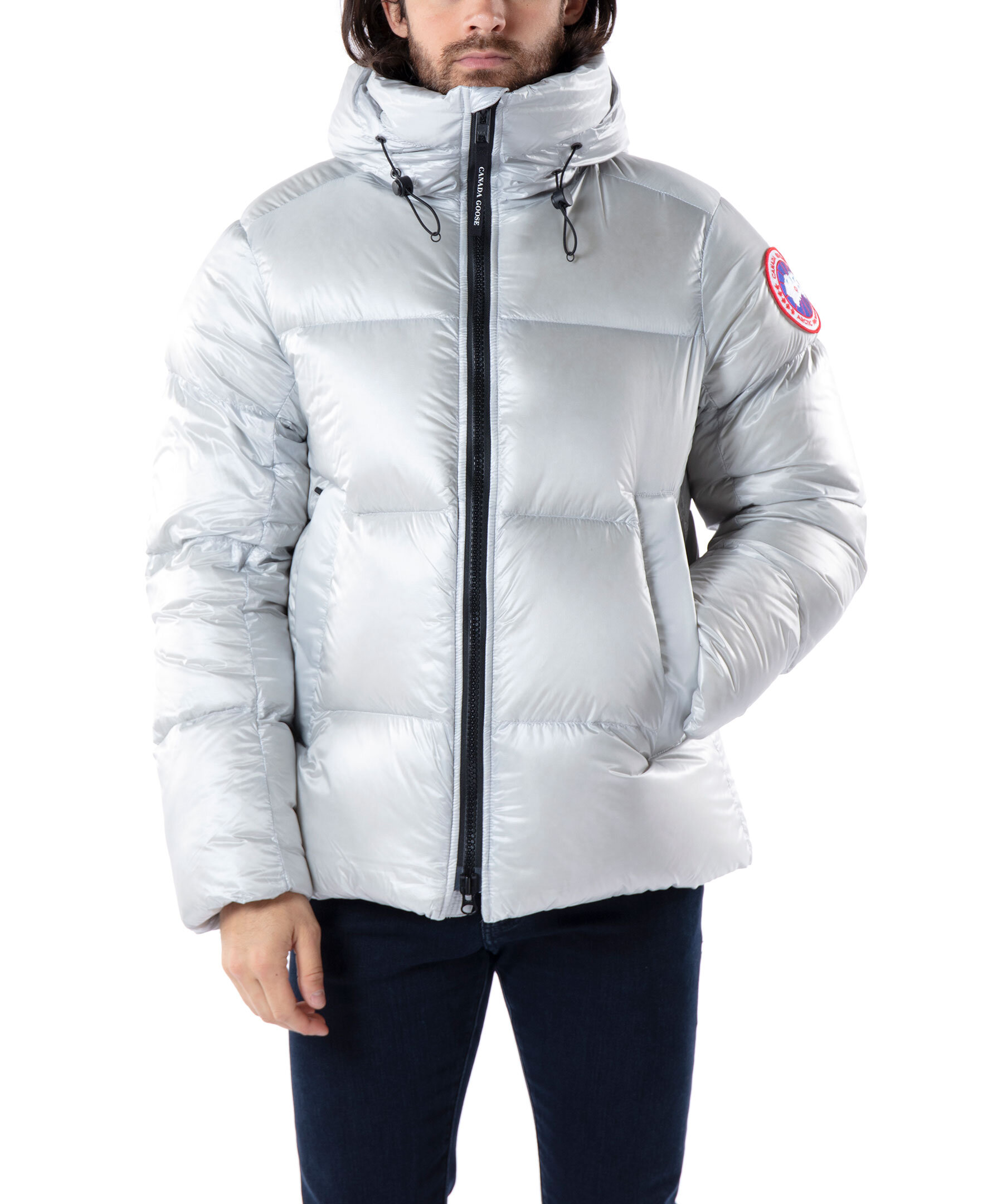 Silvergrå dunpuffer från Canada Goose. Tre stora innerfickor. Hög krage och luva med dragsko. Jackan stängs med en tvåvägsdragkedja och har elastiska band på insidan som man kan sätta över axlarna och låta jackan hänga fritt om man vill ha den öppen. Jackan kan enkelt packad ihop och bäras med en rem. Klassisk Canada Goose logga på vänster ärm. Modellen är 185cm lång och har på sig storlek M.