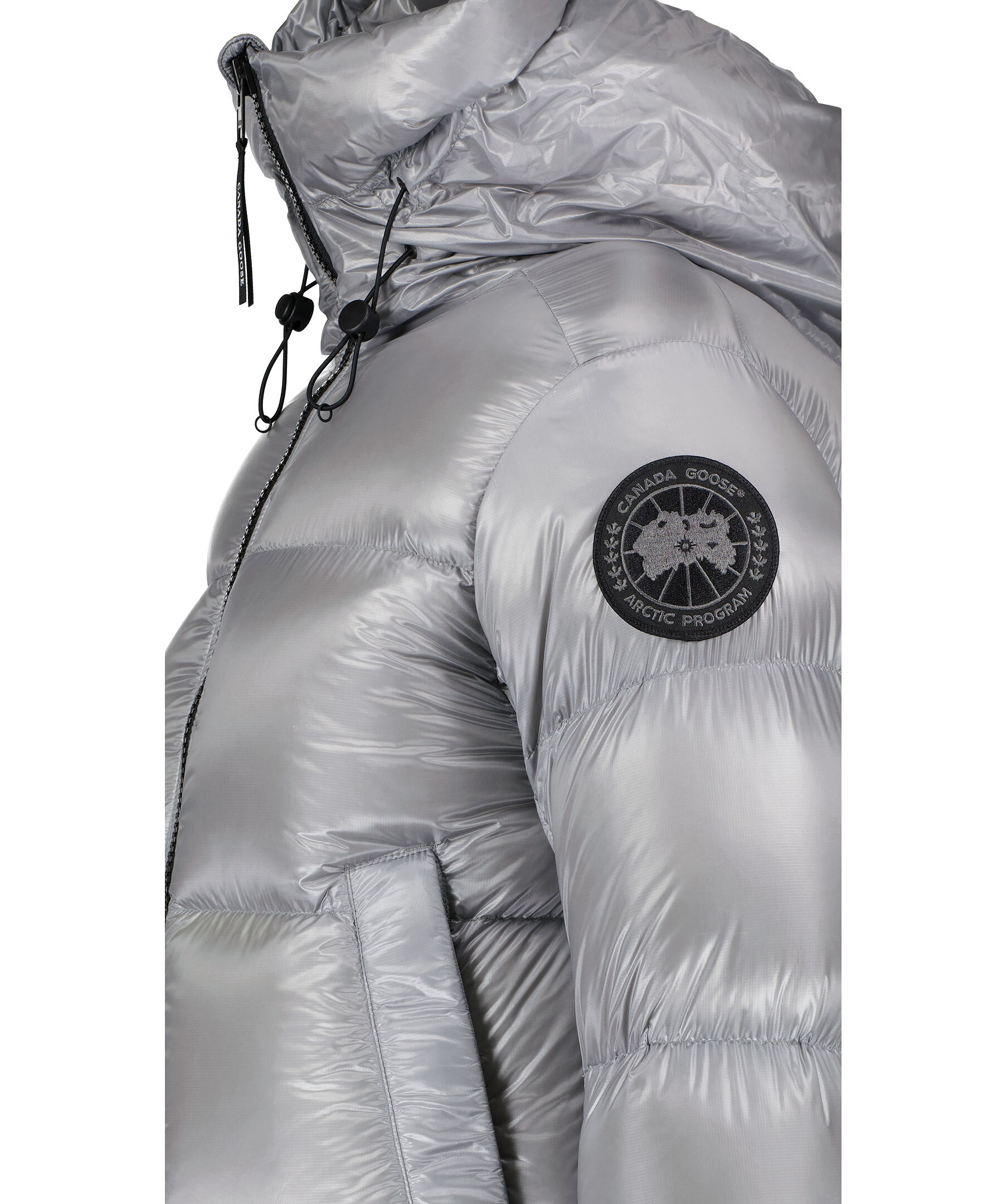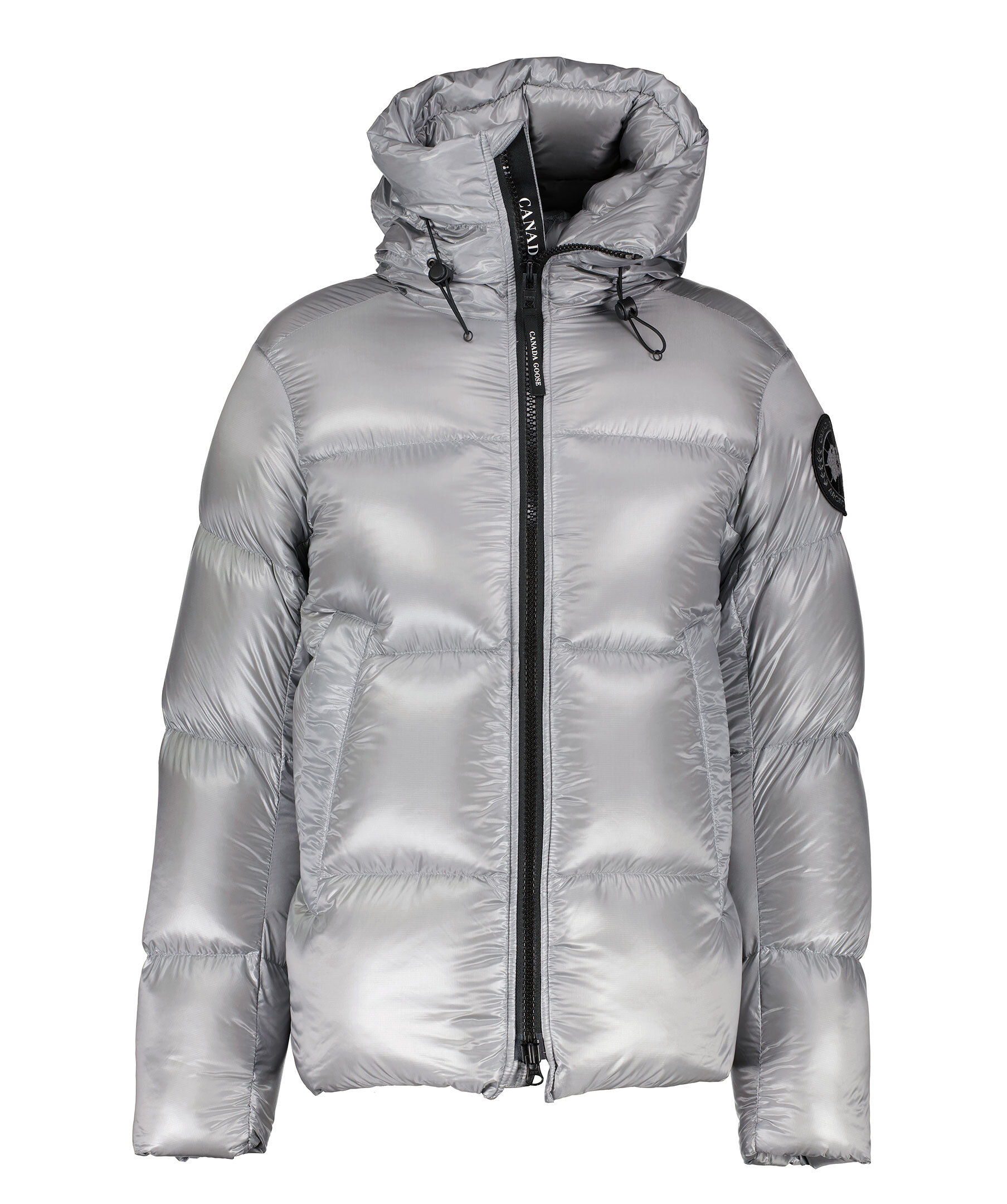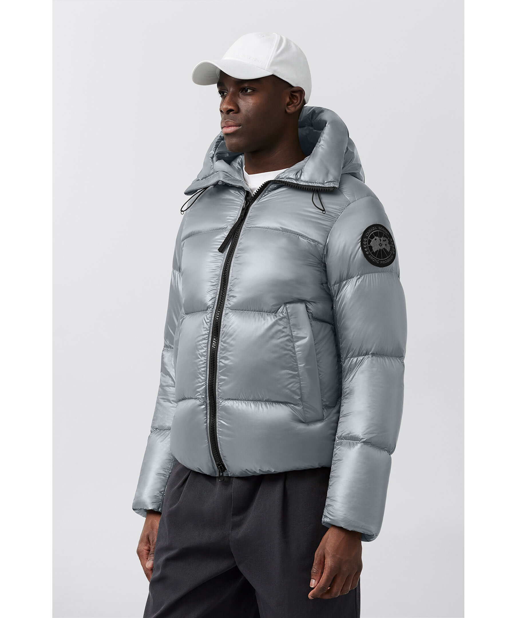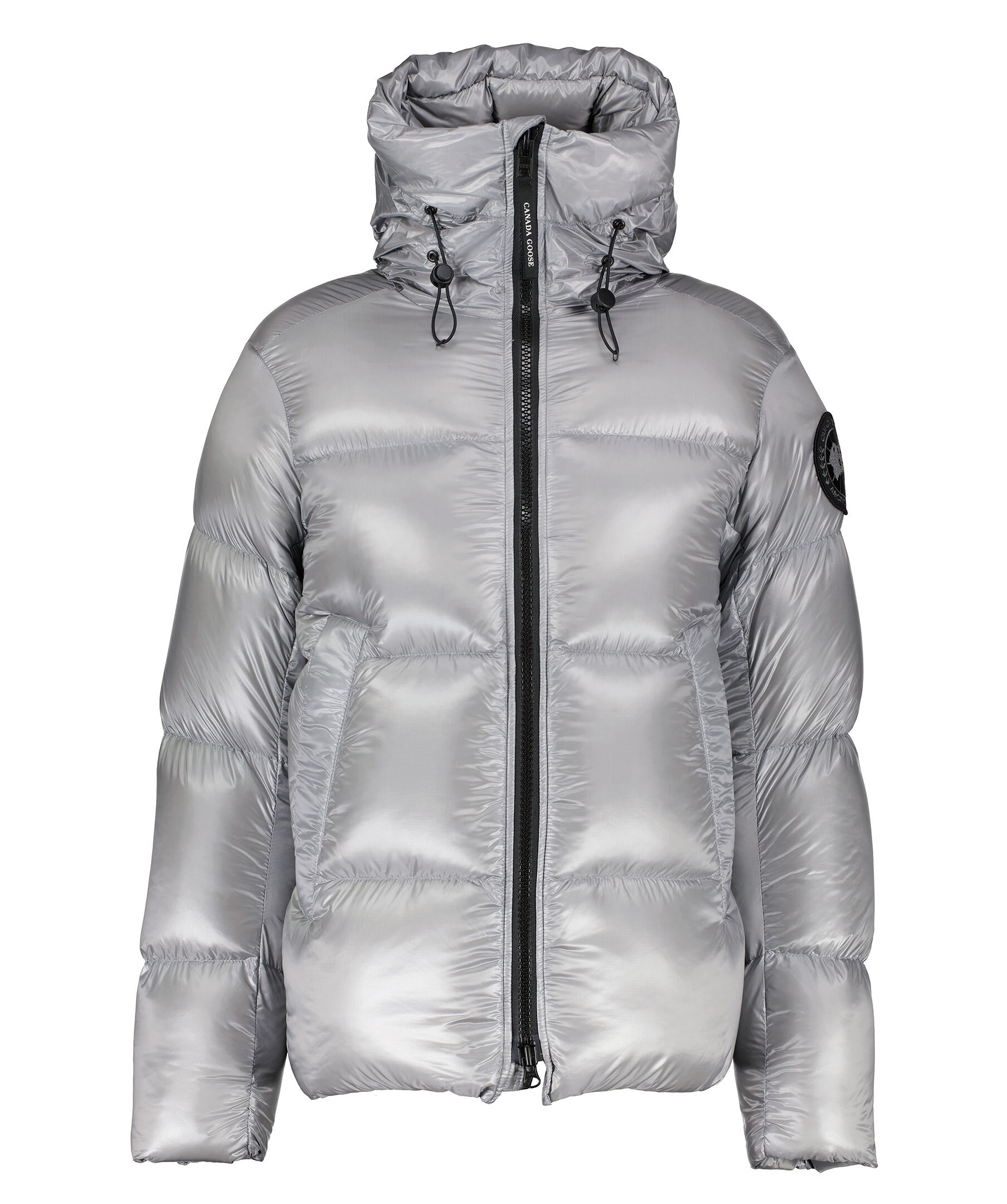 Grå, semi glansig dunjacka i puffermodell från Canada Goose. Jackan stängs med en tvåvägsdragkedja och har elastiska band på insidan som man kan sätta över axlarna och låta jackan hänga fritt om man vill ha den öppen. Två stora framfickor med fleecefoder. Hög krage och luva med dragsko. Svart broderad tygpatch med logotyp på vänster ärm.