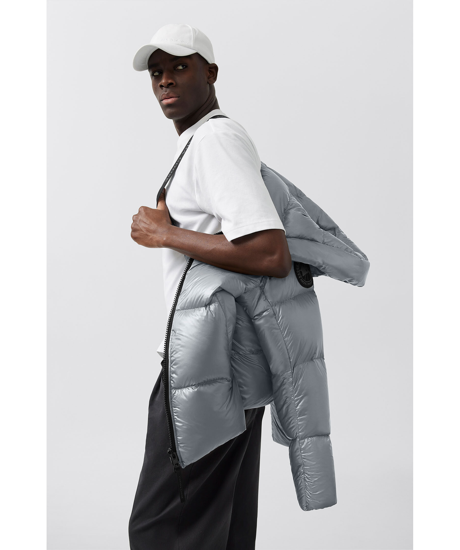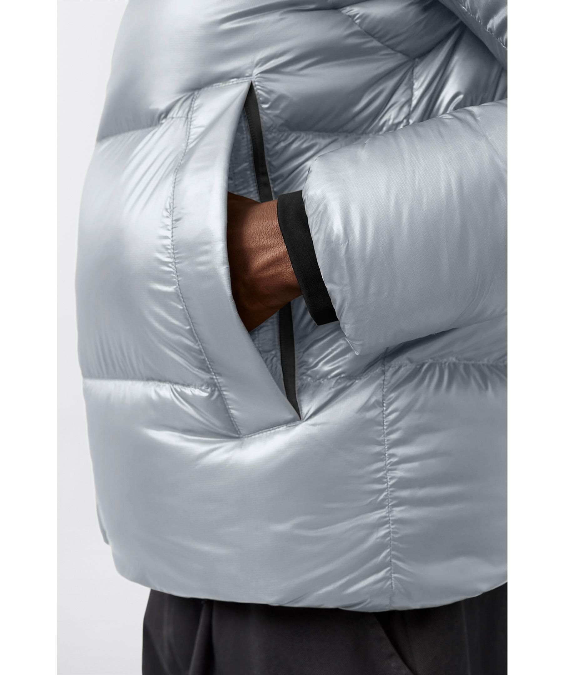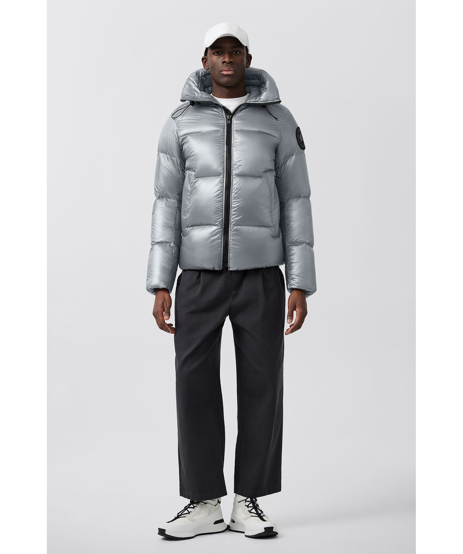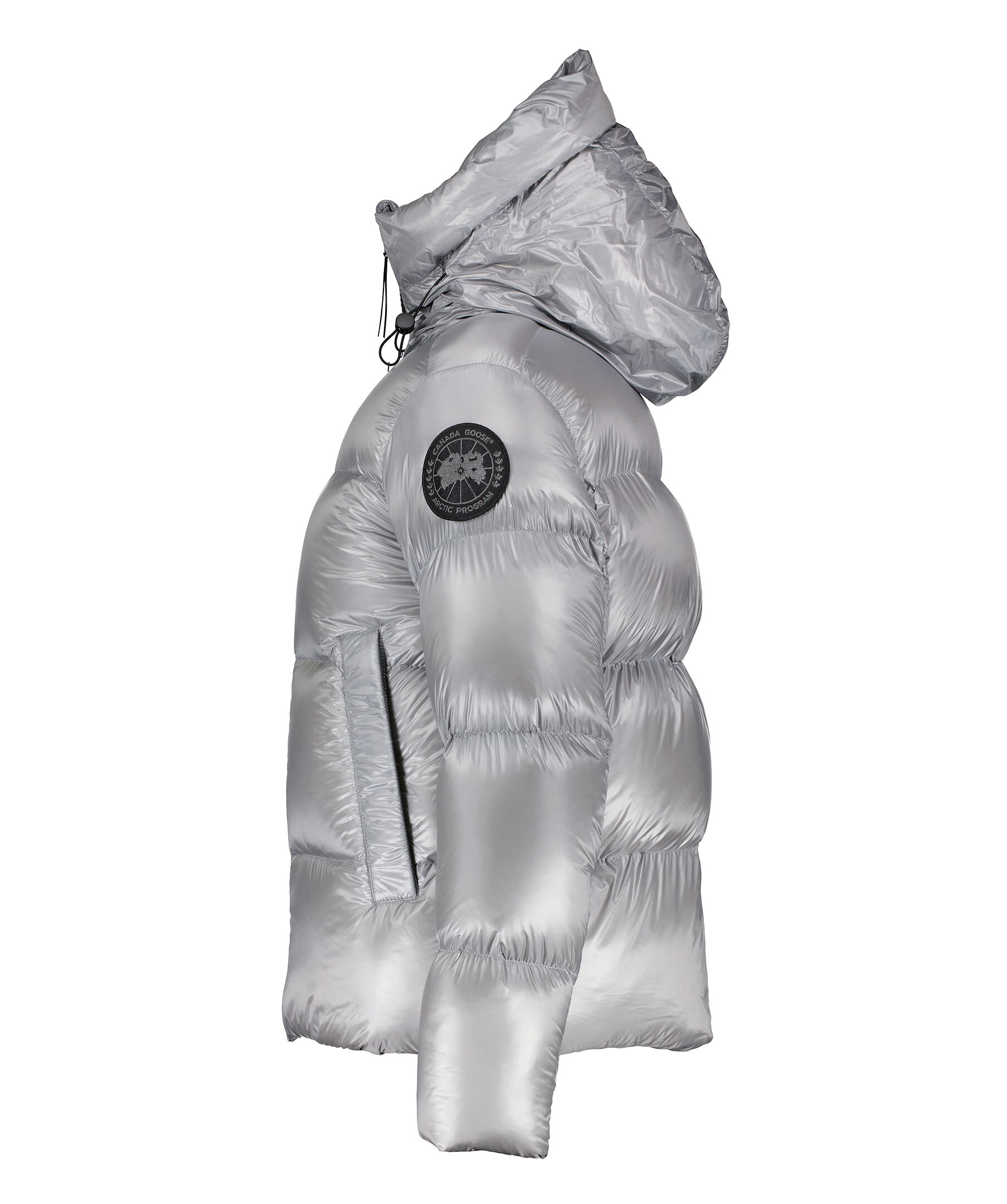 Grå, semi glansig dunjacka i puffermodell från Canada Goose. Jackan stängs med en tvåvägsdragkedja och har elastiska band på insidan som man kan sätta över axlarna och låta jackan hänga fritt om man vill ha den öppen. Två stora framfickor med fleecefoder. Hög krage och luva med dragsko. Svart broderad tygpatch med logotyp på vänster ärm.