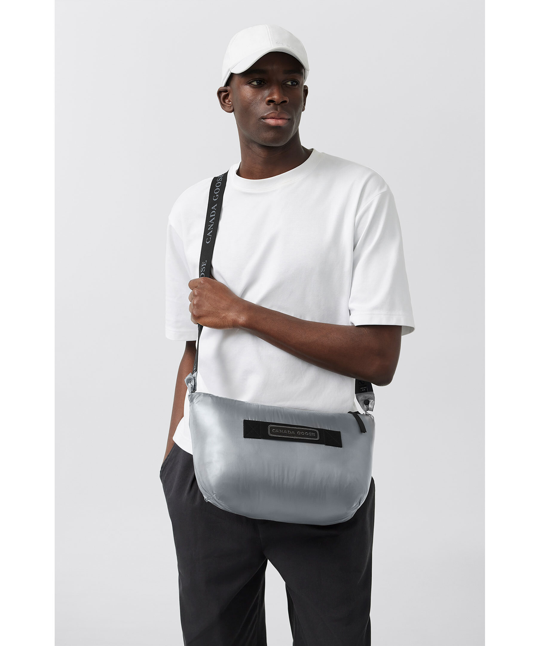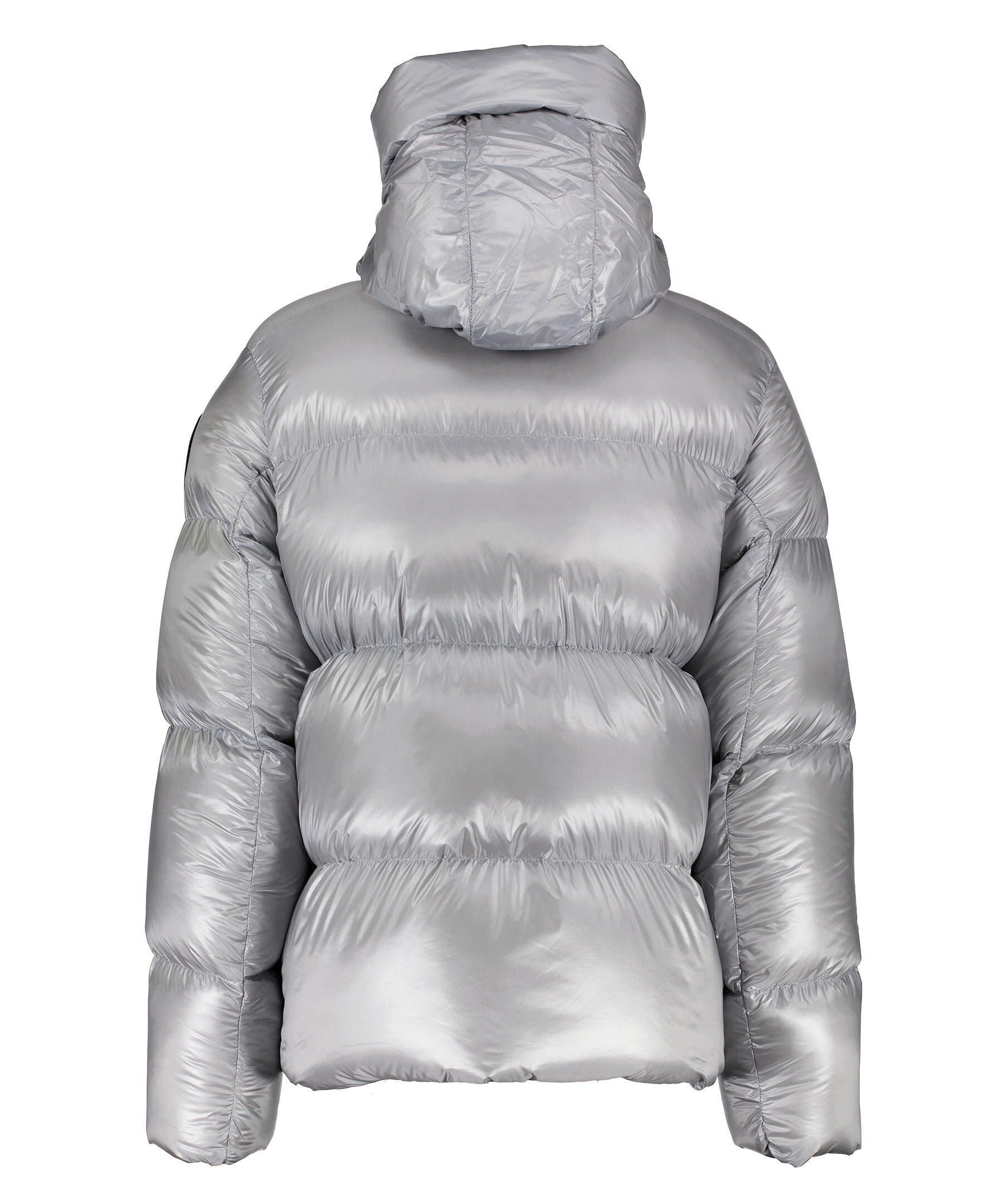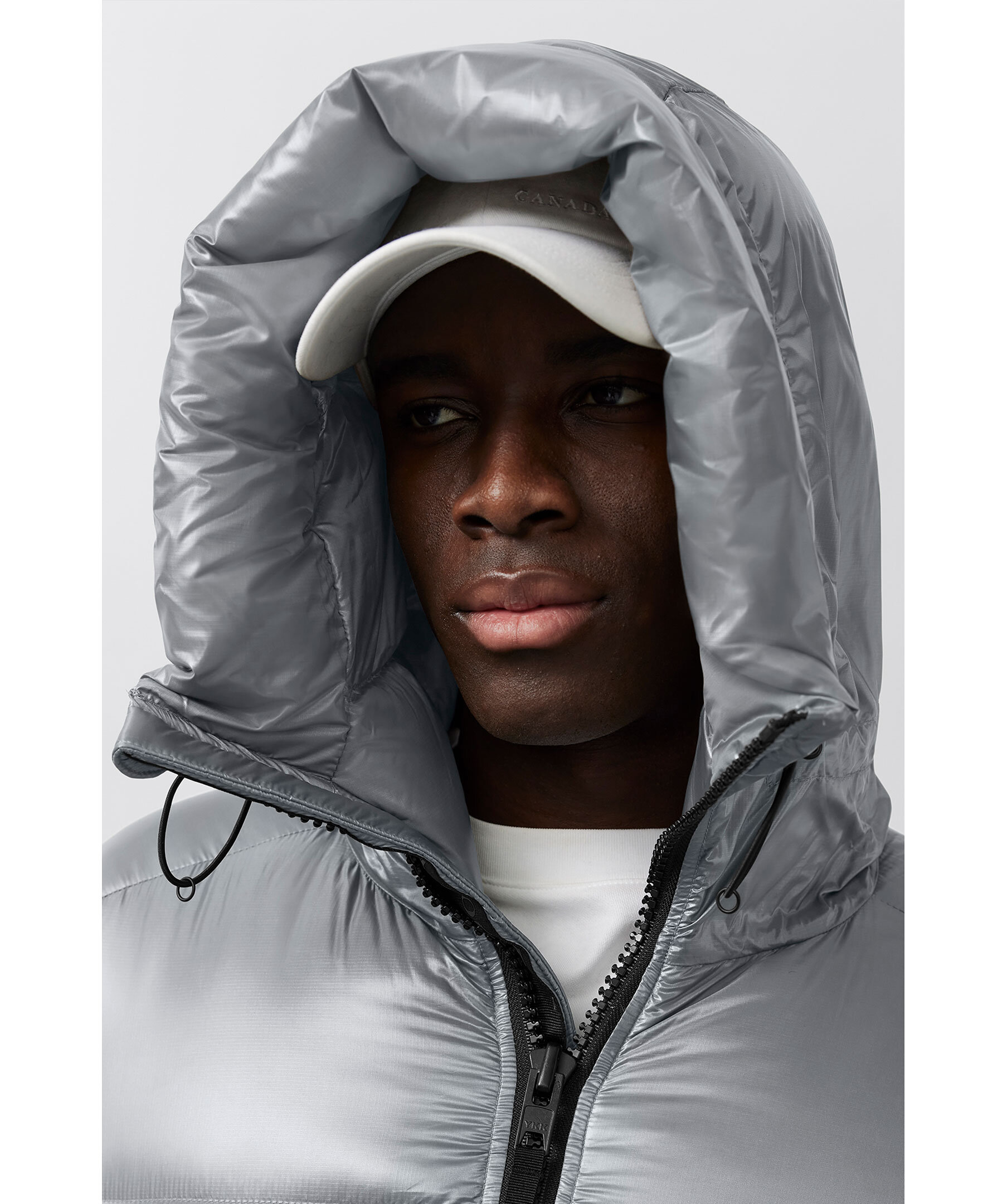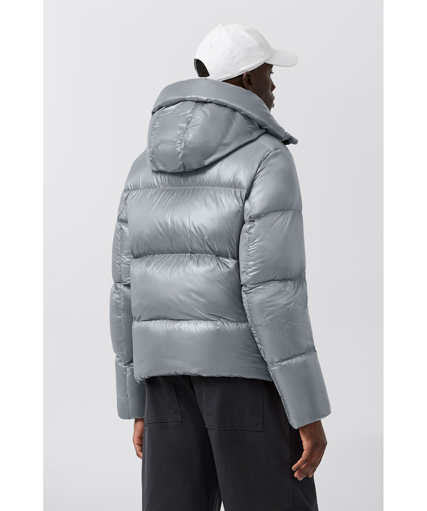 Grå, semi glansig dunjacka i puffermodell från Canada Goose. Jackan stängs med en tvåvägsdragkedja och har elastiska band på insidan som man kan sätta över axlarna och låta jackan hänga fritt om man vill ha den öppen. Två stora framfickor med fleecefoder. Hög krage och luva med dragsko. Svart broderad tygpatch med logotyp på vänster ärm.
