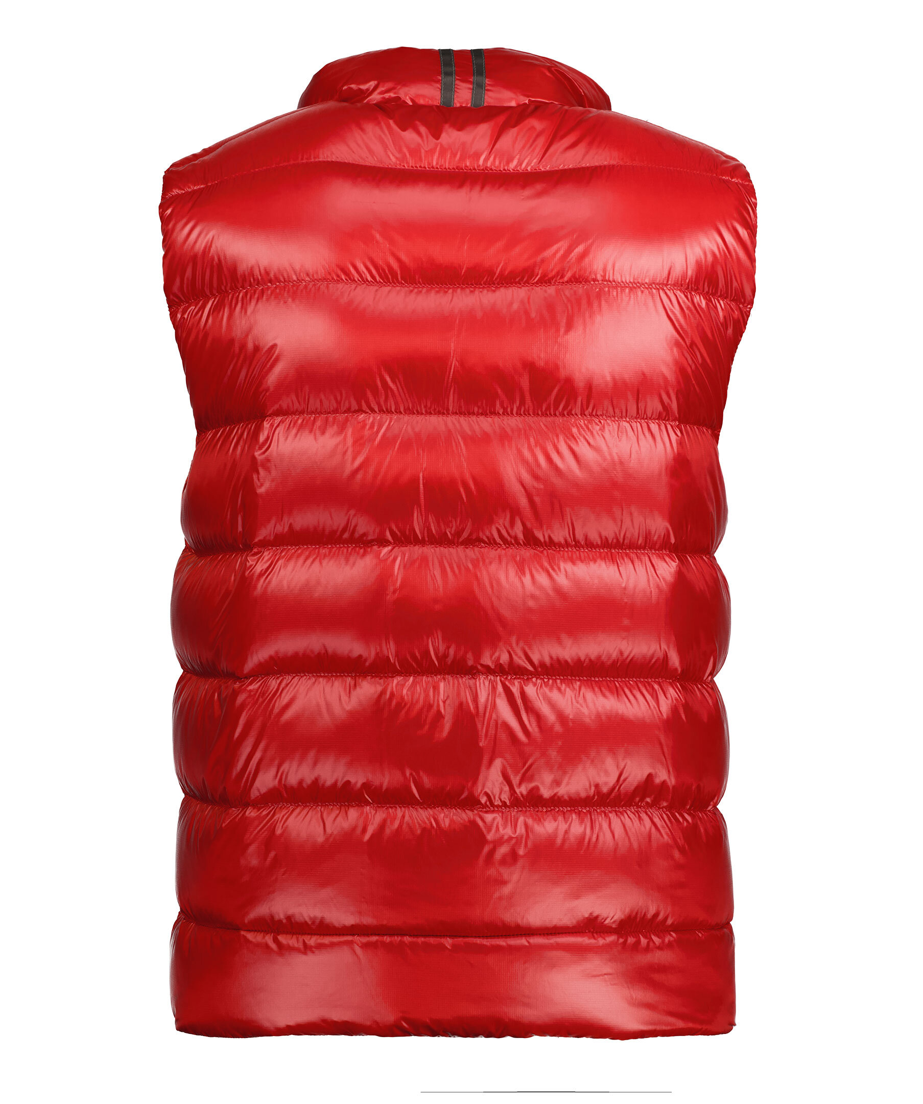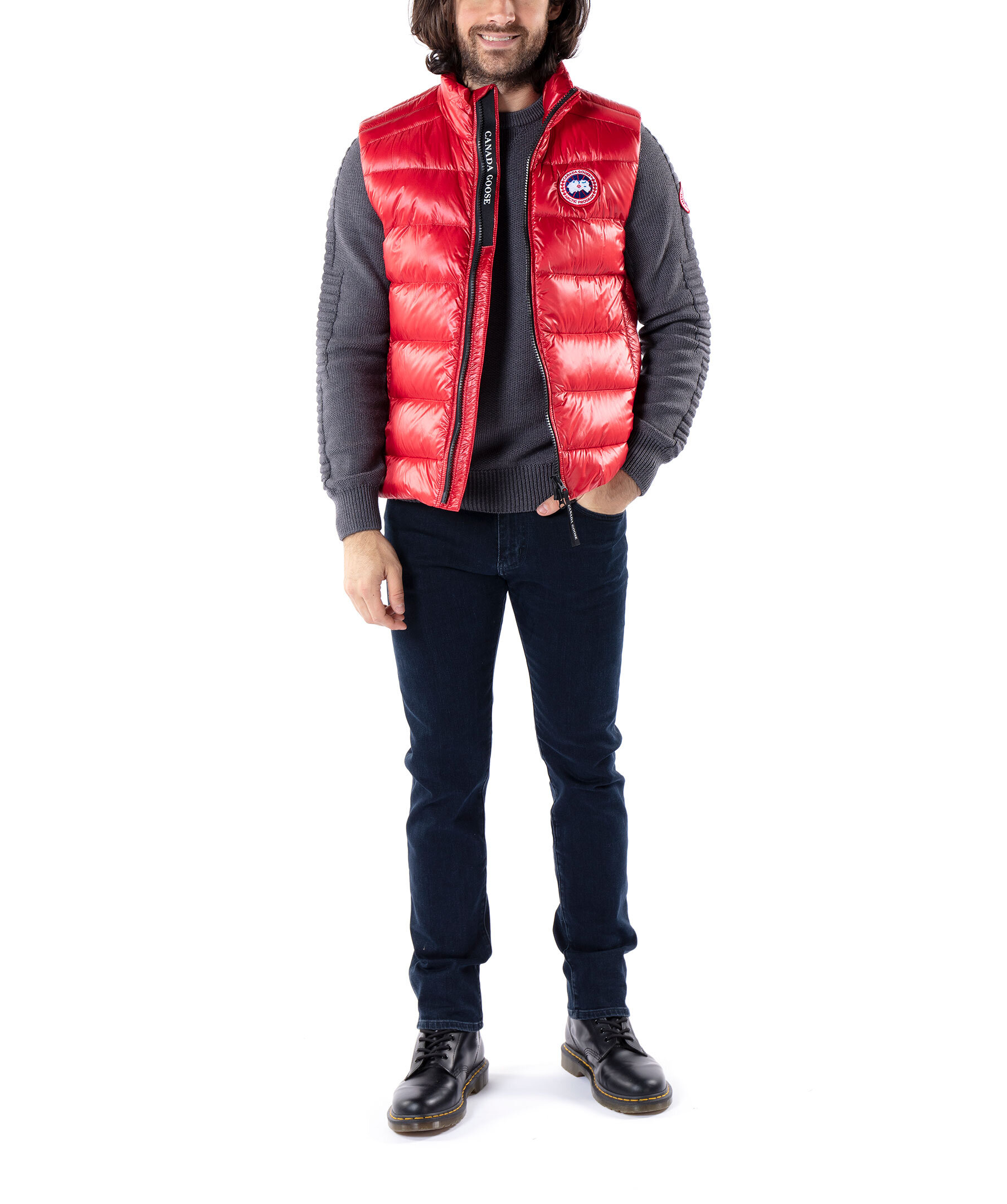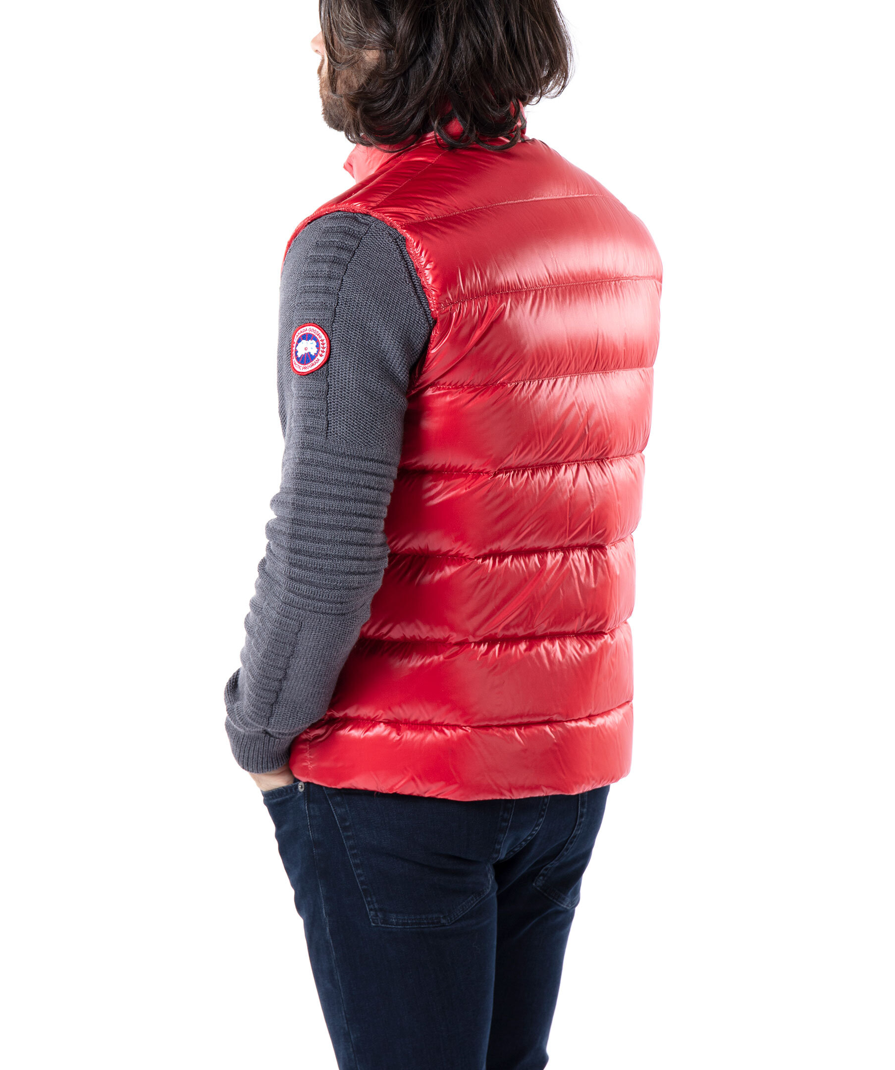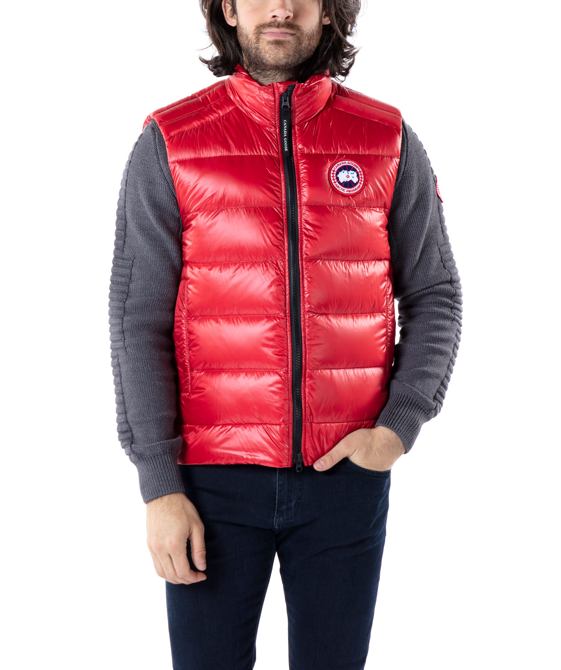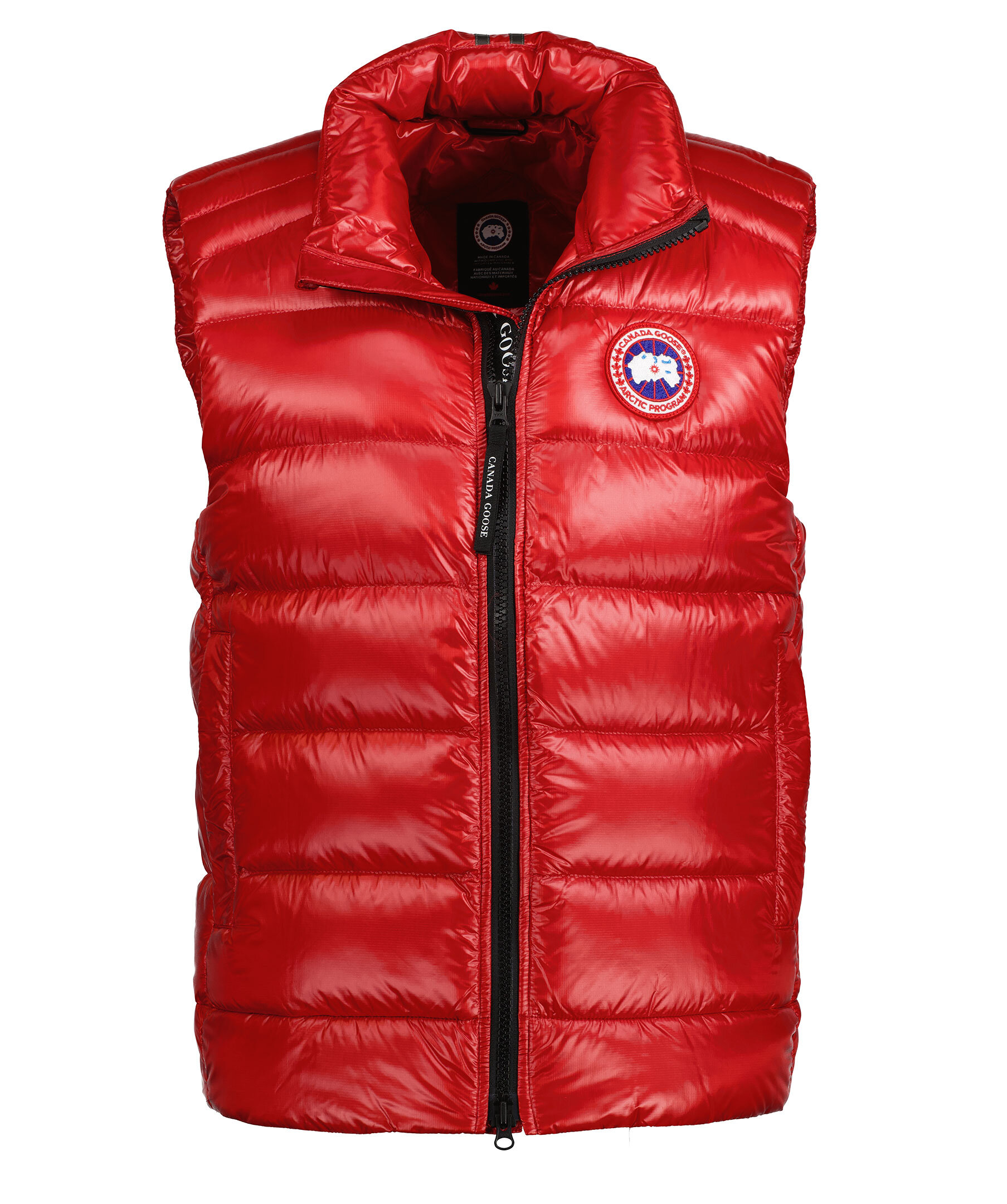 Röd väst i lättviktsdun från Canada Goose i polyamid. Medellång väst med en fyllning av dun och fjäder, har halvglansigt material. Två framfickor med dragkedja och en innerficka som man kan packa ner västen i och dra igen samt stängs med en tvåvägsdragkedja. Klassiskt Canada Goose märke på vänster bröst. Modellen är 185cm lång och har på sig storlek M.