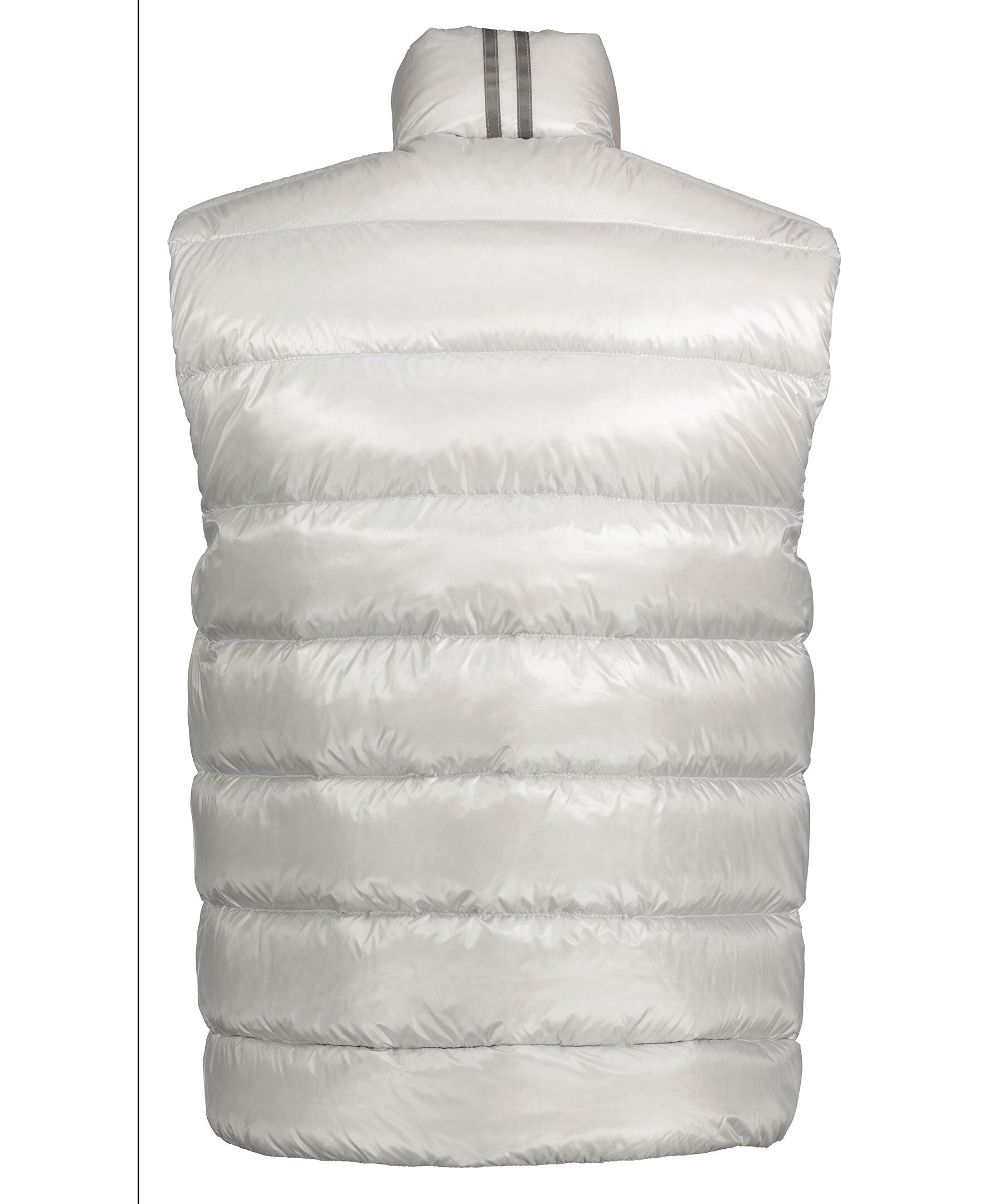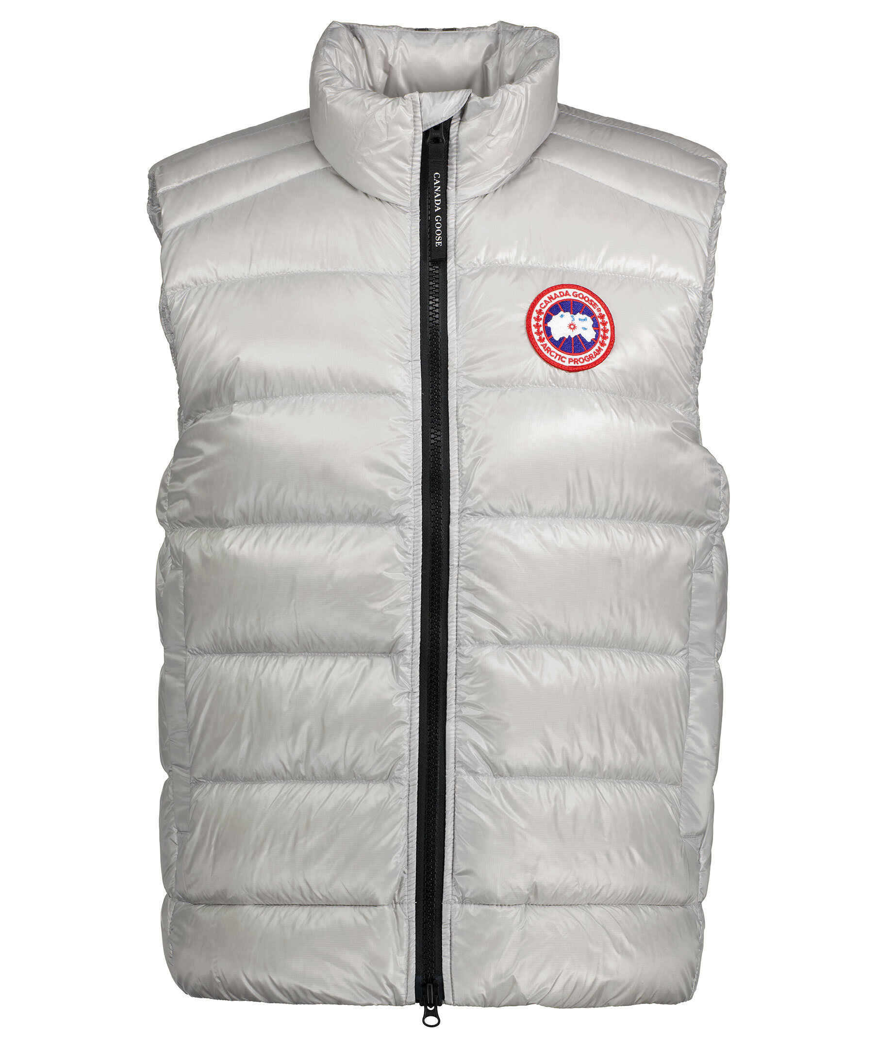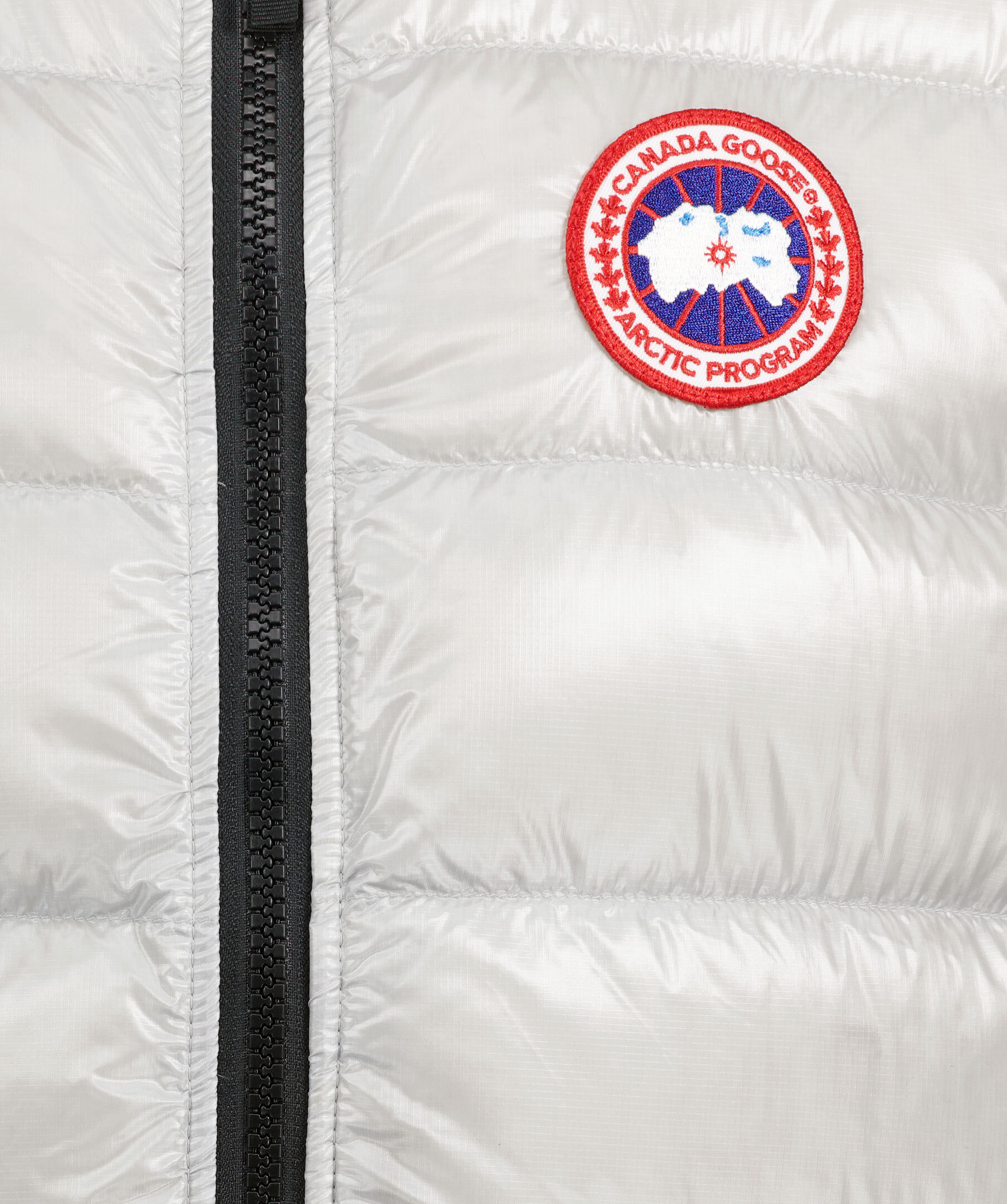 Ljusgrå väst i lättviktsdun från Canada Goose i polyamid. Medellång väst med en fyllning av dun och fjäder, har halvglansigt material. Två framfickor med dragkedja och en innerficka som man kan packa ner västen i och dra igen samt stängs med en tvåvägsdragkedja. Klassiskt Canada Goose märke på vänster bröst.