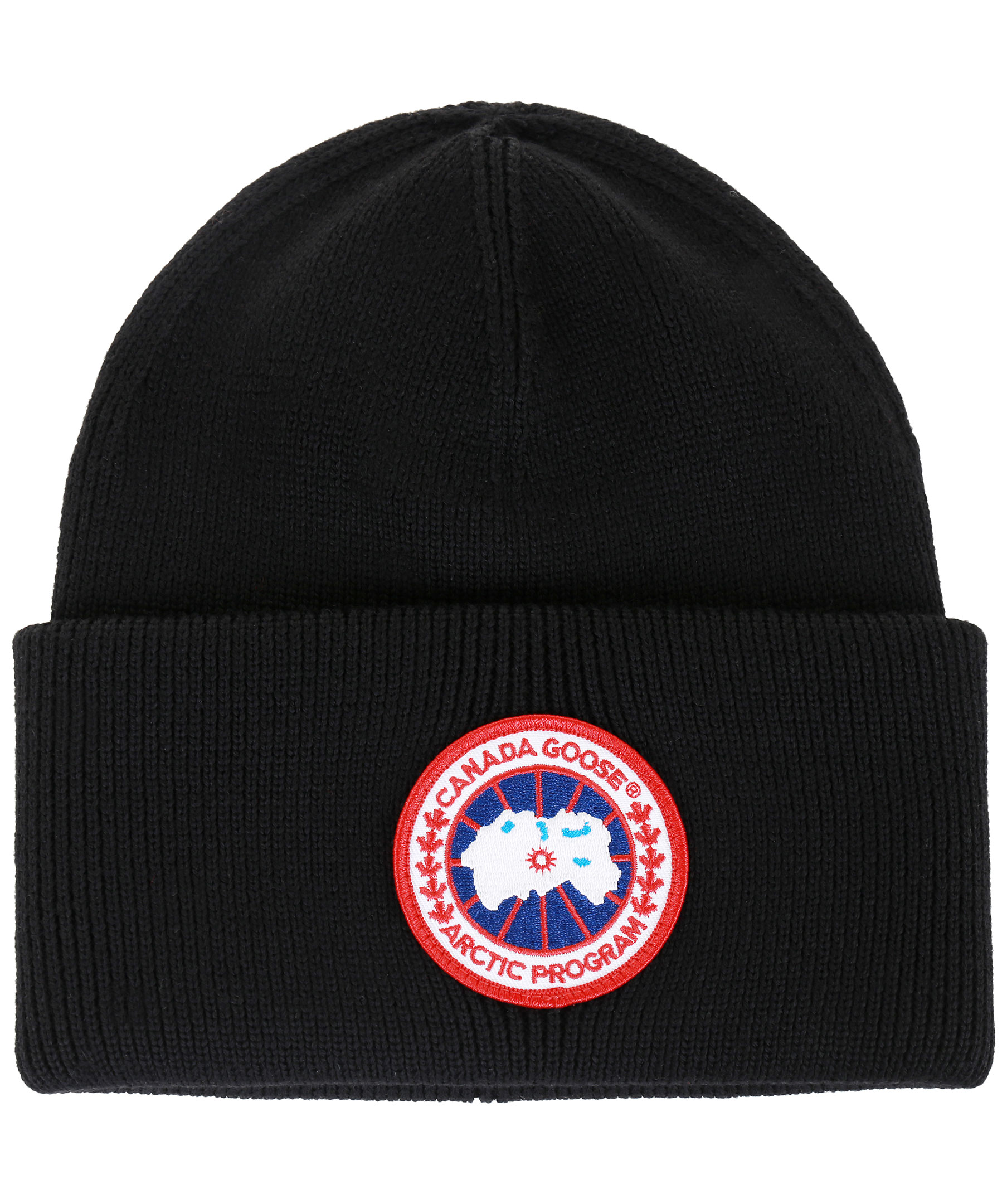 Svart, stickad mössa från Canada Goose. Uppvikt kant, broderad logotyp framtill. Tillverkad i 100% ull.