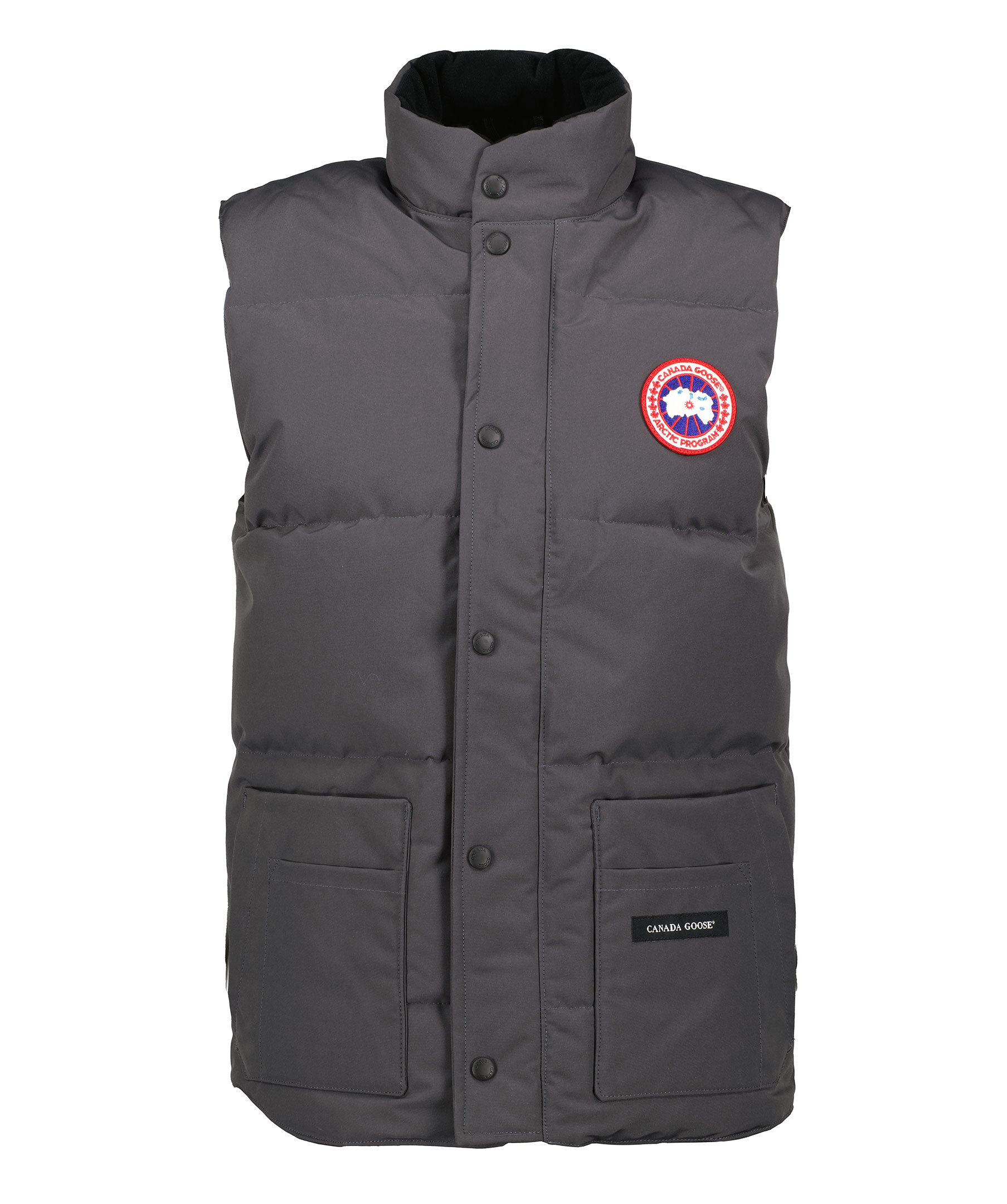 Klassiska Freestyle Vest från Canada Goose här i en medellång modell i grått med fleece på insidan av kragen. Sex frontfickor samt två innerfickor, en med dragkedja och en öppen. Dold tvåvägsdragkedja och tryckknappar fram. Klassiskt Canada Goose märke på vänster bröst.
