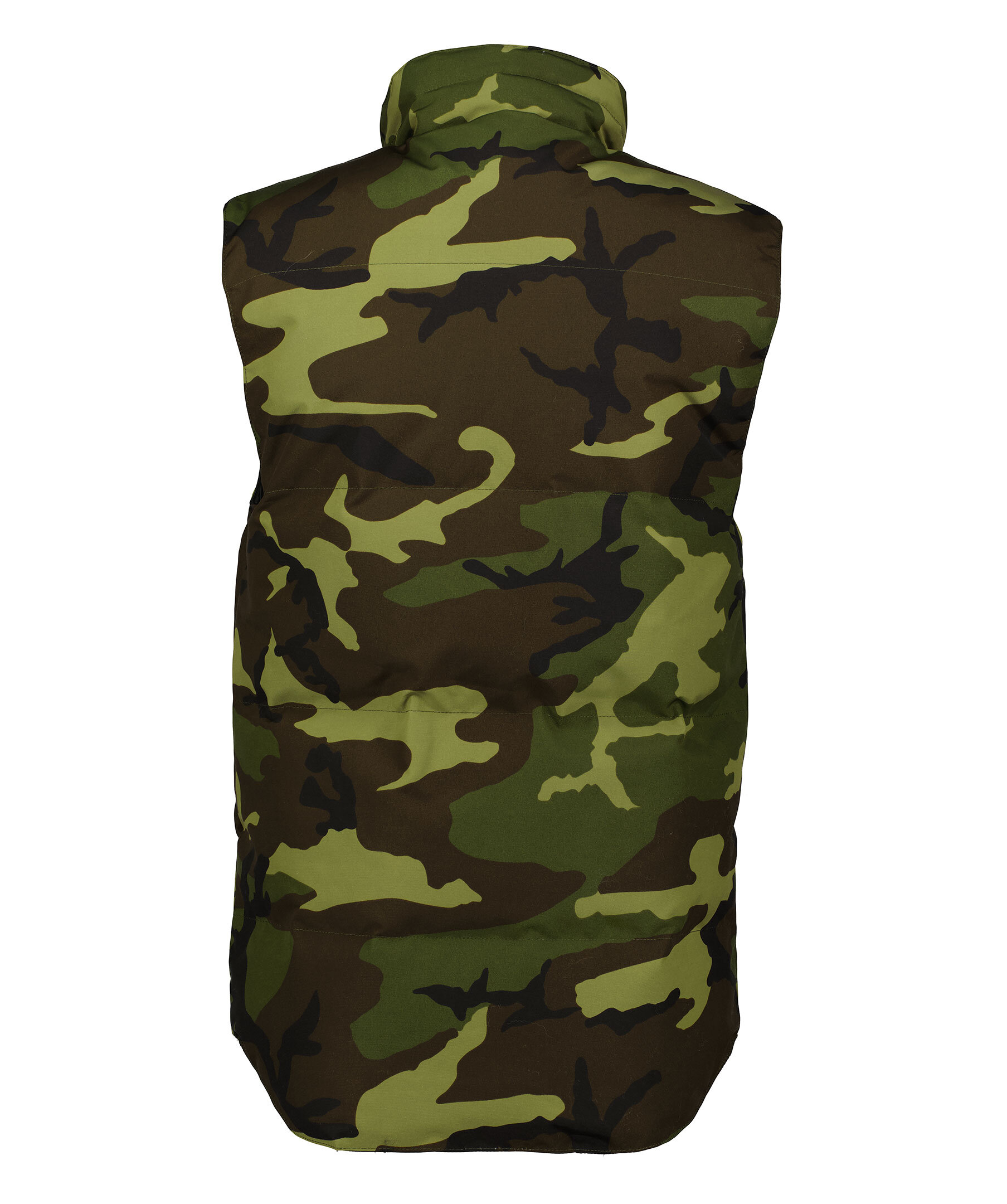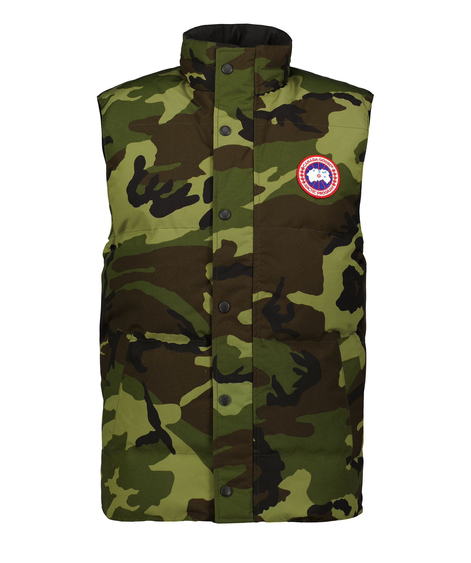Kamouflagemönstrad dunväst i grönt, brunt och svart från Canada Goose. Stängs framtill med dragkedja och tryckknappar. Tillverkad i en vattenavstötande bomullsblandning. Två fickor framtill. Broderad patch med logotyp på vänster bröst.