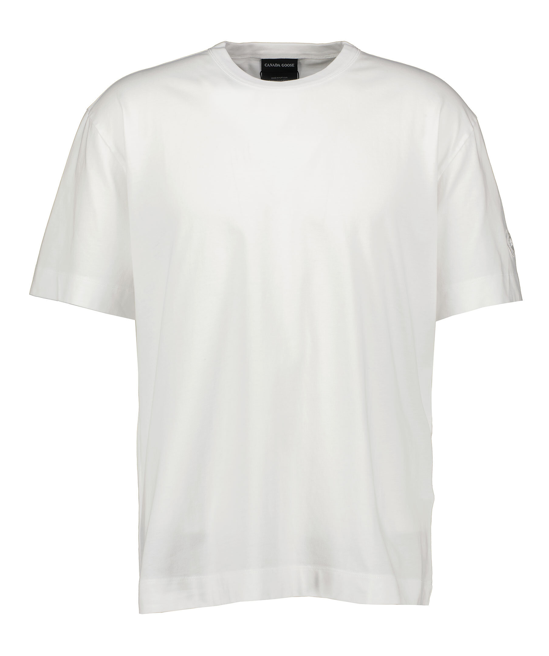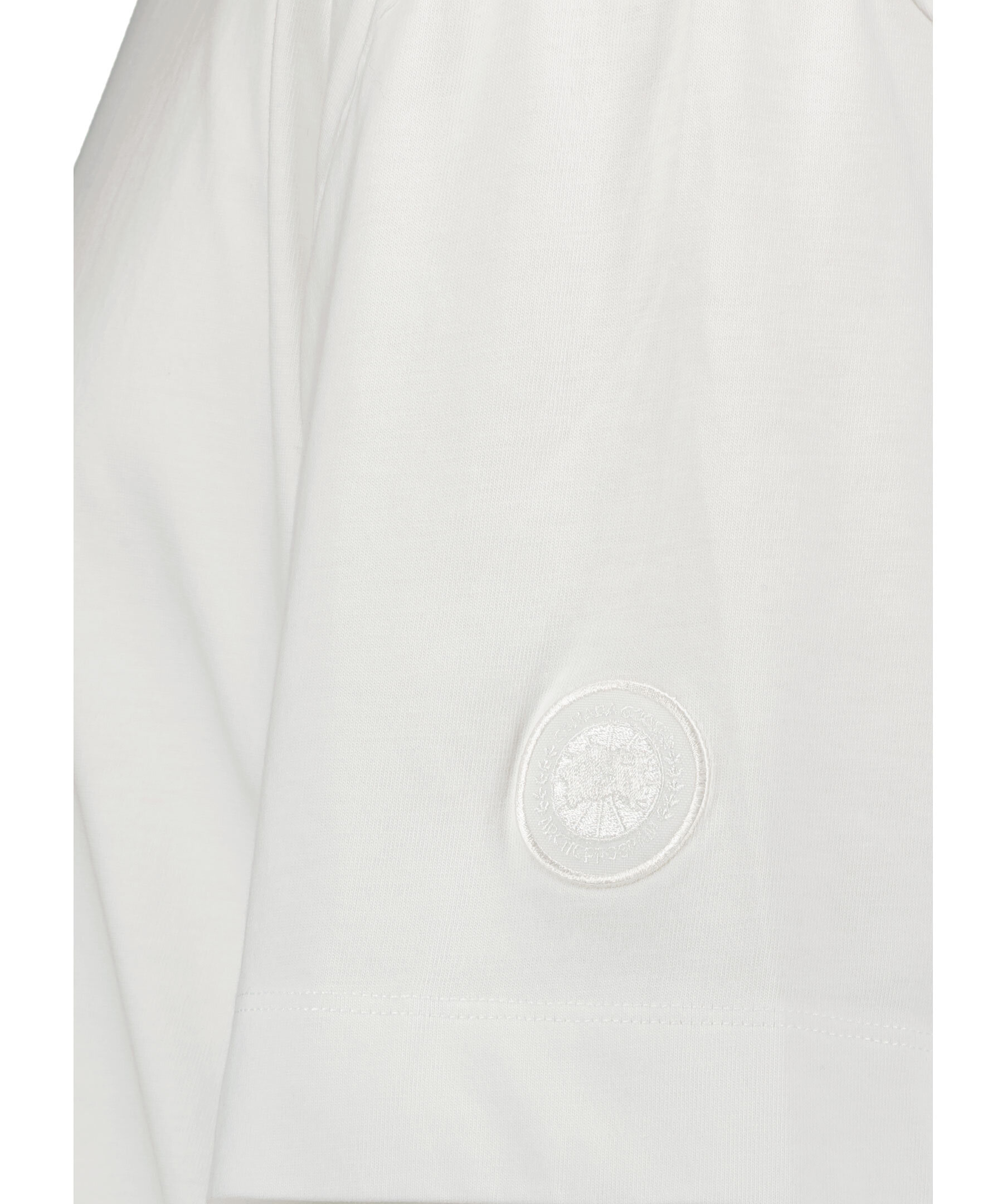 Vit t-shirt från Canada Goose. T-shirten har en rund, ribbstickad halsringning samt en broderad ton-i-ton logotyp på vänster ärm. Tillverkad i bomull.