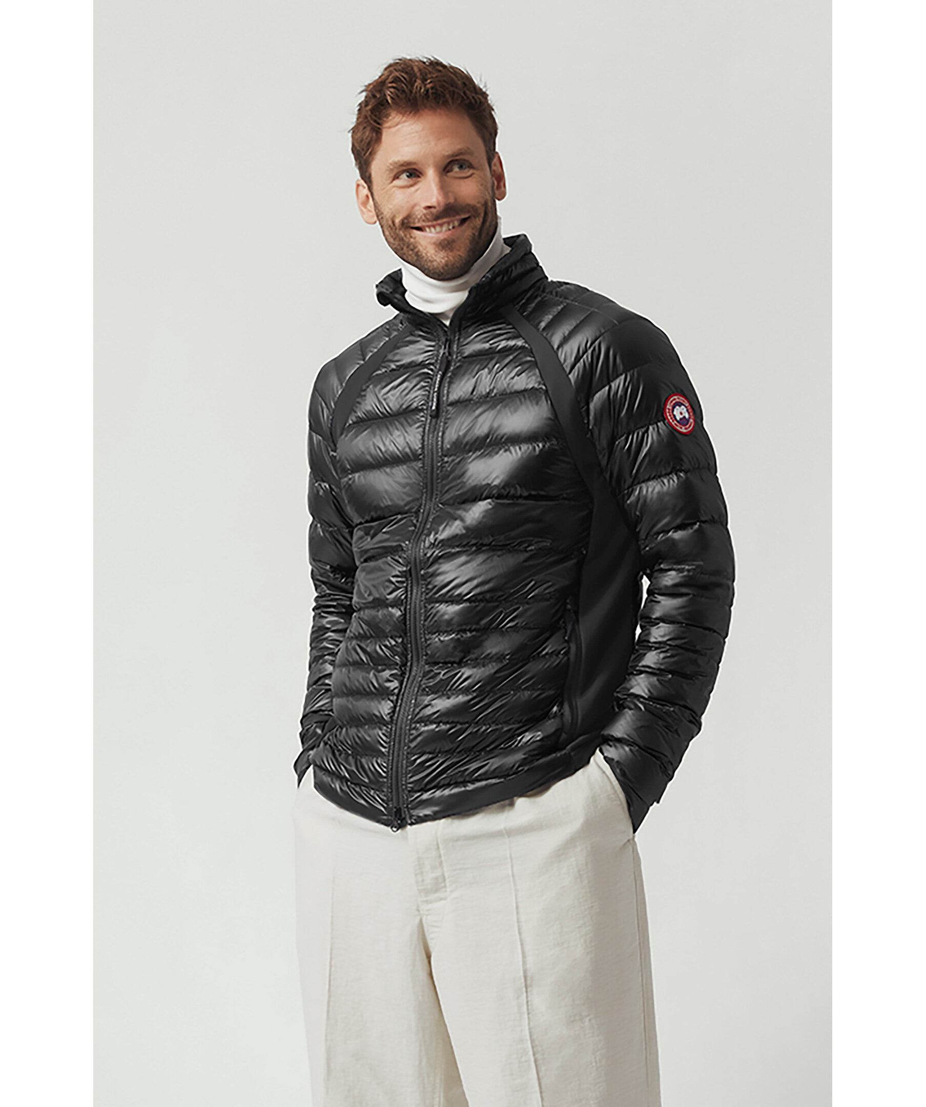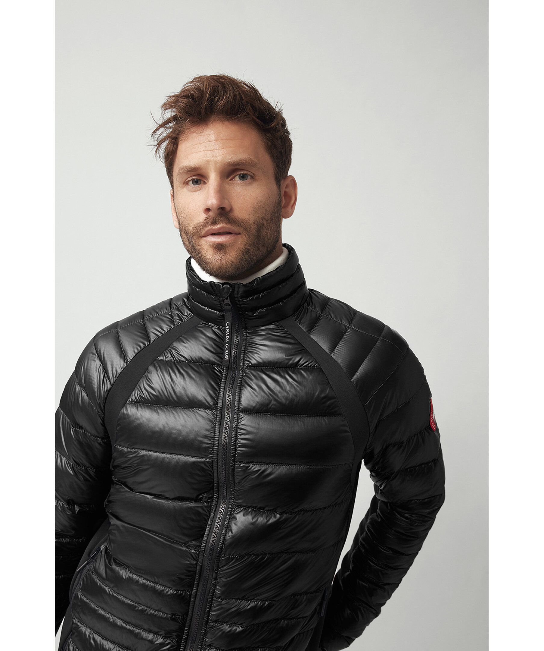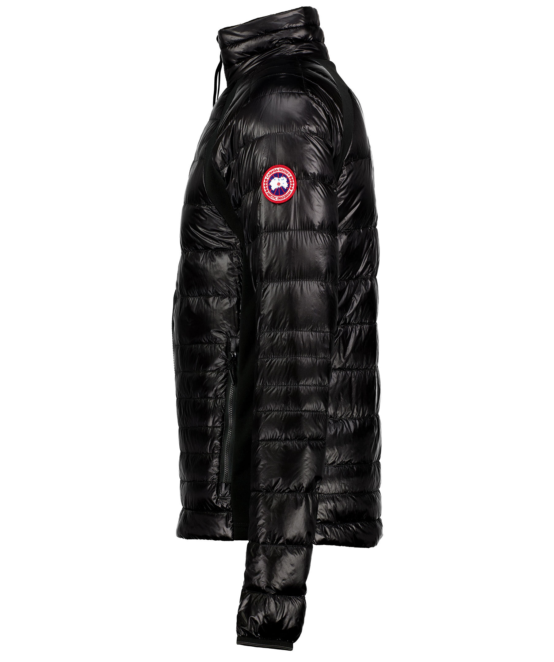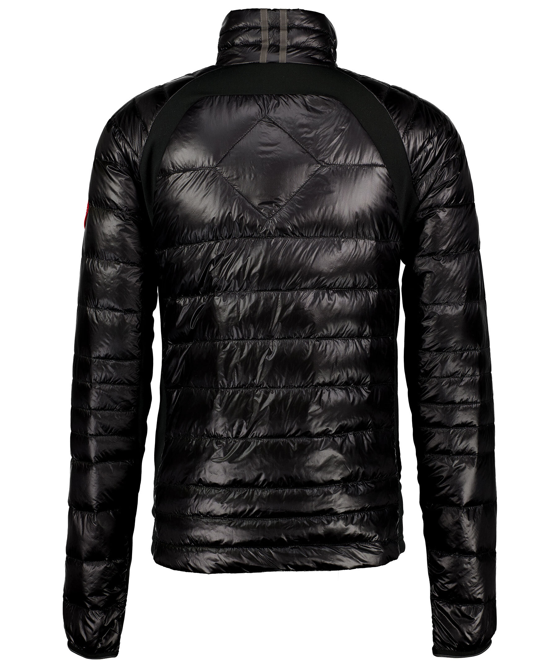 Svart, tunn jacka i lättviktsdun från Canada Goose. Yttermaterial tillverkat i polyamid. Stängs med dragkedja fram och har en medelhög krage. Vissa delar av jackan är i stretchig polyester och polyamidblandning som längs underärmarna och längs sidorna. Två framfickor med dragkedja och två innerfickor. Tunn mudd längst ner i ärmslutet samt ett hål för tummen. Rund patch med logotyp på vänster ärm. Modellen är 185cm lång och har på sig storlek M.