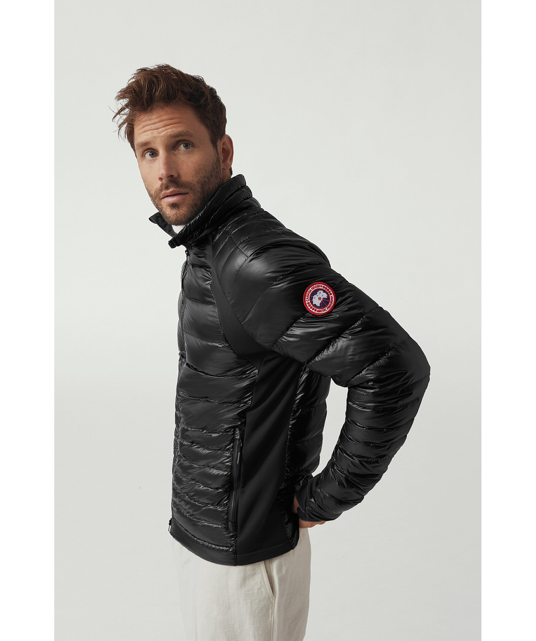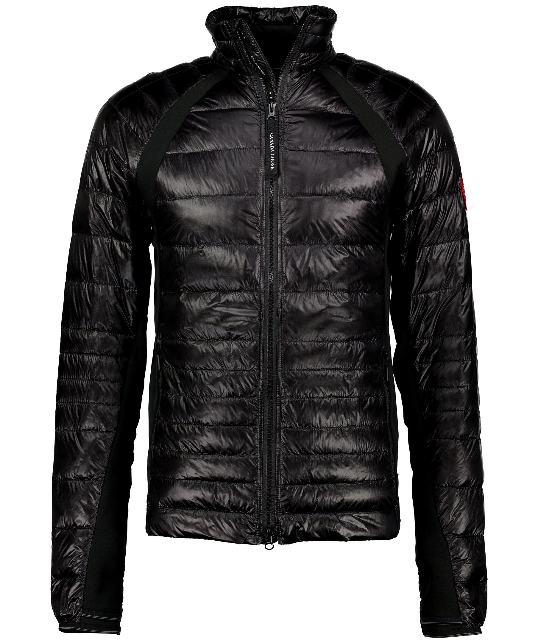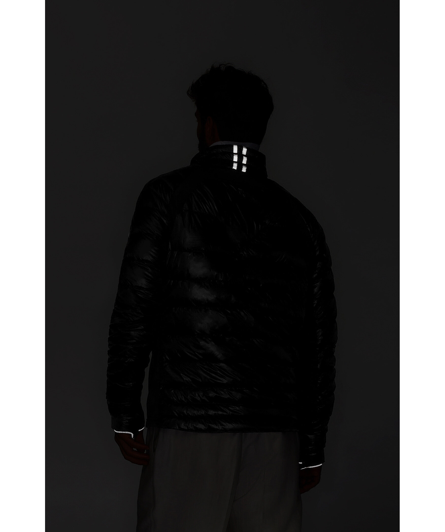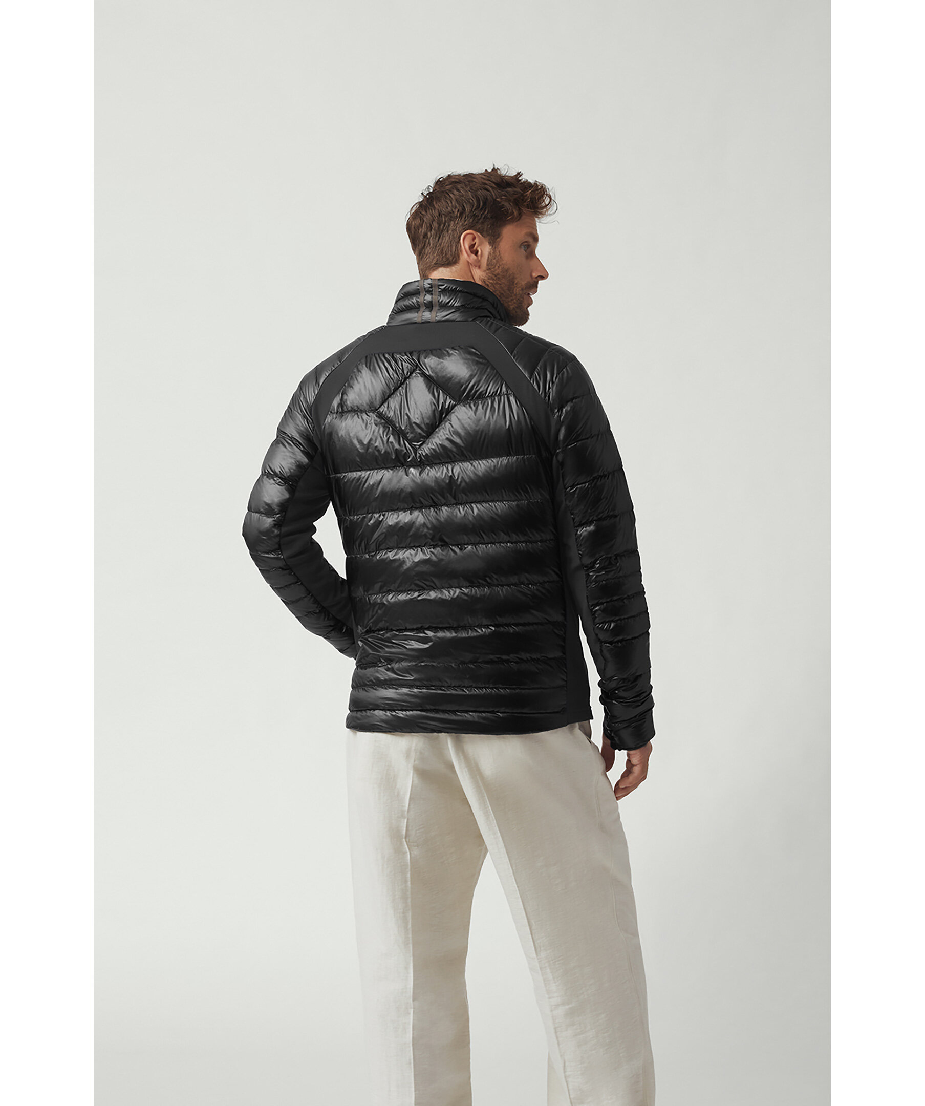 Svart, tunn jacka i lättviktsdun från Canada Goose. Yttermaterial tillverkat i polyamid. Stängs med dragkedja fram och har en medelhög krage. Vissa delar av jackan är i stretchig polyester och polyamidblandning som längs underärmarna och längs sidorna. Två framfickor med dragkedja och två innerfickor. Tunn mudd längst ner i ärmslutet samt ett hål för tummen. Rund patch med logotyp på vänster ärm. Modellen är 185cm lång och har på sig storlek M.