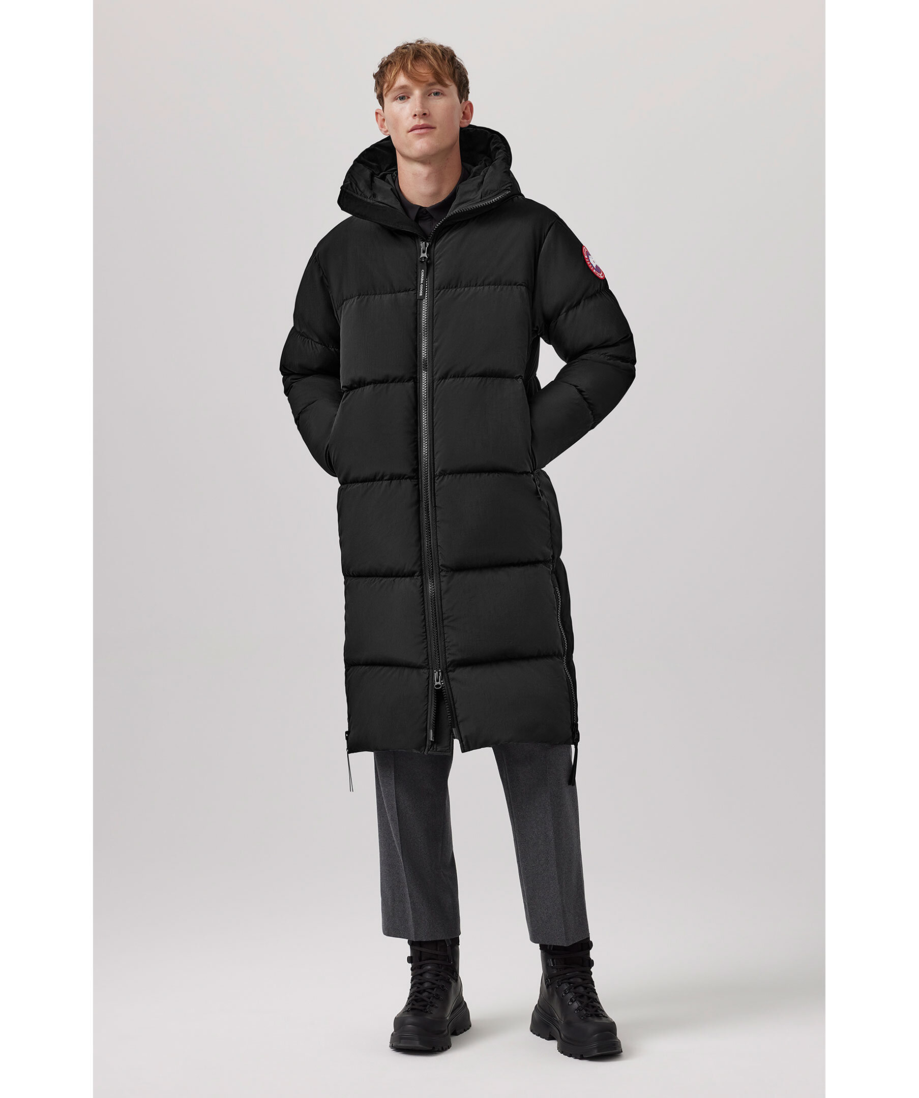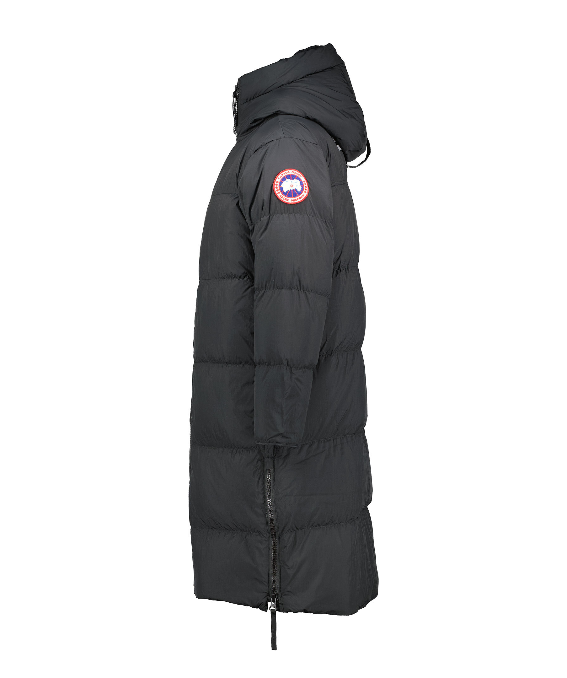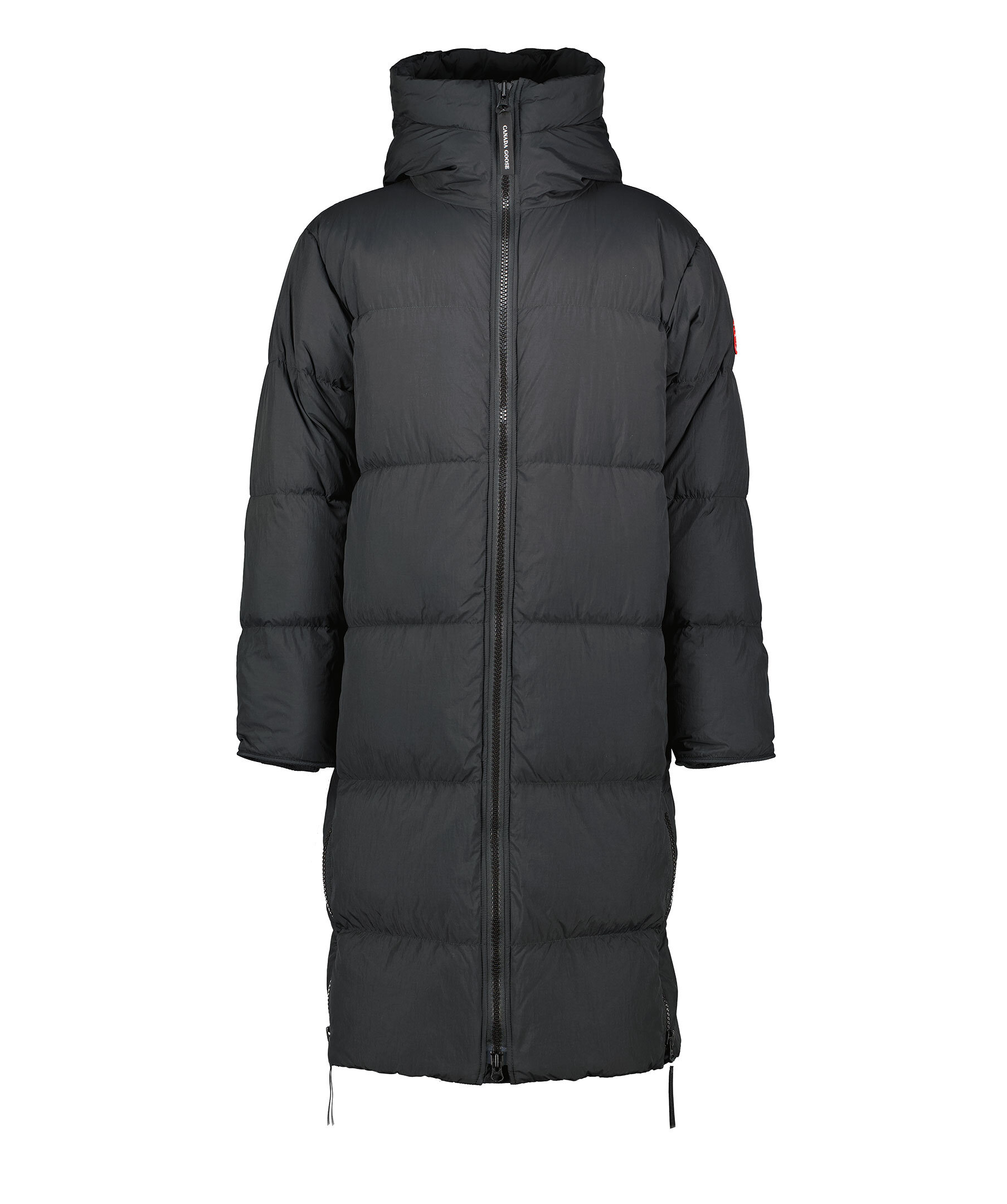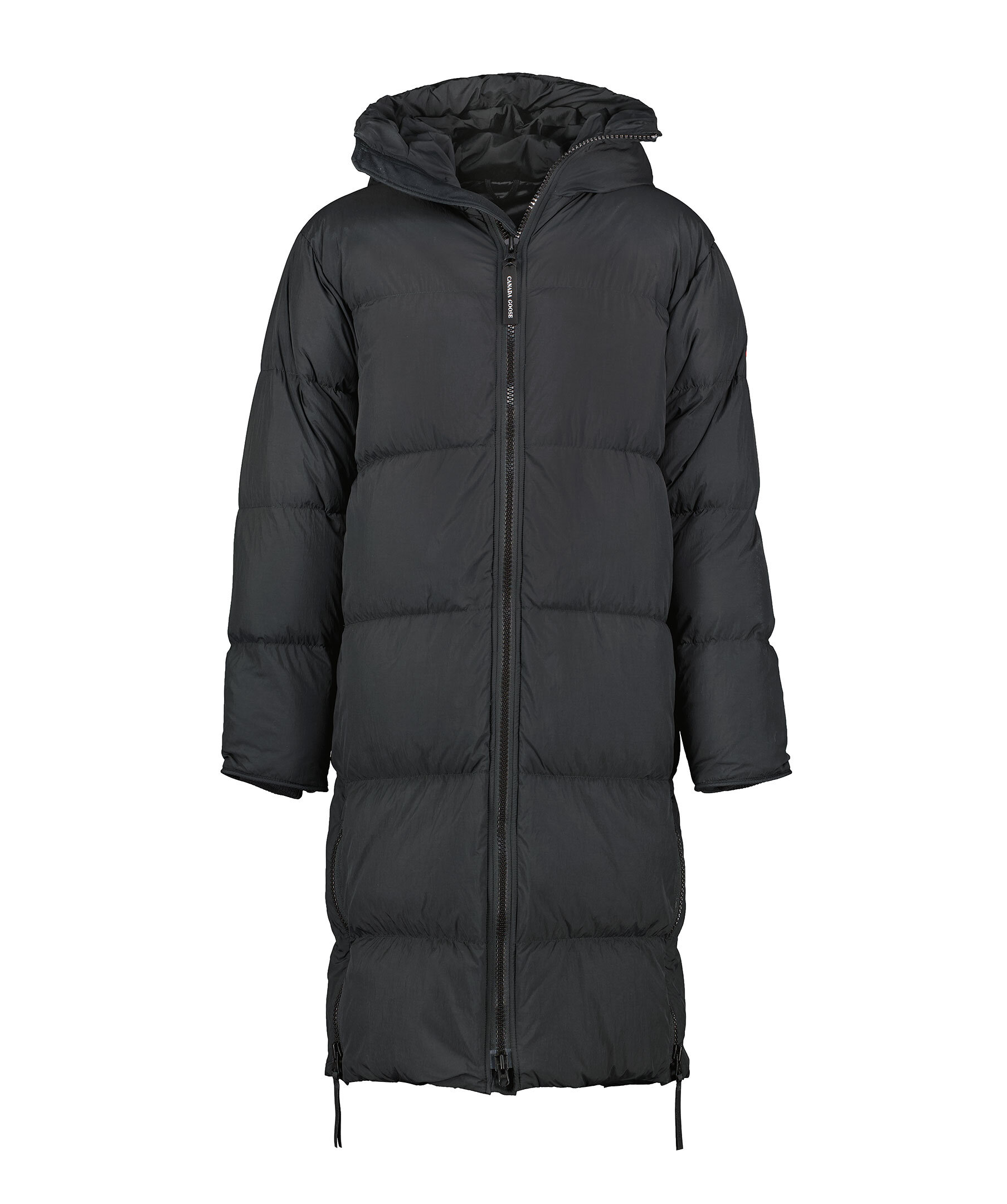 Svart, lång puffer jacka från Canada Goose. Jackan har en tvåvägsdragkedja för att ge bra rörelseomfång samt ventilering. Infällda ribbstickade muddar, två sidöppningar med dragkedja längst ner på jackan. Längre fåll i bak. På ryggen finns en reflekterande grepprem. Två nätinnerfickor och en bröstinnerficka med blixtlås. Jackan har även två elastiska band på insidan som man kan sätta över axlarna och låta jackan hänga fritt om man vill ha den öppen. Broderad patch med logotyp på vänster ärm. En lättviktsjacka med tyg som är vattenavstötande. Tillverkad av återvunnen nylon med en dunstoppning.