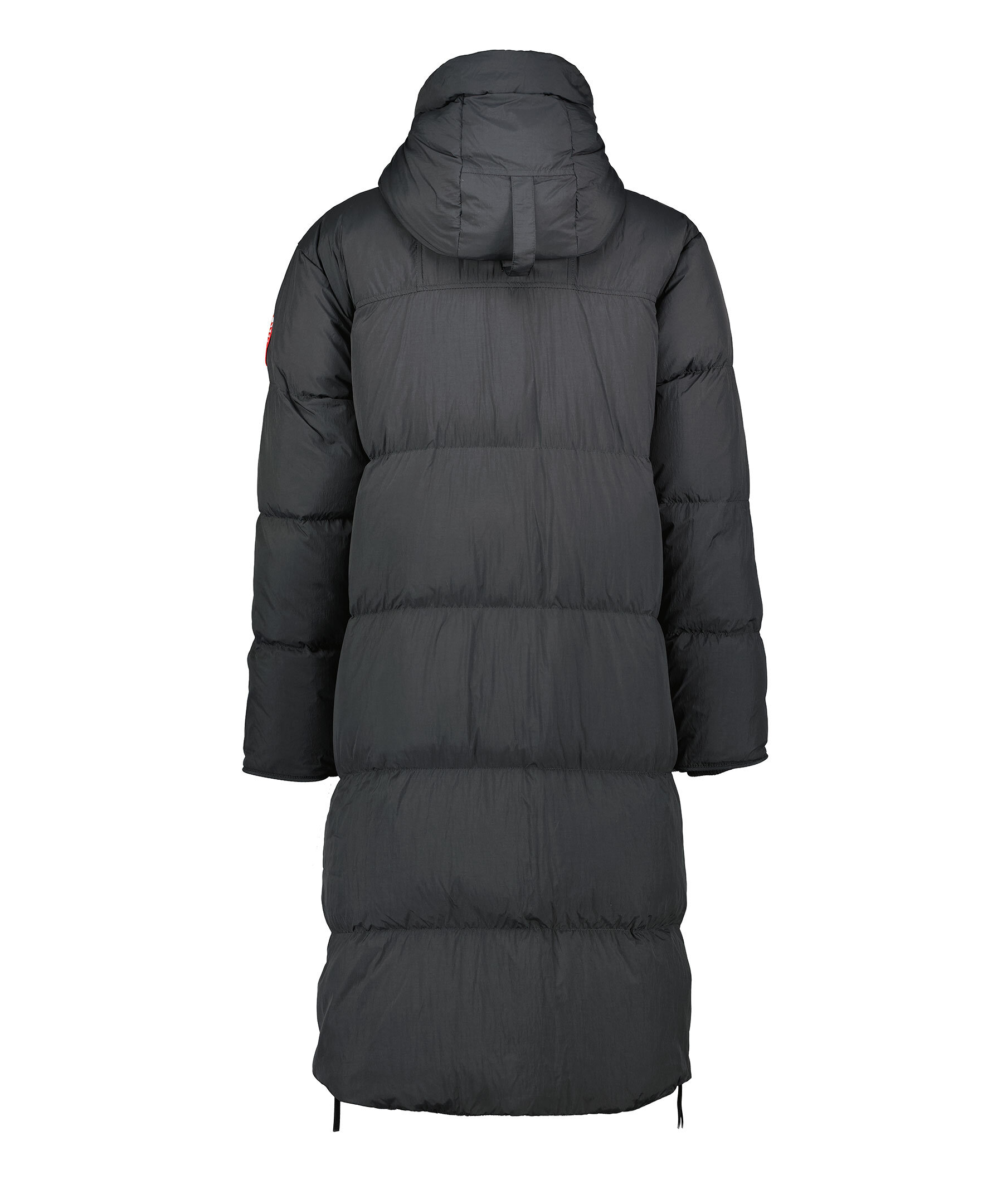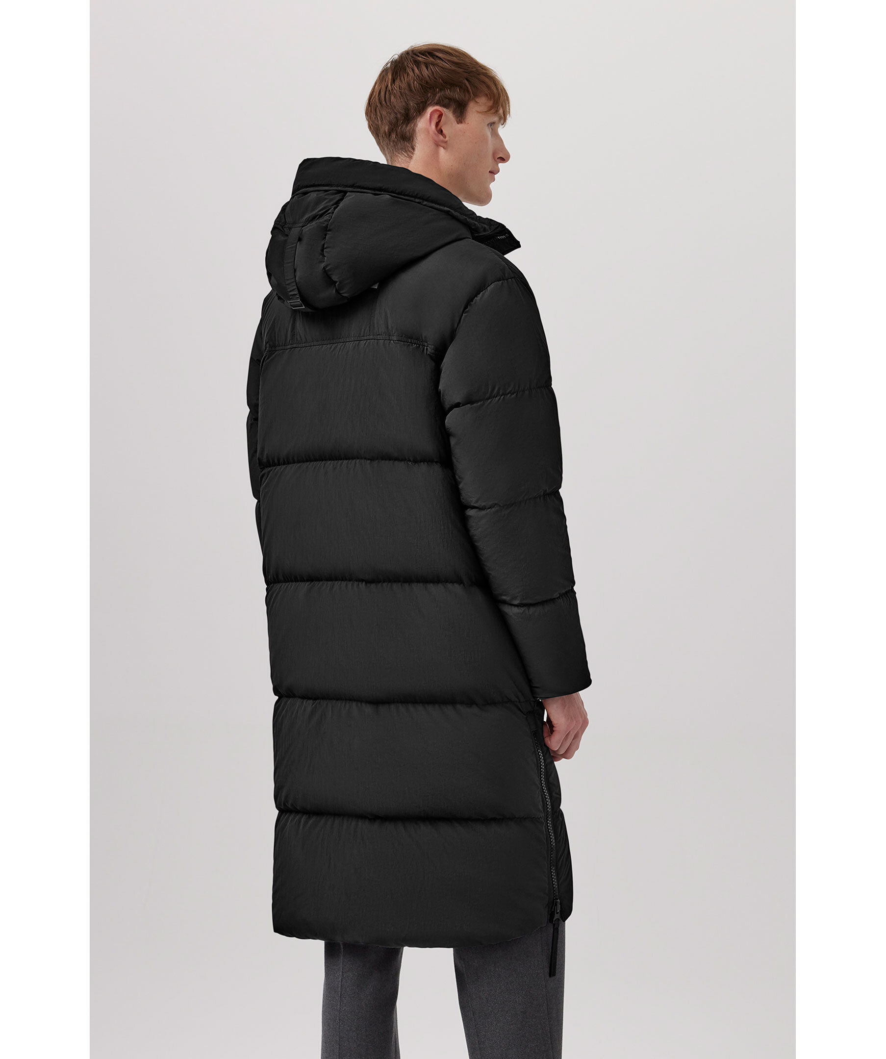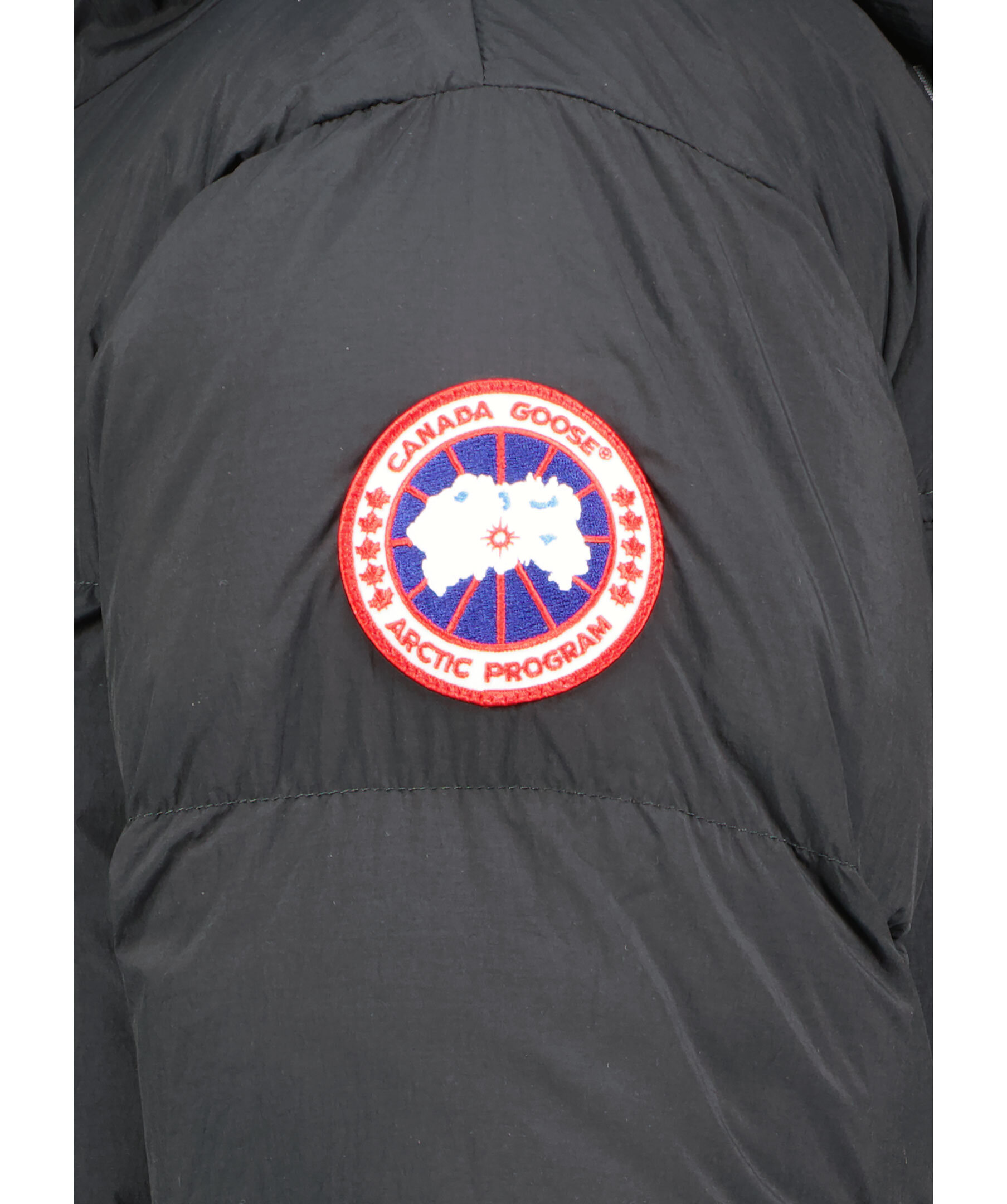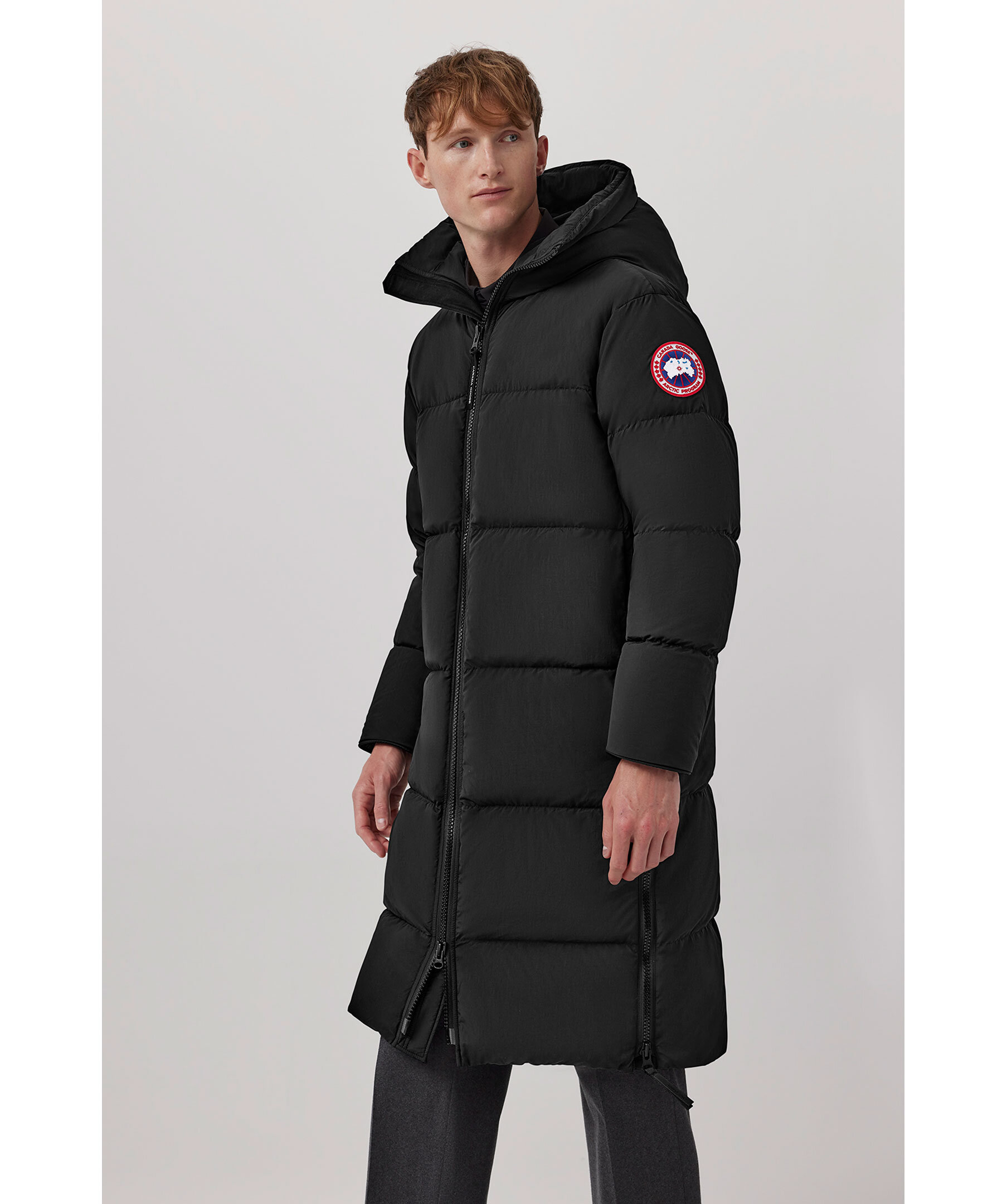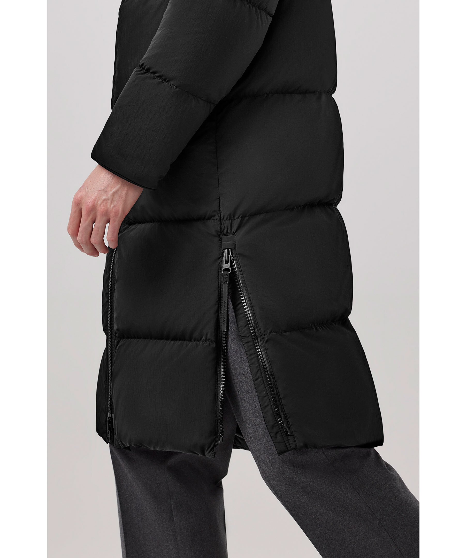 Svart, lång puffer jacka från Canada Goose. Jackan har en tvåvägsdragkedja för att ge bra rörelseomfång samt ventilering. Infällda ribbstickade muddar, två sidöppningar med dragkedja längst ner på jackan. Längre fåll i bak. På ryggen finns en reflekterande grepprem. Två nätinnerfickor och en bröstinnerficka med blixtlås. Jackan har även två elastiska band på insidan som man kan sätta över axlarna och låta jackan hänga fritt om man vill ha den öppen. Broderad patch med logotyp på vänster ärm. En lättviktsjacka med tyg som är vattenavstötande. Tillverkad av återvunnen nylon med en dunstoppning.