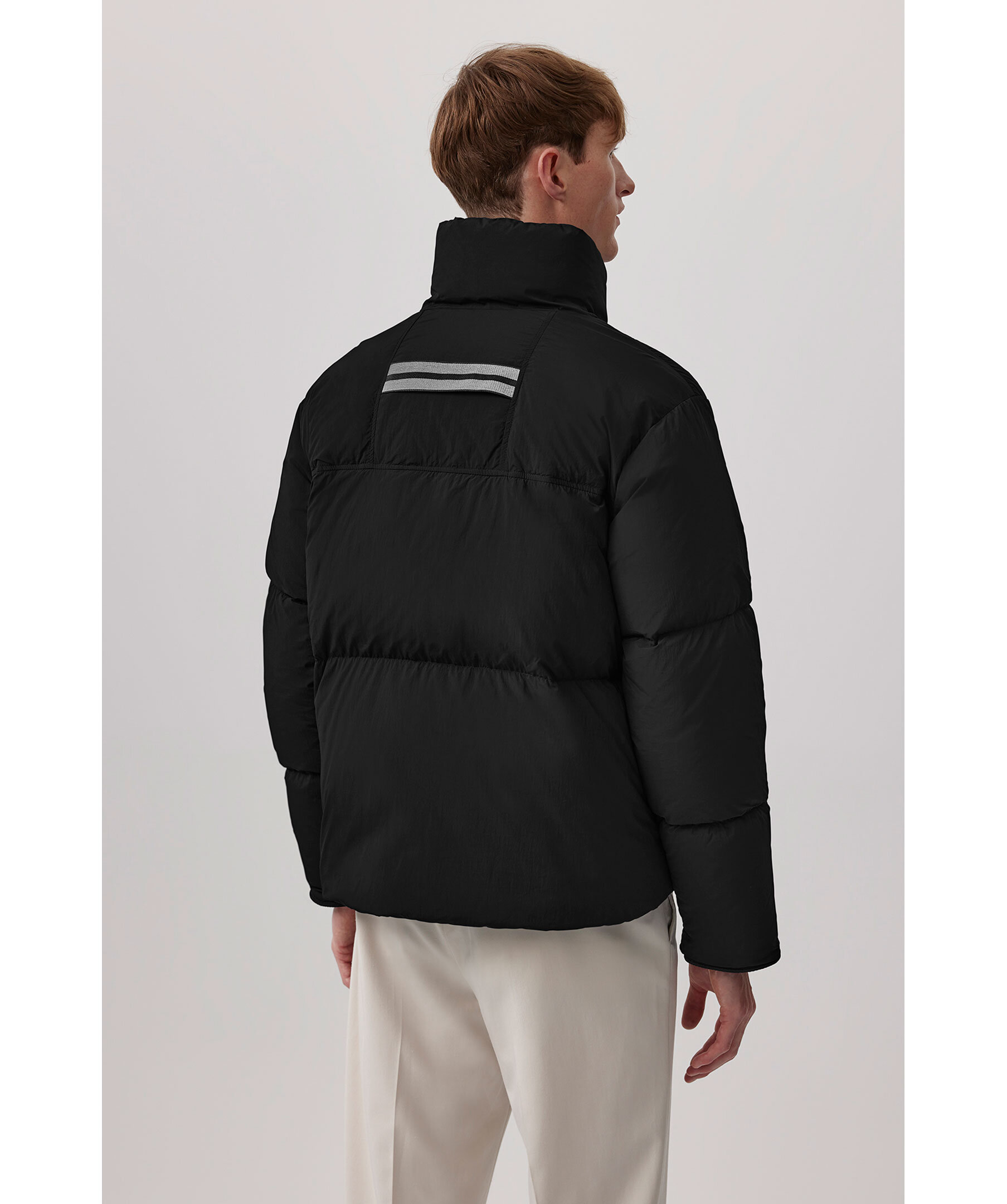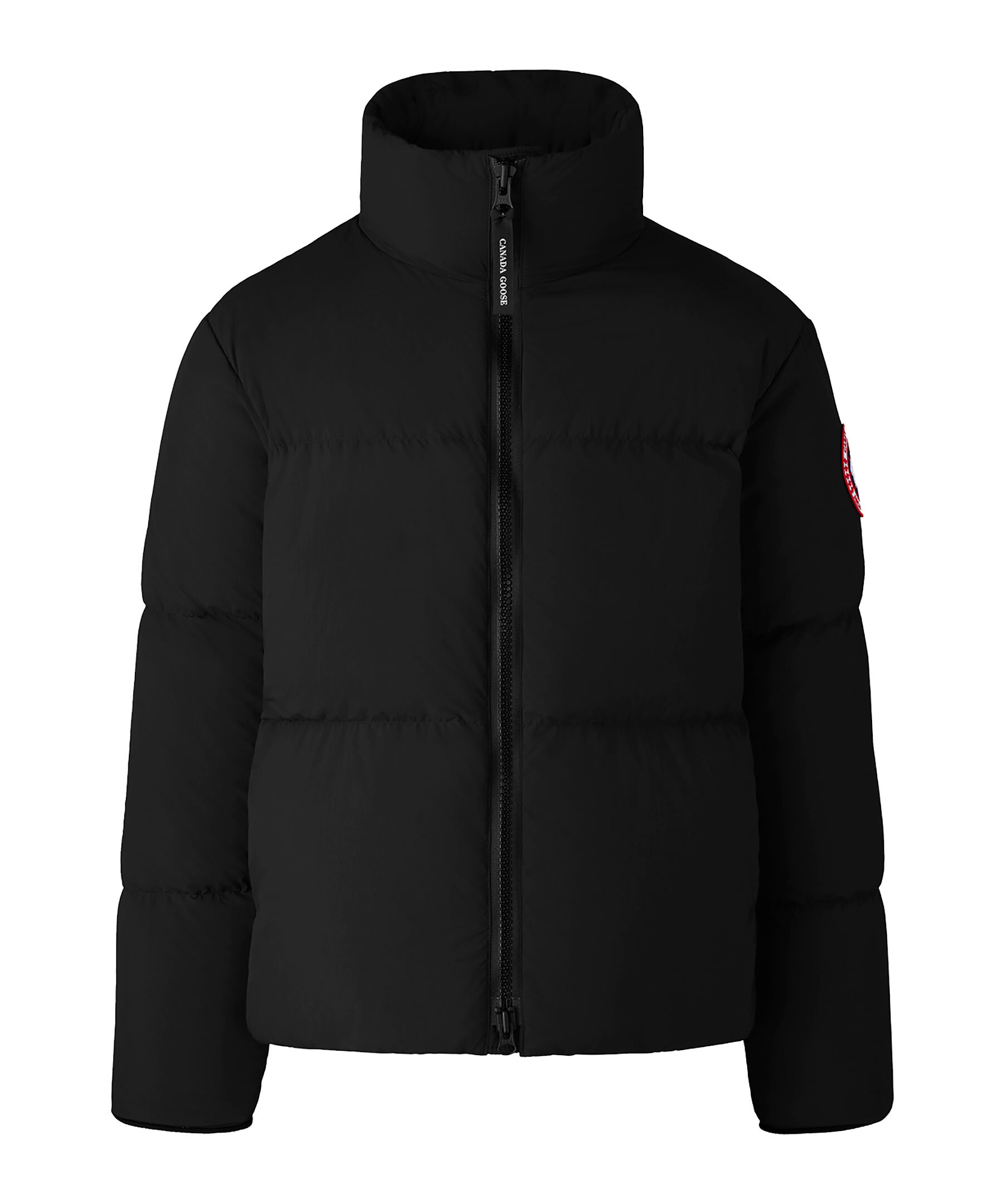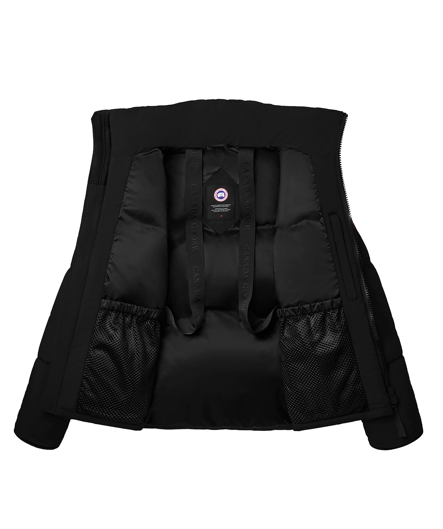 Svart pufferjacka från Canada Goose. Jackan stängs med tvåvägsdragkedja och har två fickor med dragkedja, tre invändiga fickor - två meshfickor och en säkerthetsficka med dragkedja. Den har invändiga ryggsäcksremmar så jackan kan bäras handsfree, reflekterande dubbelrandig grepprem på ryggen samt strukturerad dunfylld krage och patch-logotyp på vänster ärm. Tillverkad i återvunnen nylon med dunfyllning.