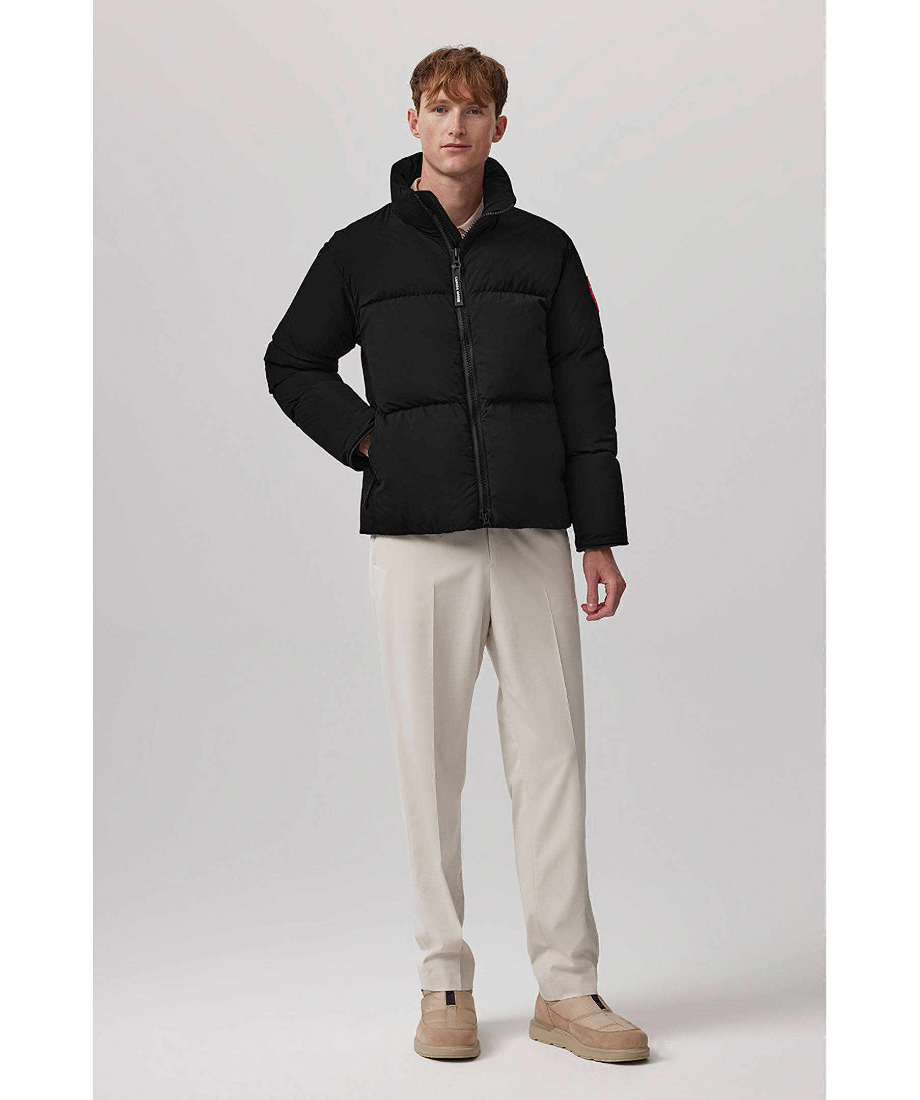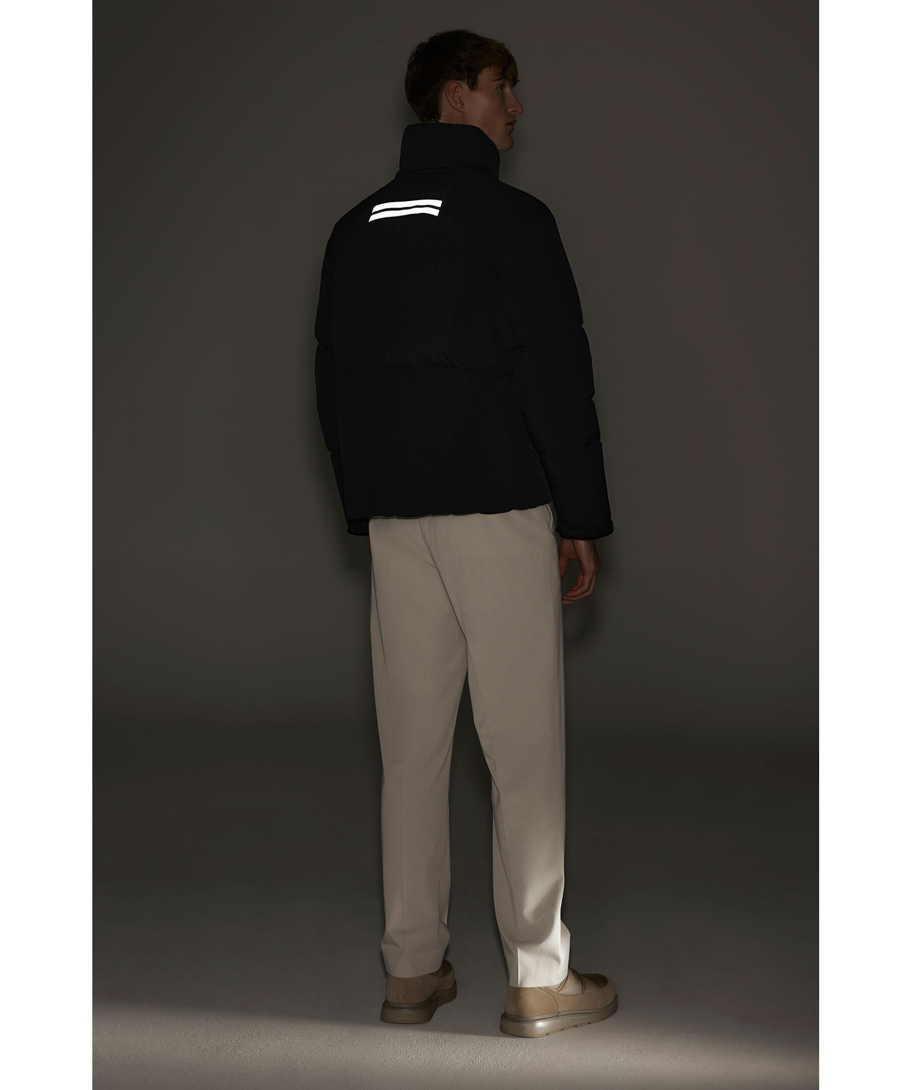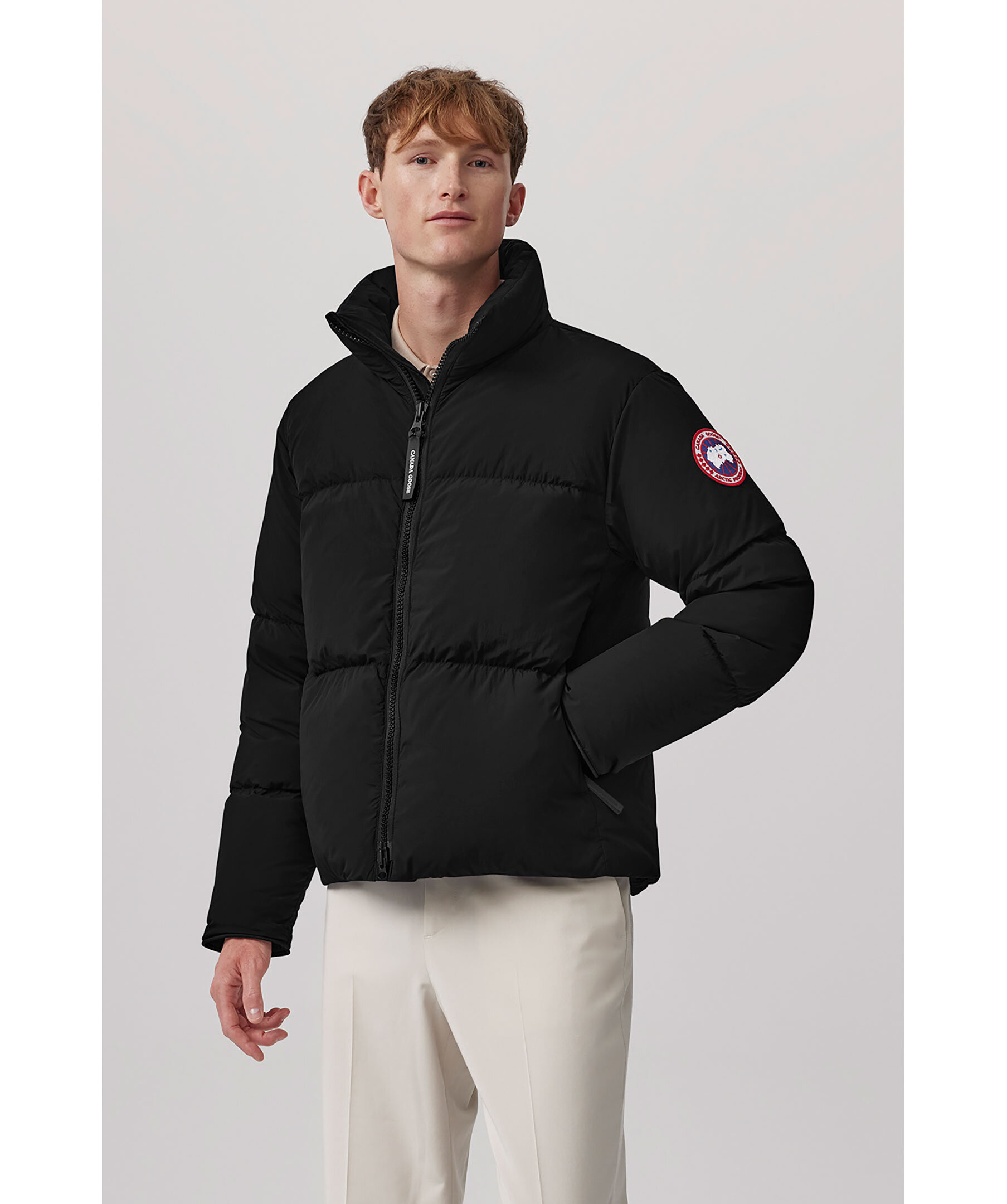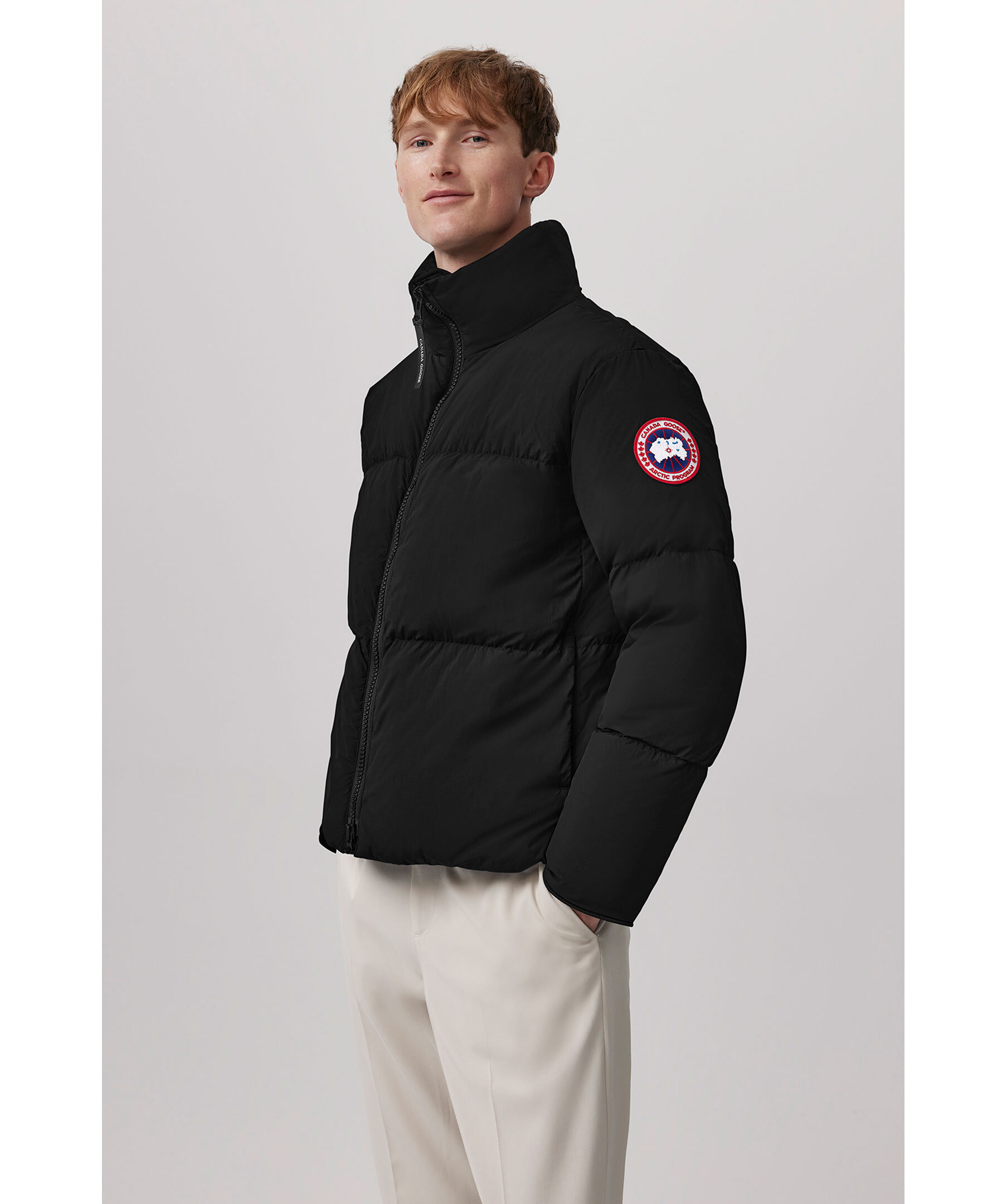 Svart pufferjacka från Canada Goose. Jackan stängs med tvåvägsdragkedja och har två fickor med dragkedja, tre invändiga fickor - två meshfickor och en säkerthetsficka med dragkedja. Den har invändiga ryggsäcksremmar så jackan kan bäras handsfree, reflekterande dubbelrandig grepprem på ryggen samt strukturerad dunfylld krage och patch-logotyp på vänster ärm. Tillverkad i återvunnen nylon med dunfyllning.