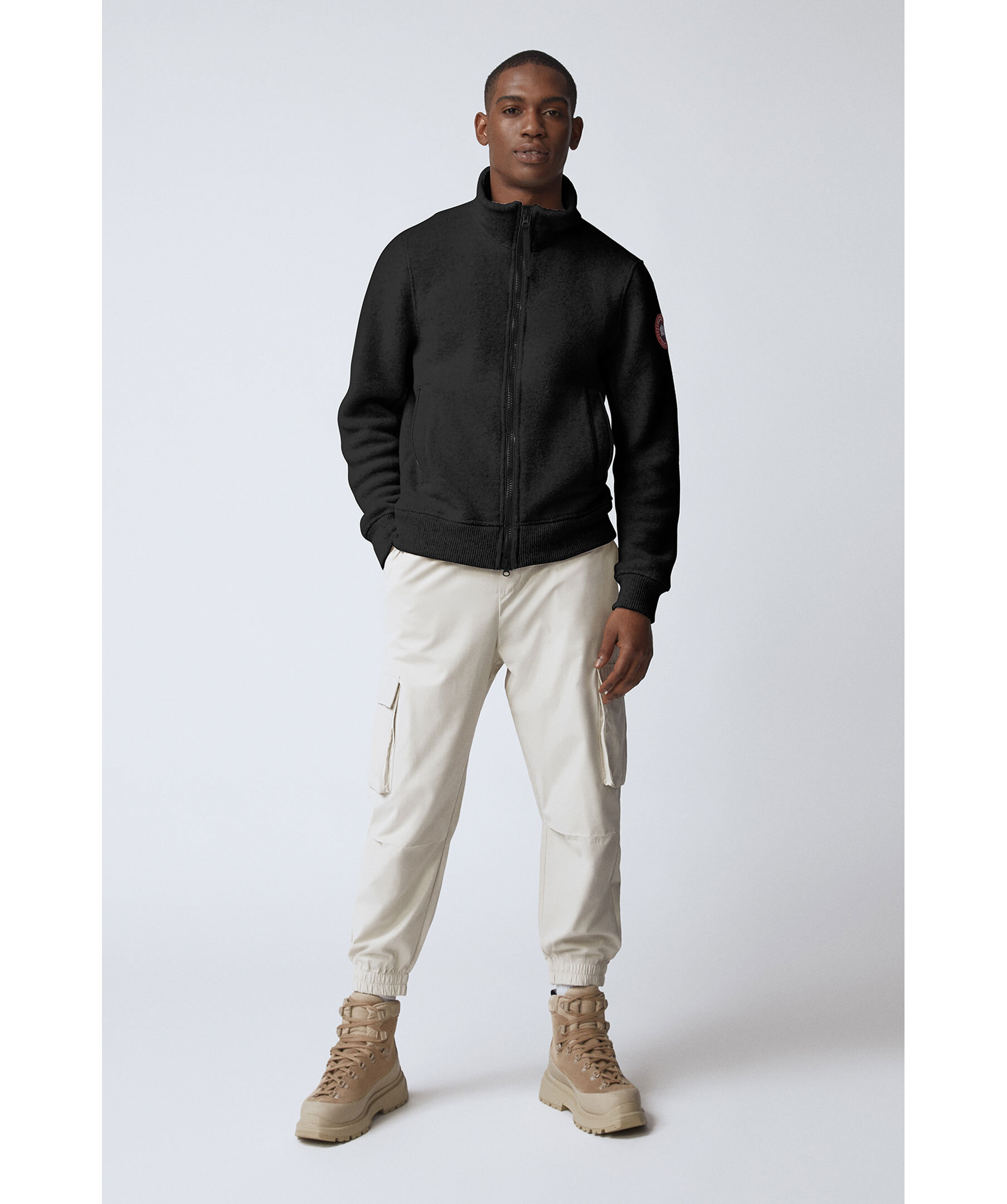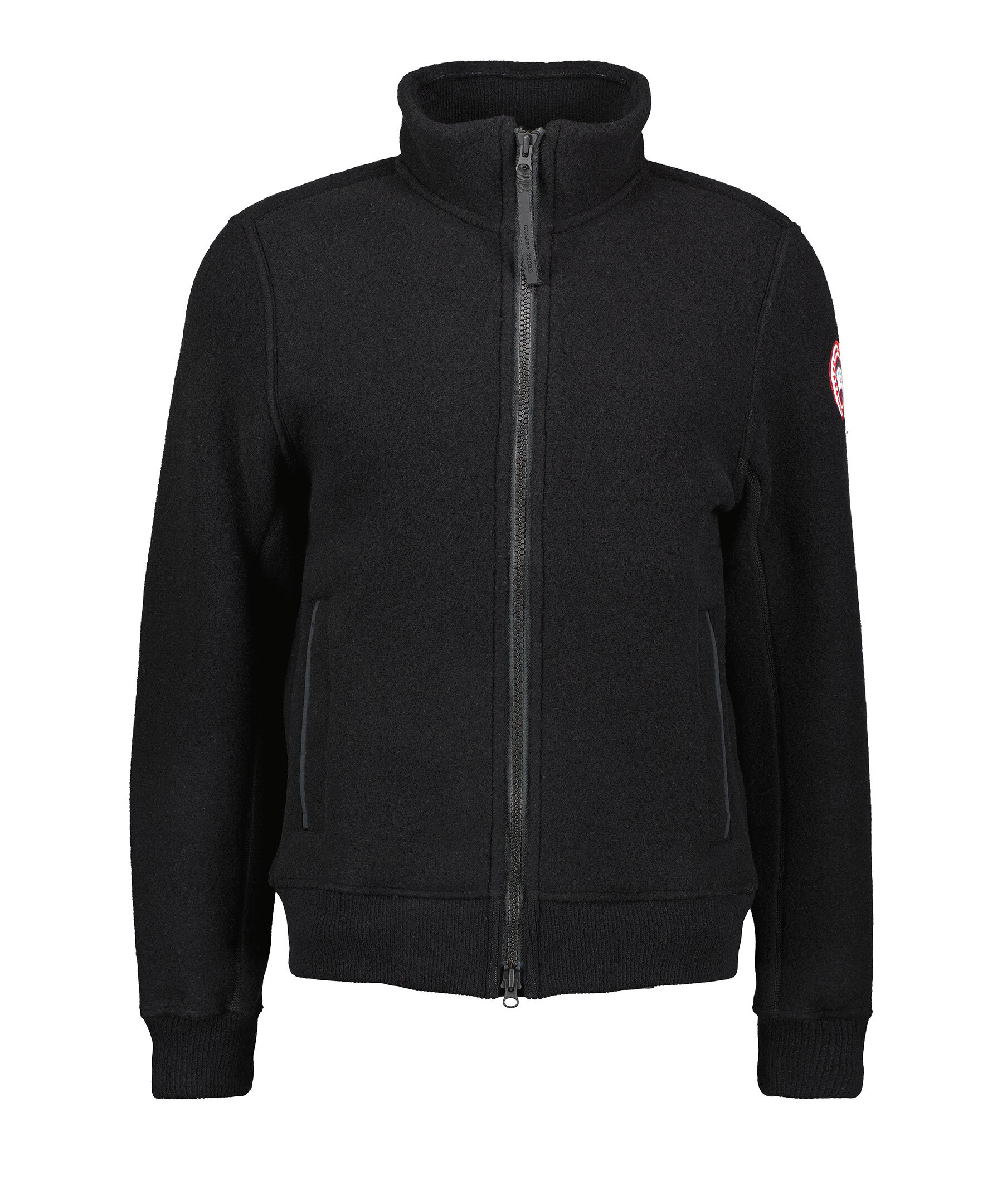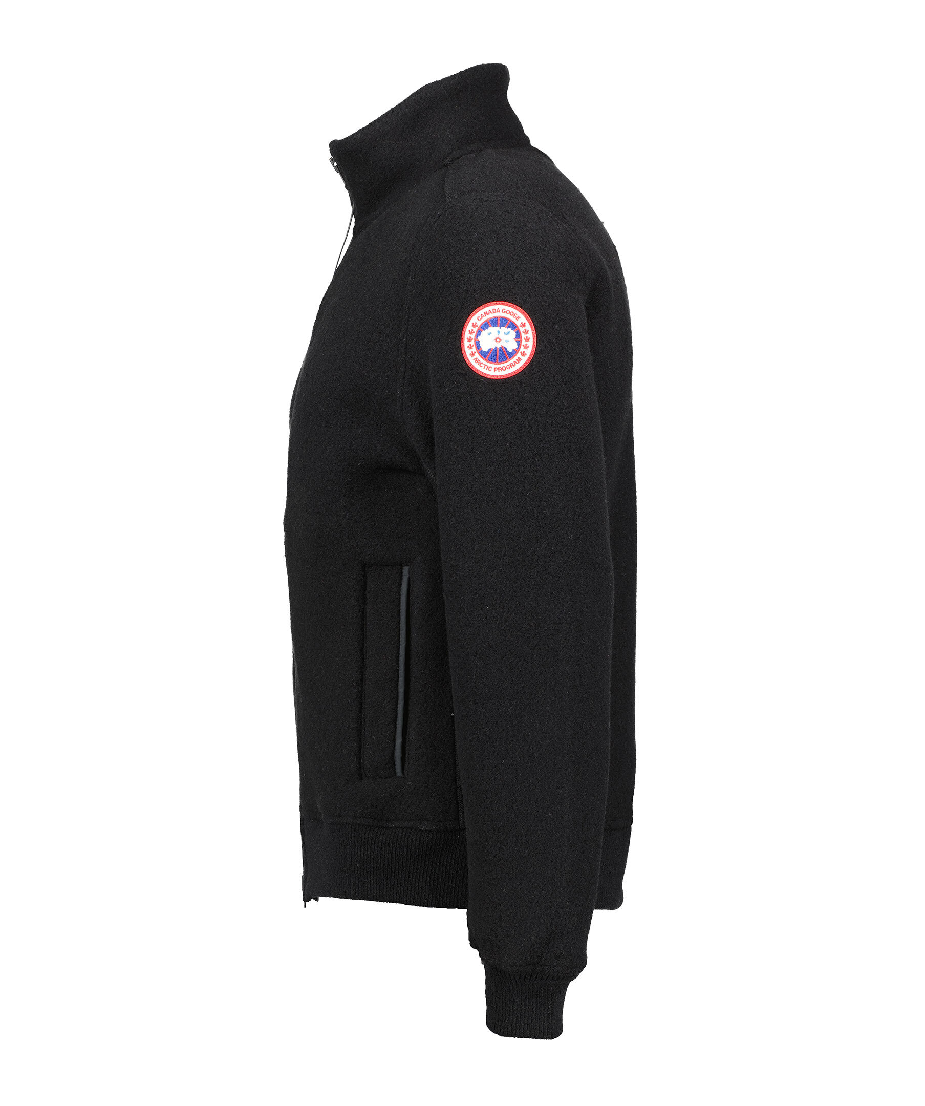Svart tröja från Canada Goose. Tröjan har dragkedja fram, långa ärmar med ribbade ärmslut. Två sidofickor som stängs med tryckknapp, ribbad fåll samt ståkrage. Klassisk Canada Goose logga på vänster ärm. Tillverkad av en återvunnen ullblandning.