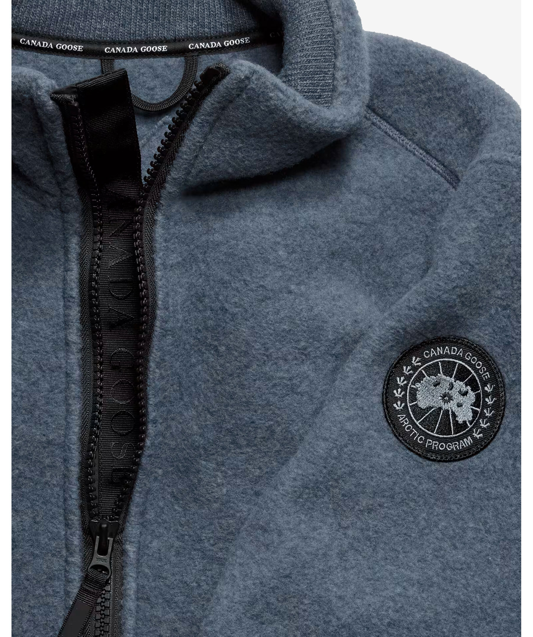 Blå fleecetröja från Canada Goose. Tröjan har dragkedja fram, långa ärmar med ribbade ärmslut. Två sidofickor som stängs med tryckknapp, ribbad fåll samt ståkrage. Klassisk Canada Goose logga på vänster ärm. Tillverkad av en återvunnen ullblandning.