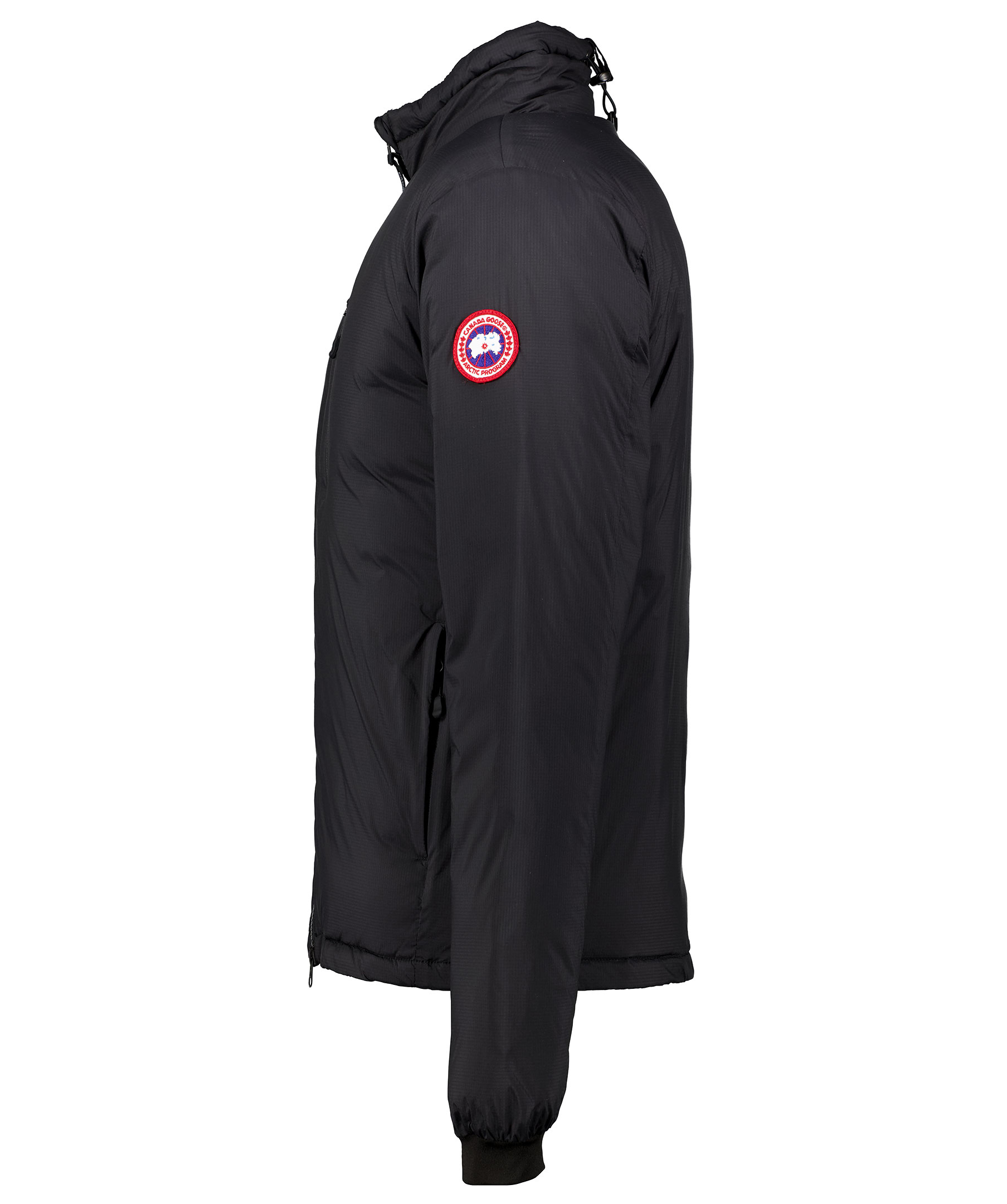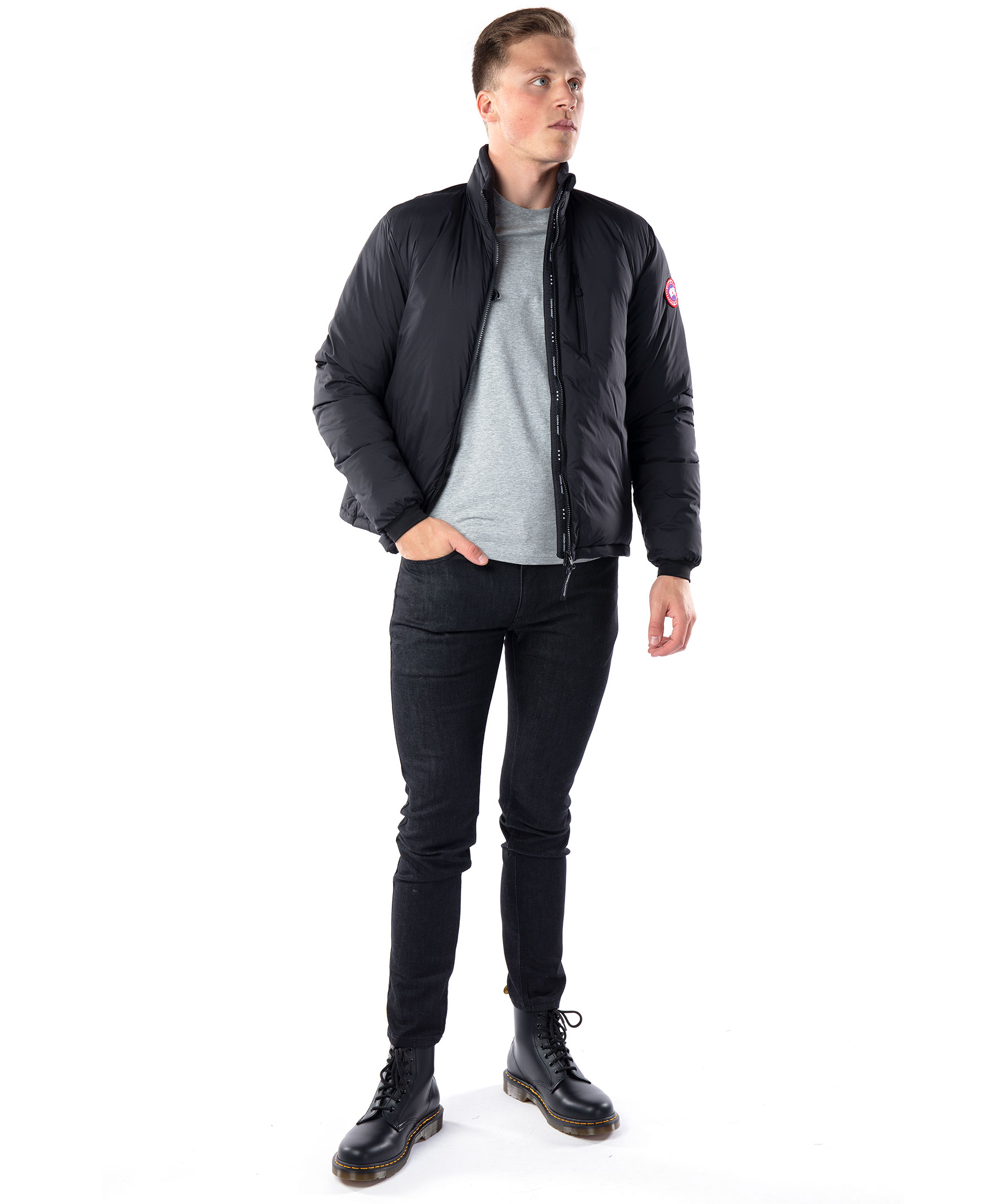 Svart, varm och vindtät lättviktsdunjacka från Canada Goose. Den är perfekt till olika aktiviteter och är lätt att packa med sig. Quiltad på insidan för jämn värmefördelning samt dragsko nertill för optimal isolering. Sidofickor samt bröstficka med dragkedja samt två innerfickor, varav den stora innerfickan kan användas som en resekudde när jackan packas in i den. Skön mudd vid ärmslut, tvåvägsdragkedja och kort krage med dragsko i nacken. Modellen är 190 cm lång och bär storlek M.