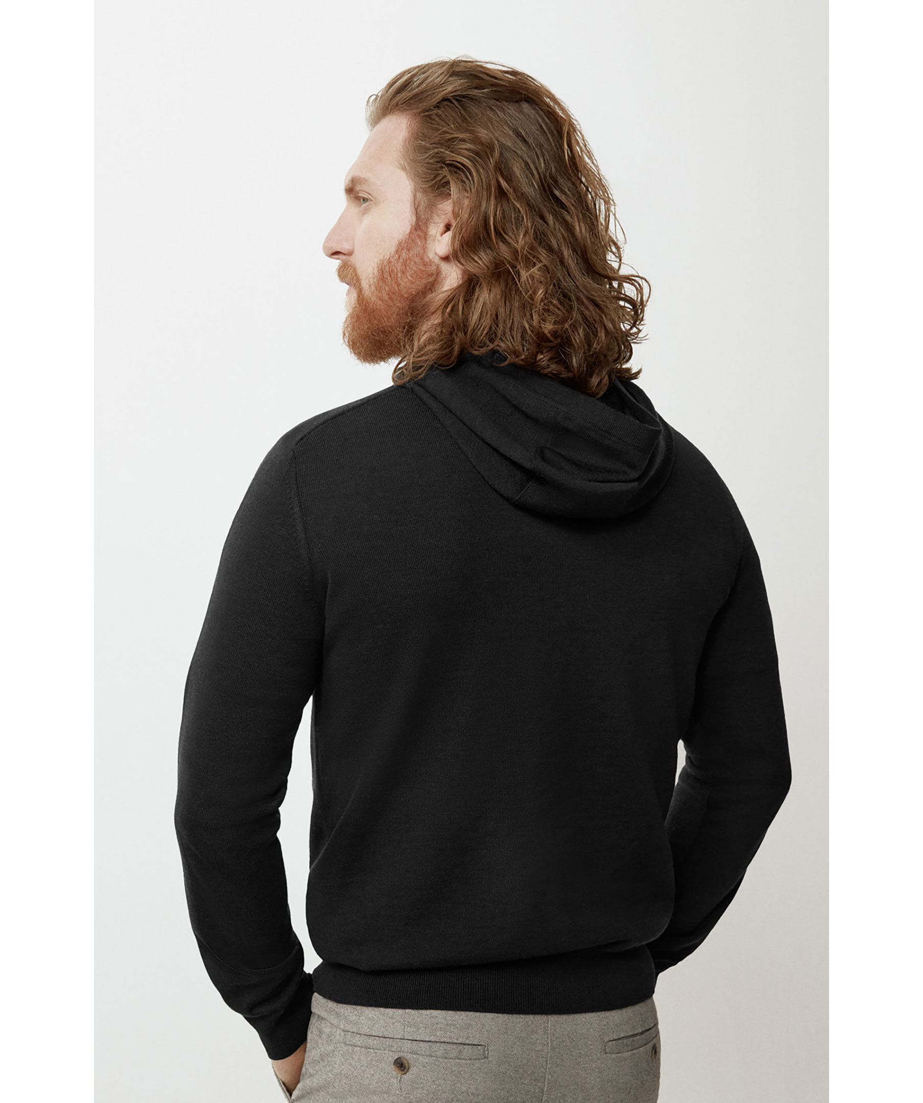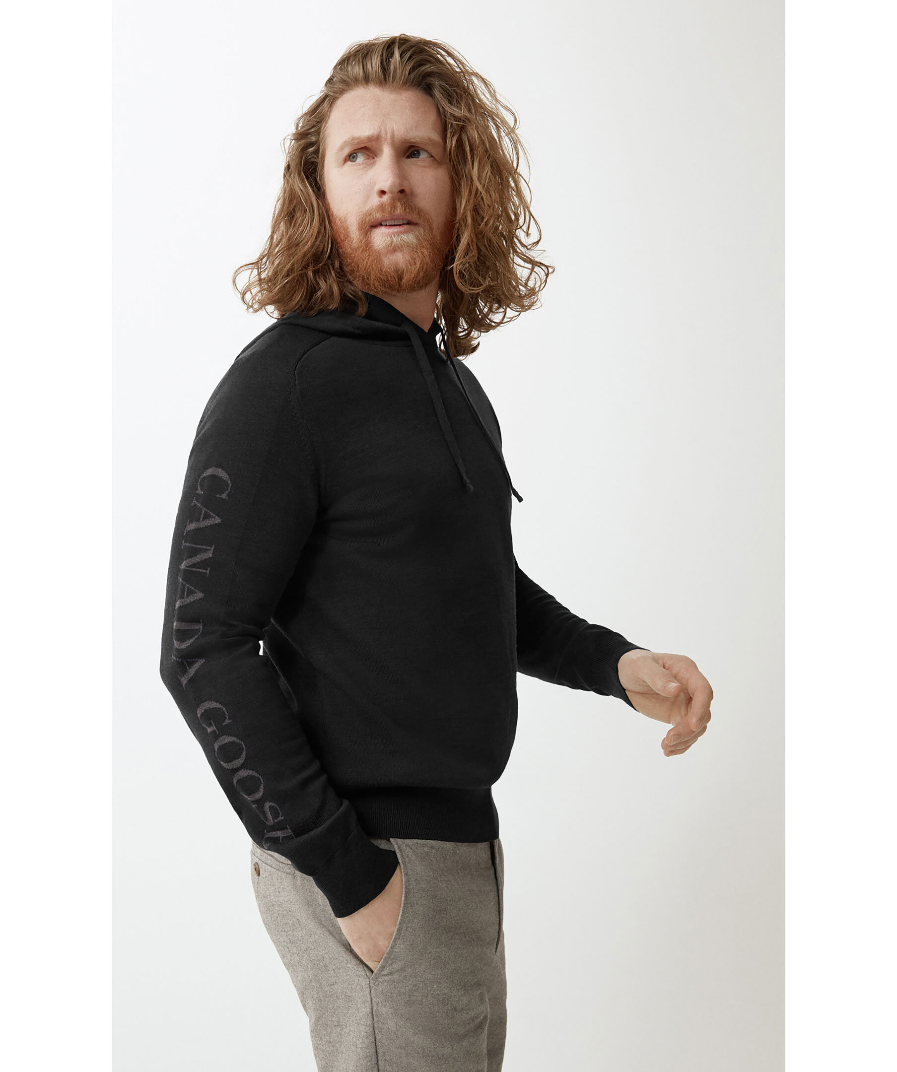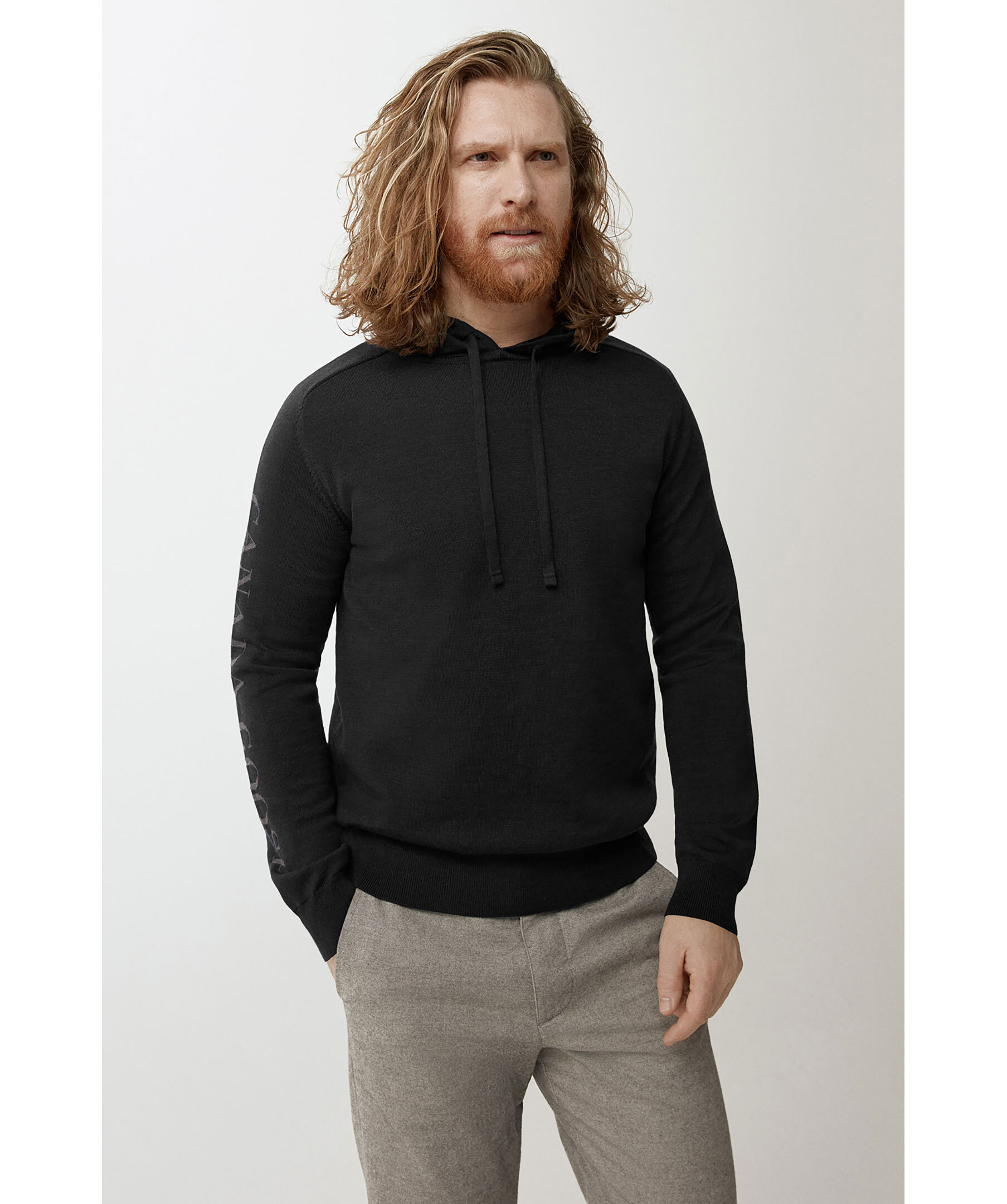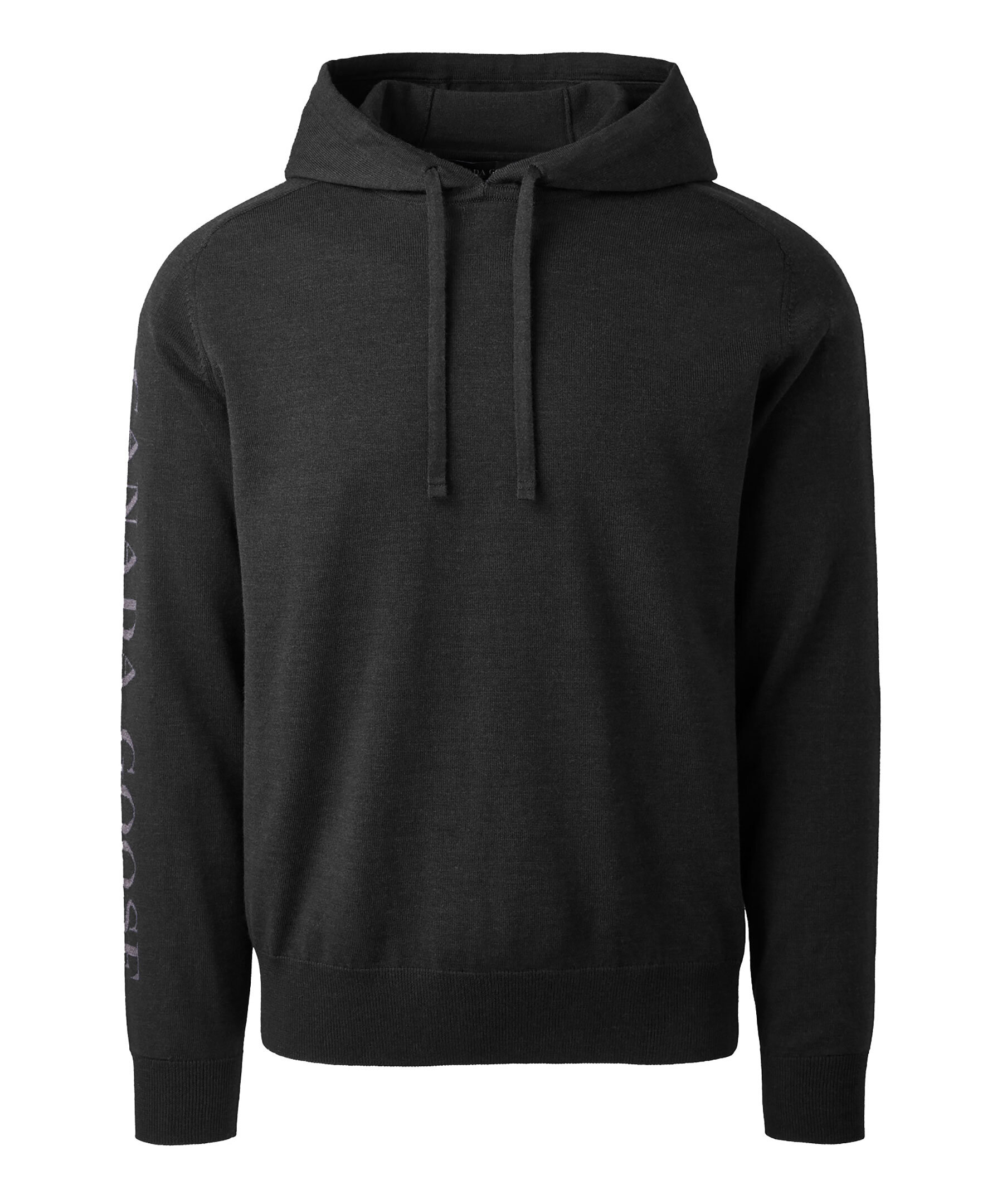 Svart finstickad Hoodie i merinoull från Canada Goose. Luva med snörning. Svart logotyp längst höger ärm. Ribbstickade muddar.