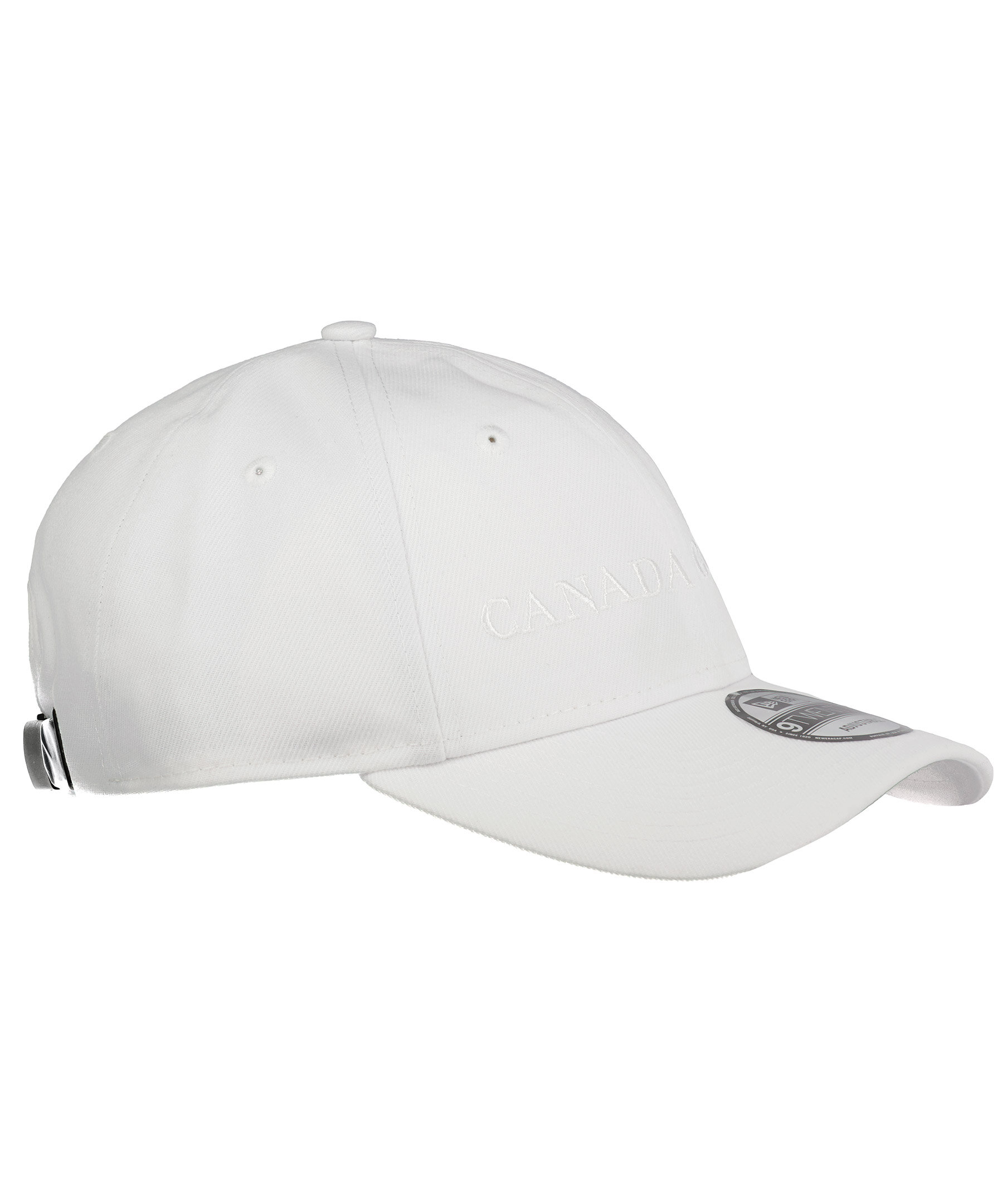 Vit keps från Canada Goose. Broderad logotyp i vitt fram. kepsen är justerbar med hjälp av spänne baktill.