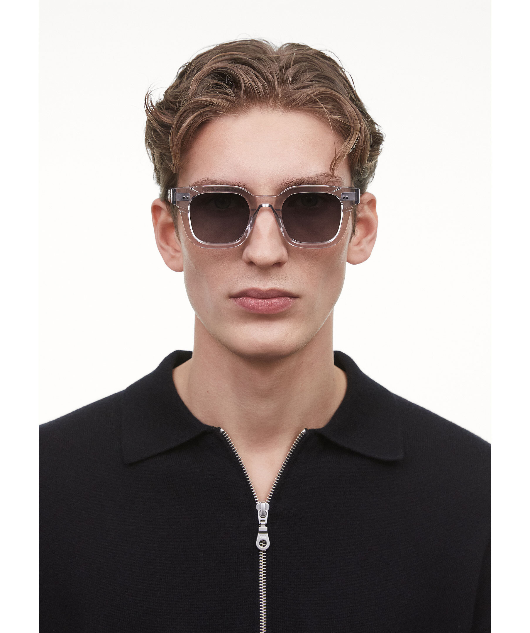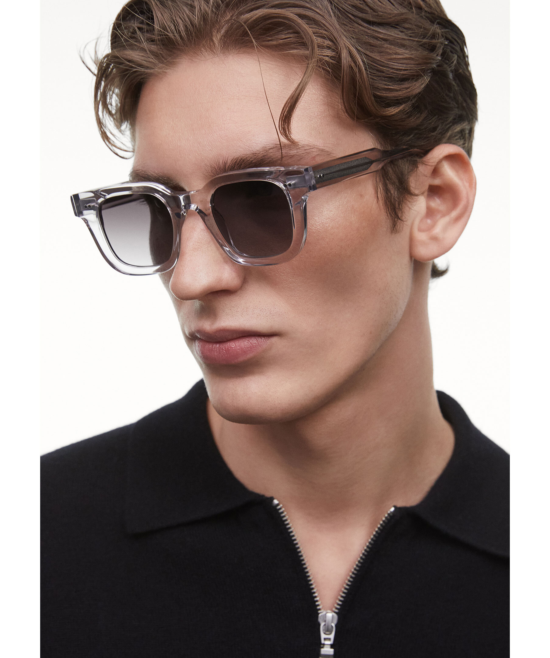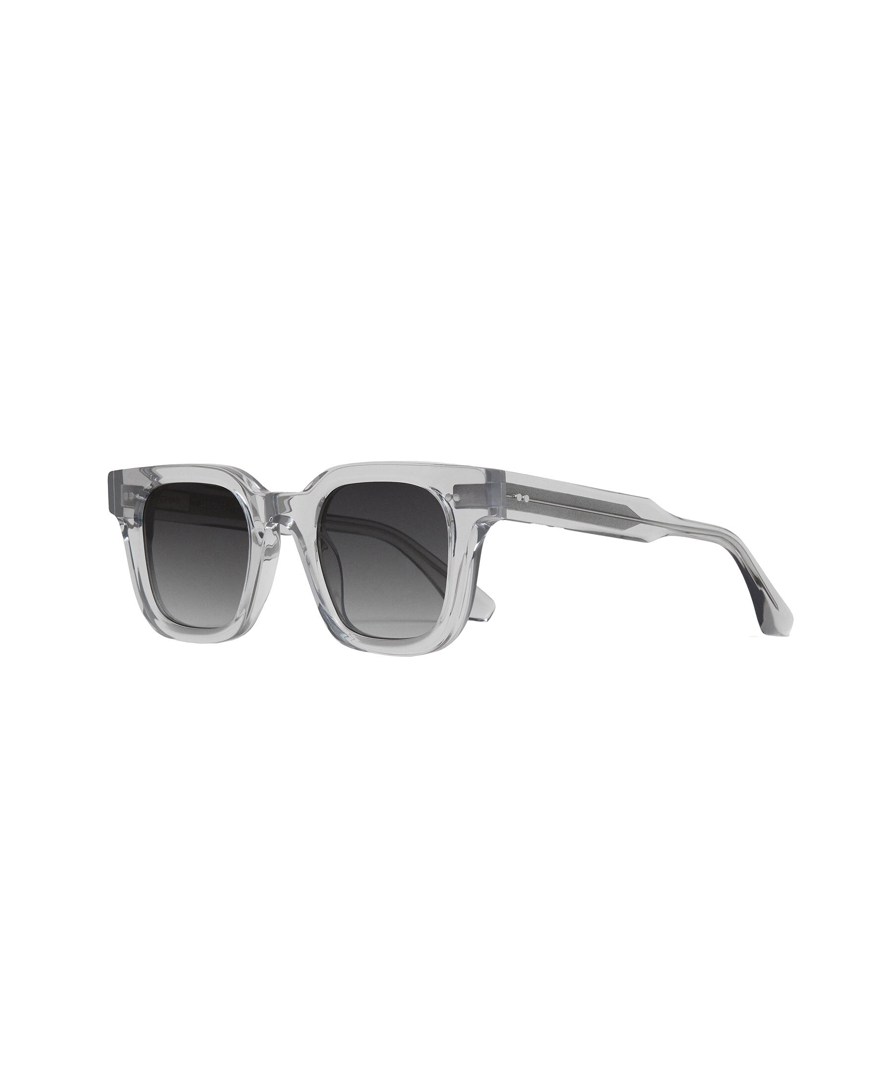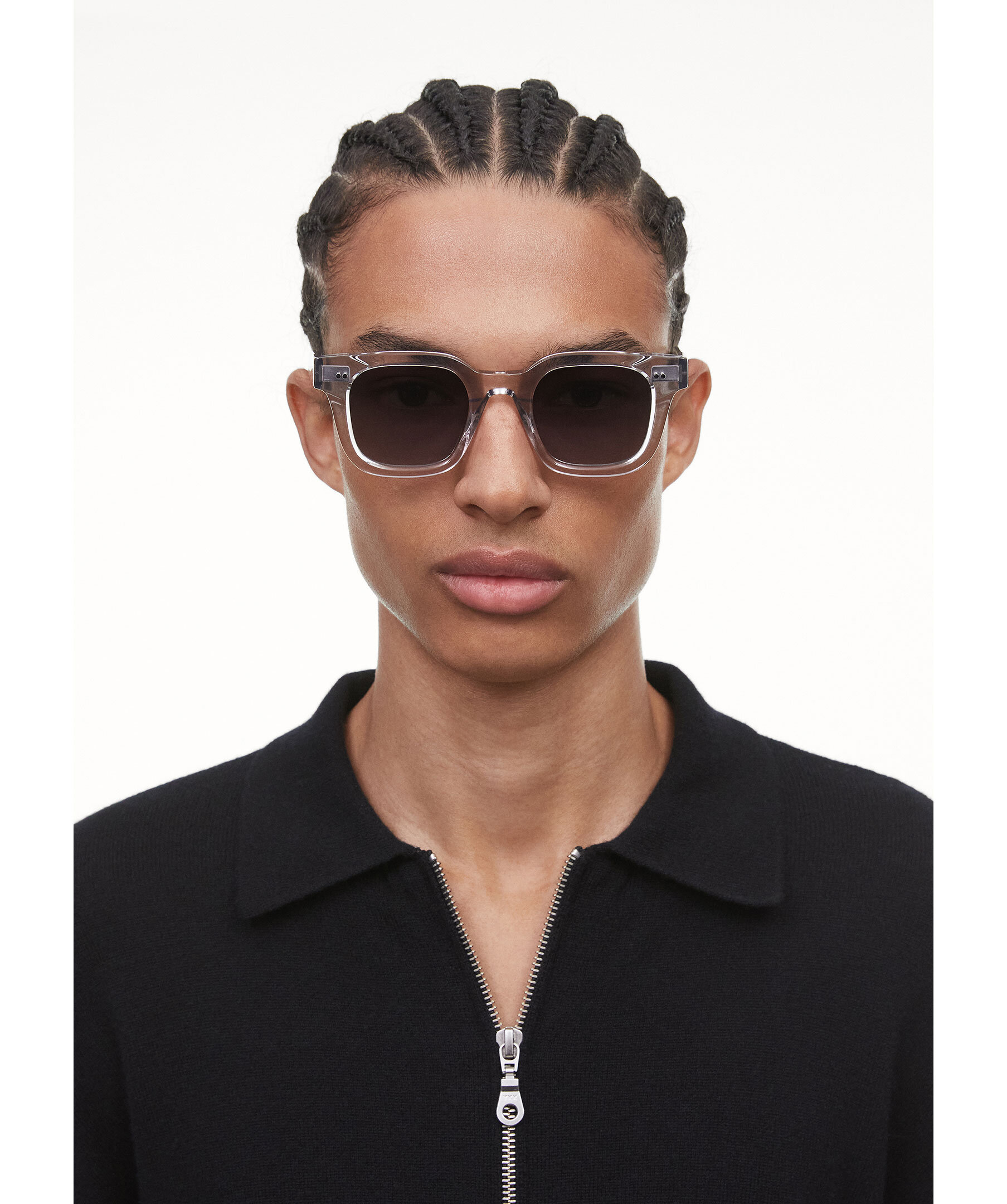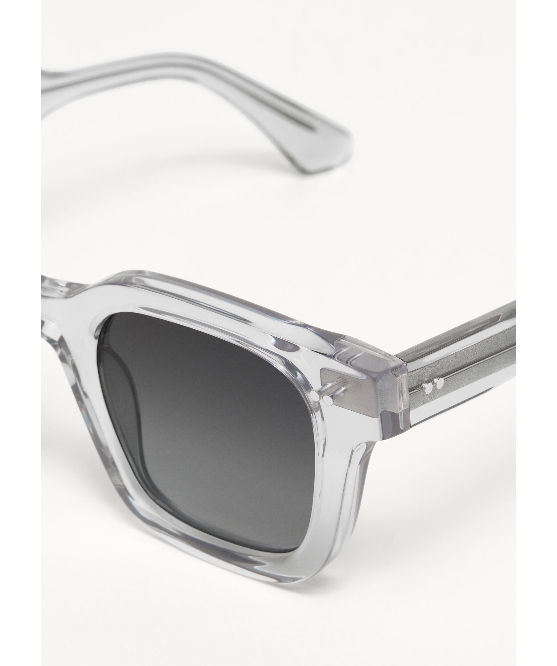 Gråa, transparenta solglasögon i modell 04 från Chimi. 04 är en stilistisk siluett som skapar dynamisk kontrast med en stark rektangulär ram och smala sidor. Färdig med silverfärgade nitgångjärn och djupa fasade snitt längs de UV-skyddande, platta CR39-linserna.