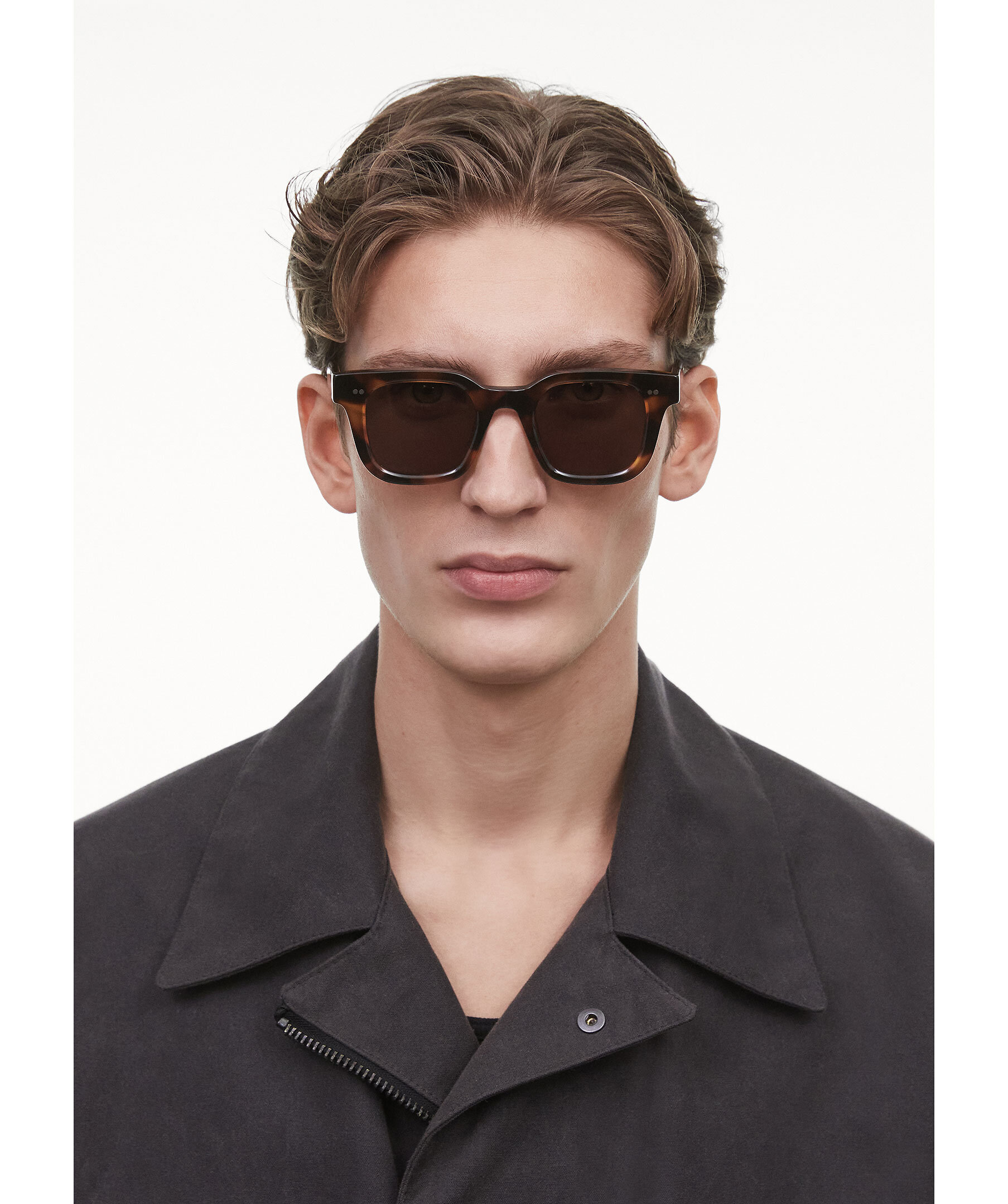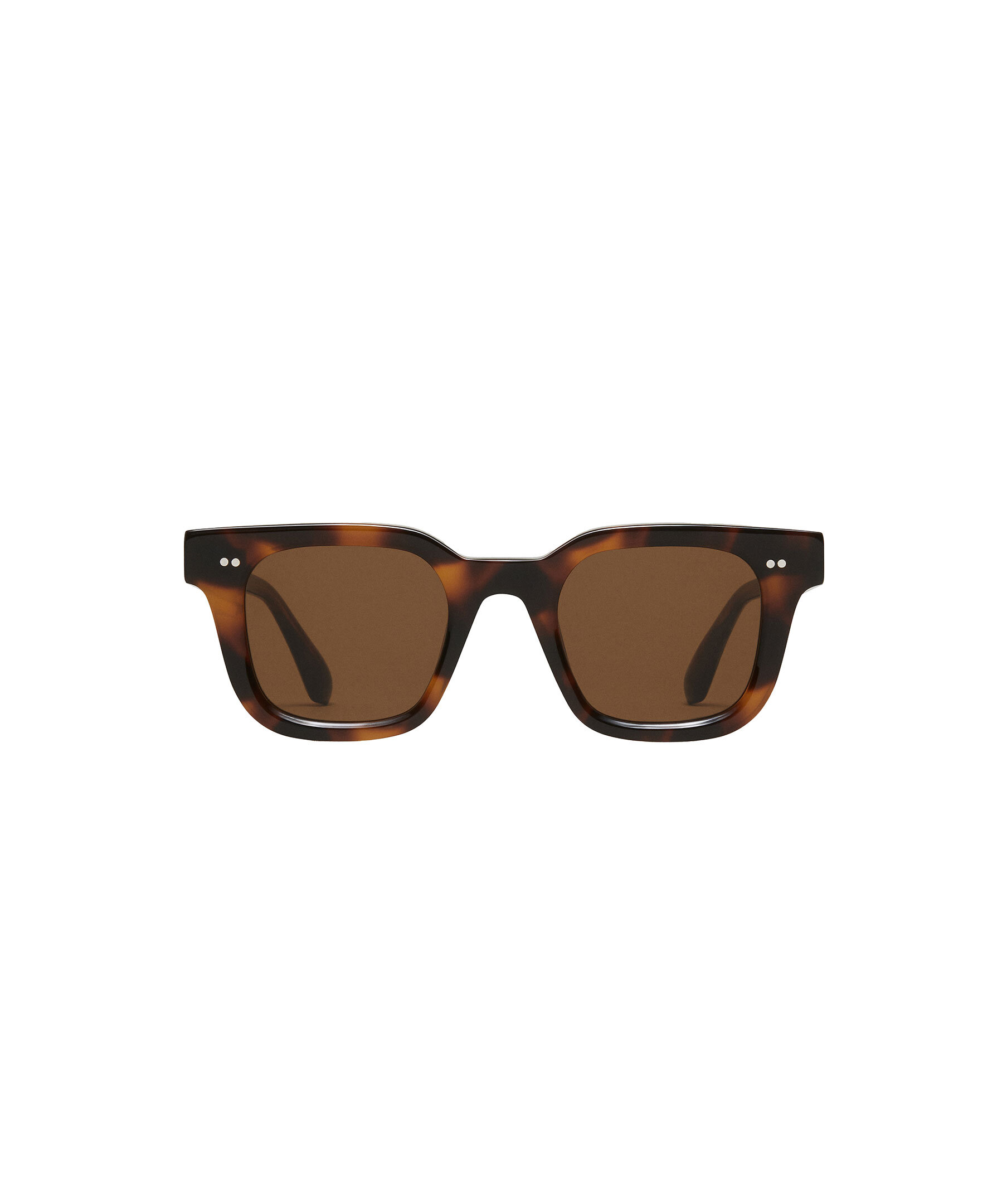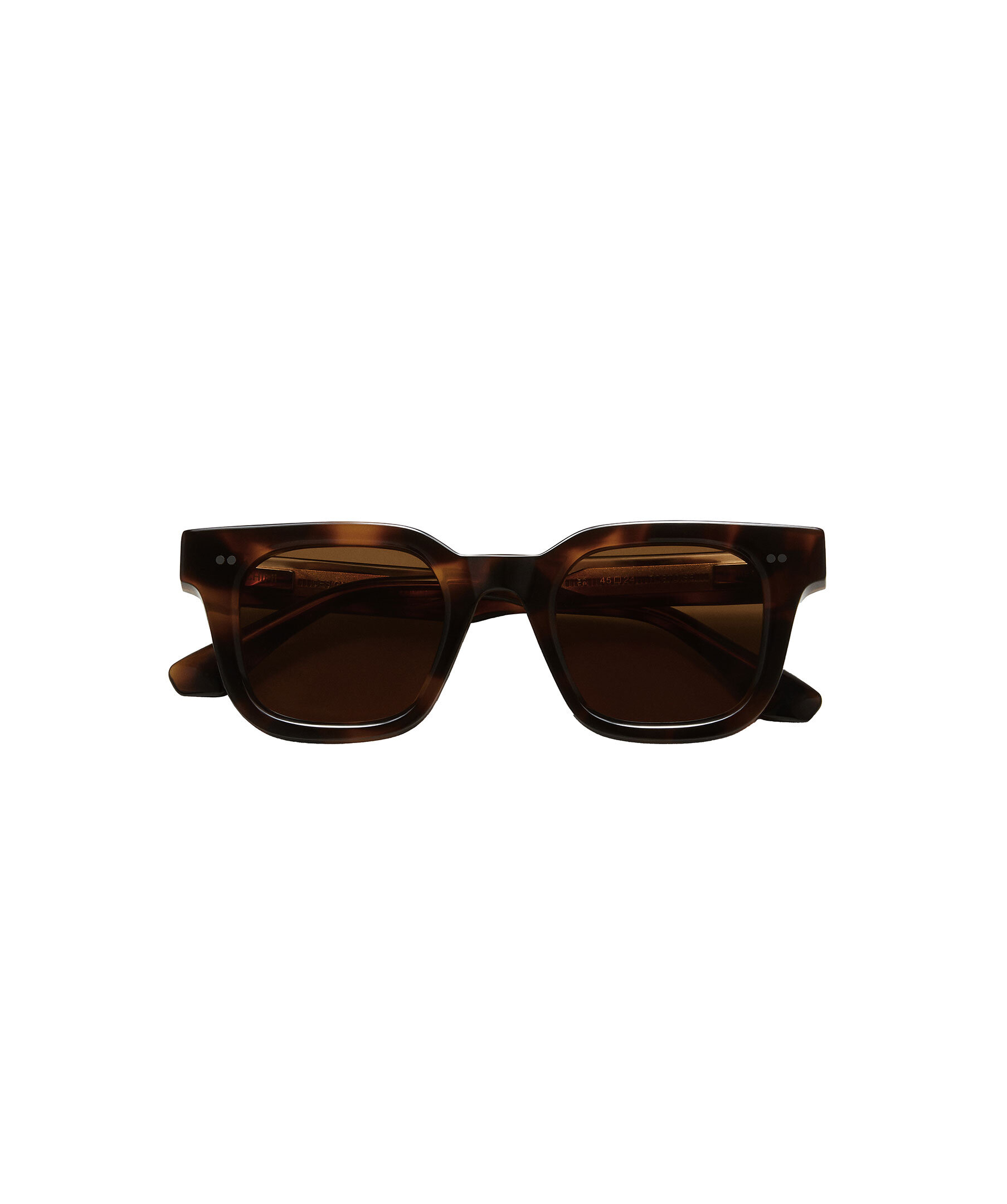 Bruna solglasögon med sköldpaddsliknande mönster i modell 04 från Chimi. 04 är en stilistisk siluett som skapar dynamisk kontrast med en stark rektangulär ram och smala sidor. Färdig med silverfärgade nitgångjärn och djupa fasade snitt längs de UV-skyddande, platta CR39-linserna.