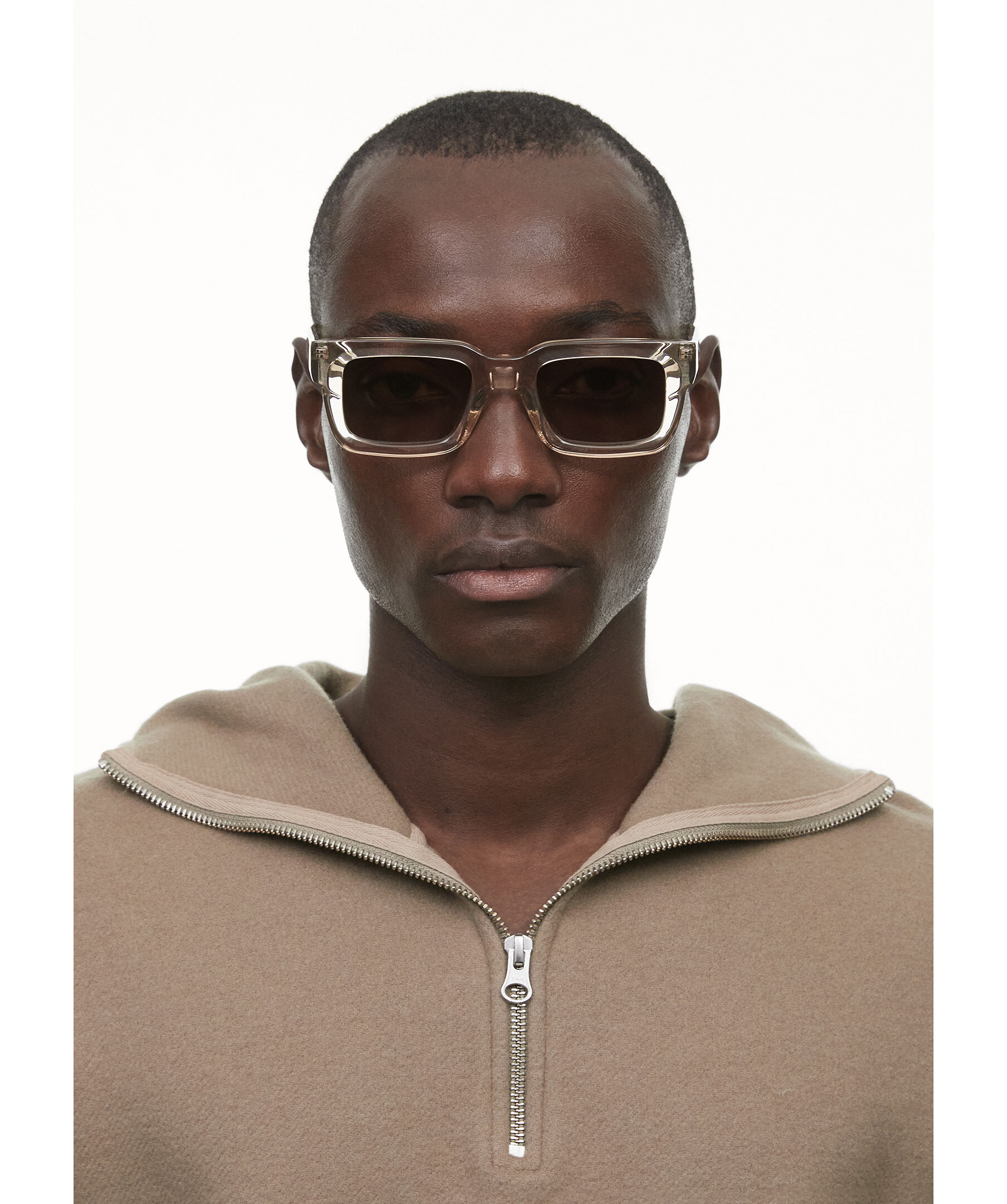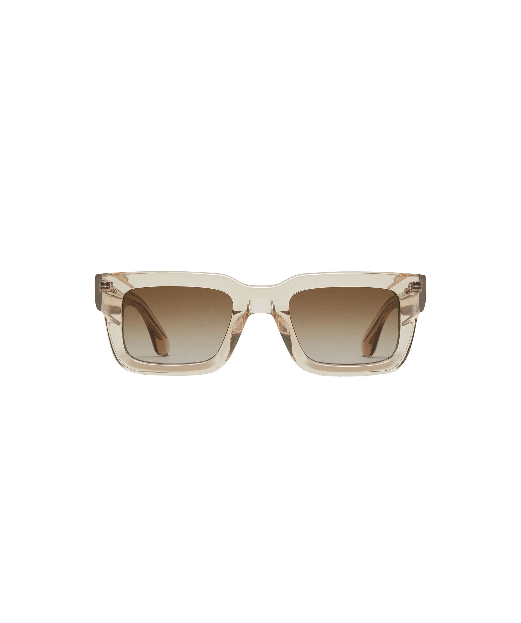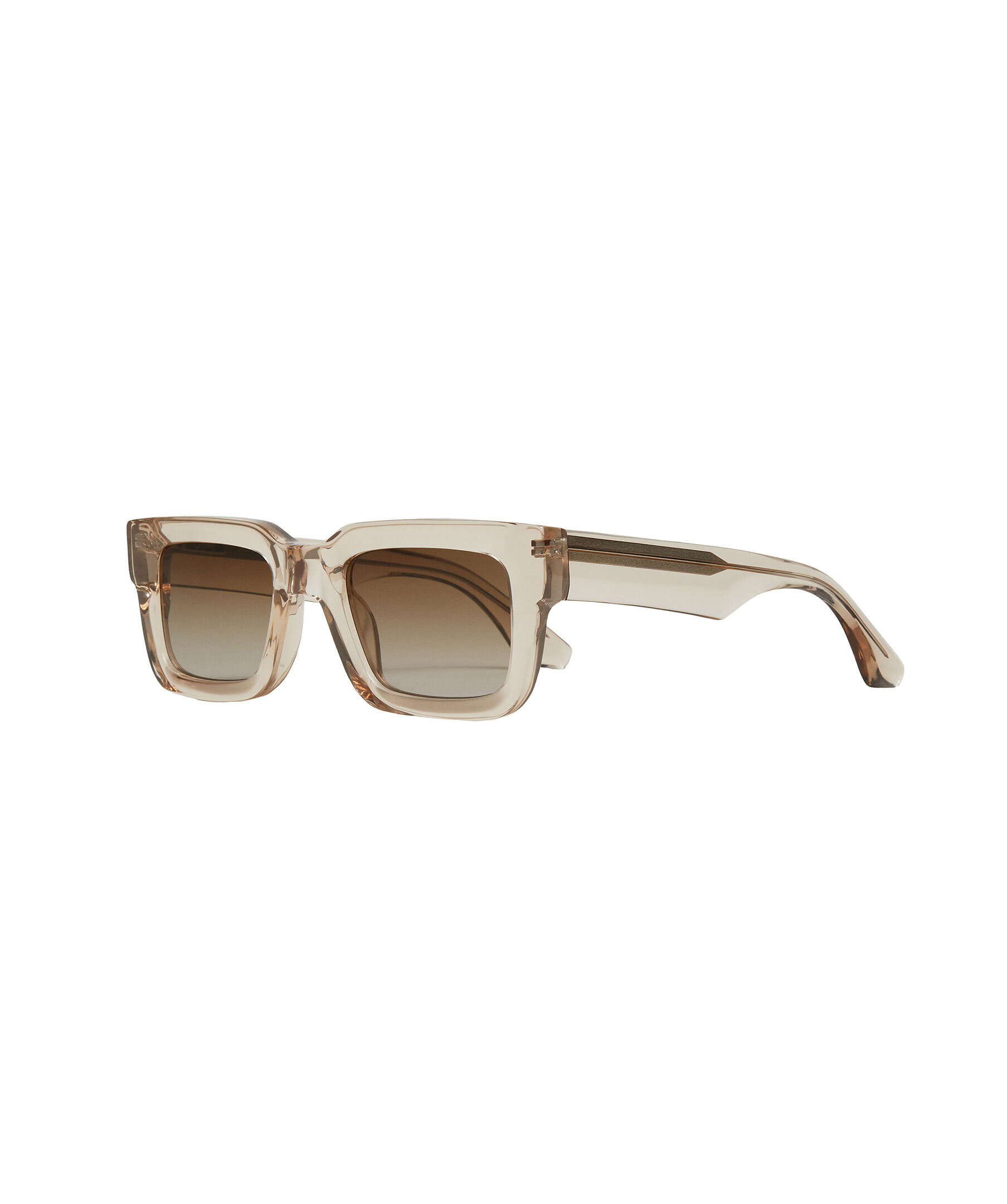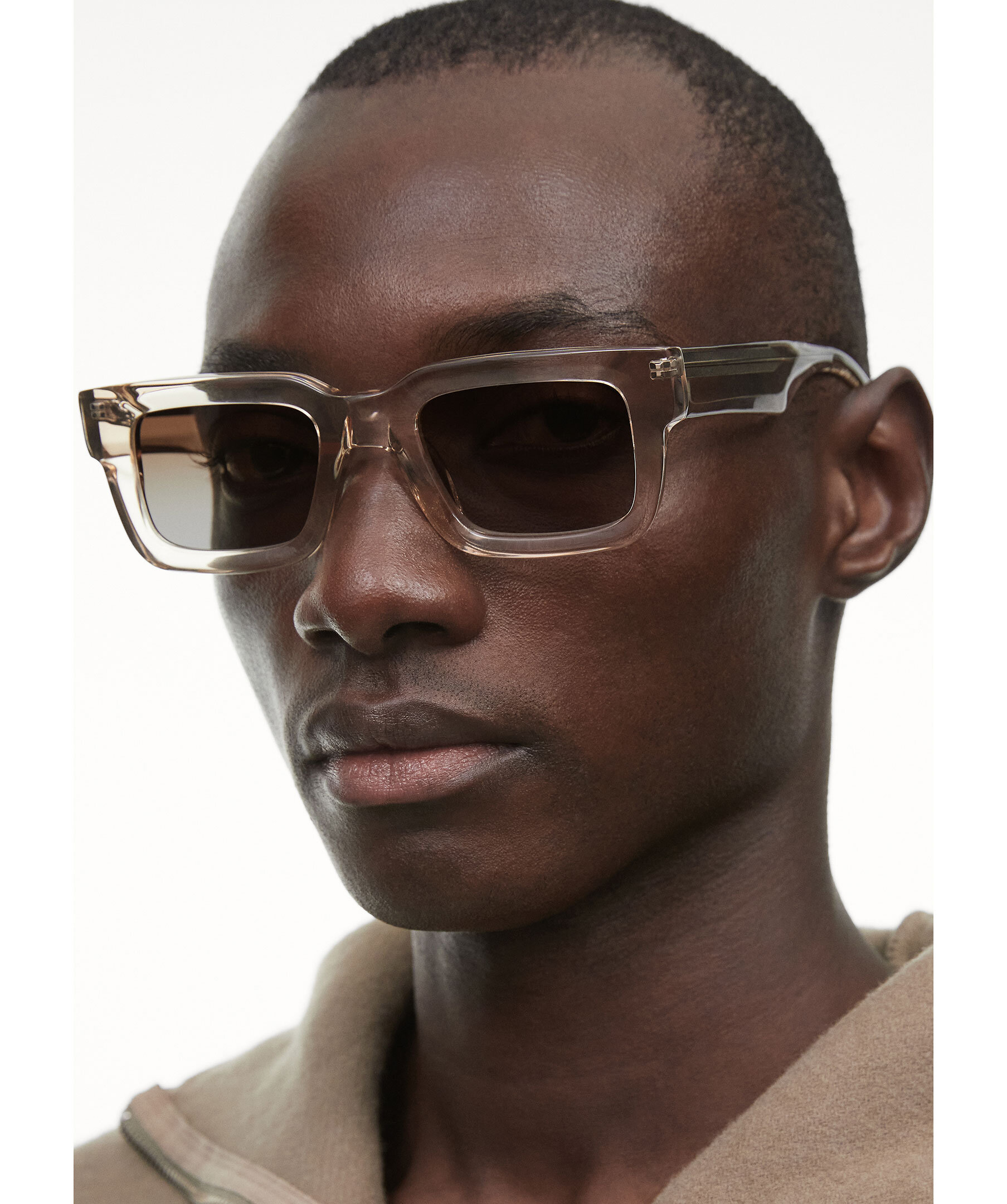 Beigea, transparenta solglasögon i modell 05 från Chimi. 05 är en strukturell kvadratisk siluett med tonvikt på arkitektoniska vinklar. Den minimalistiska ramen har distinkta linjära avfasningar vid skalmarna för en sartorisk look. Försedd med UV-skyddande CR39-linser.
