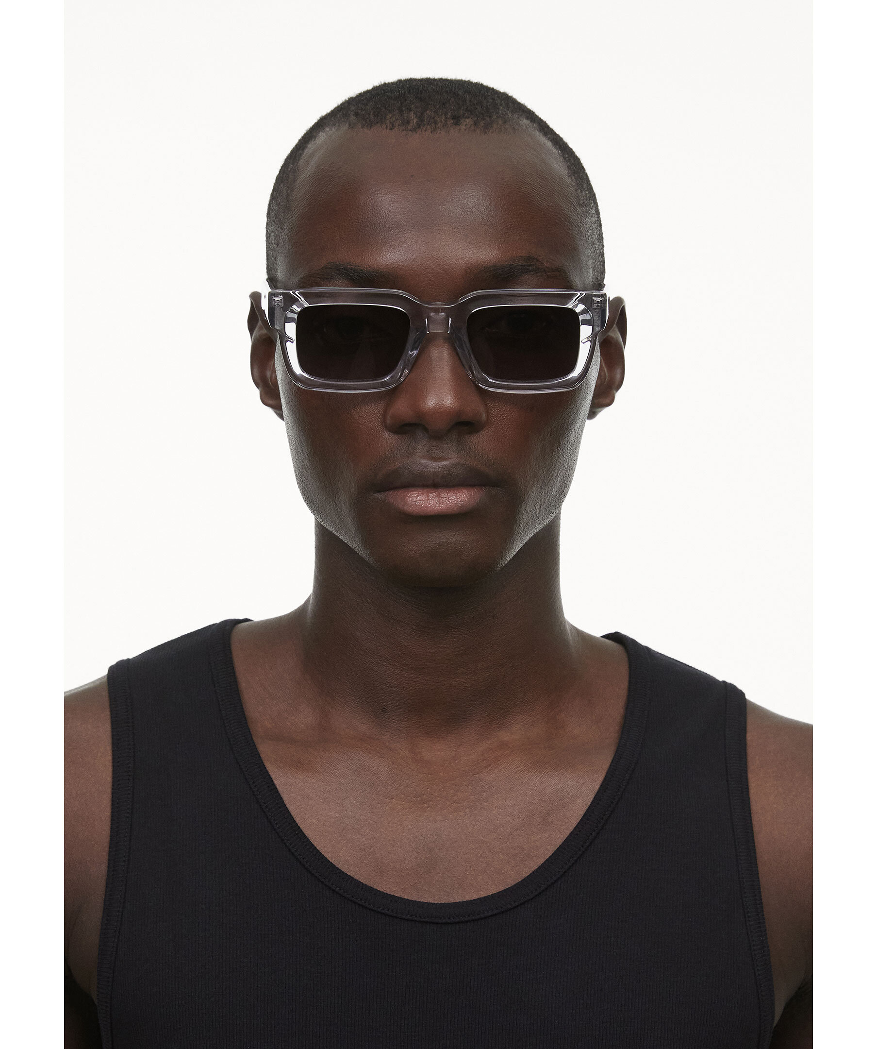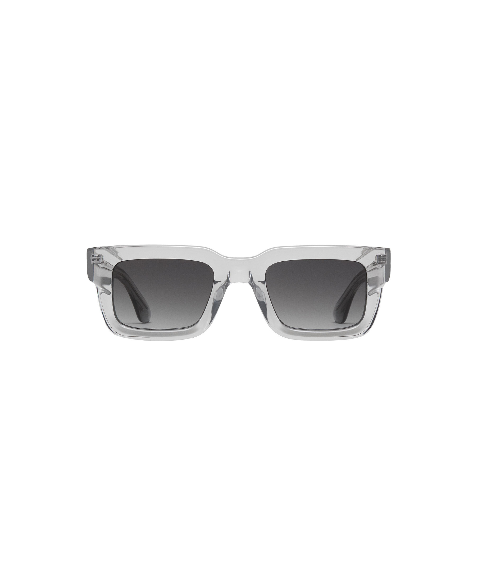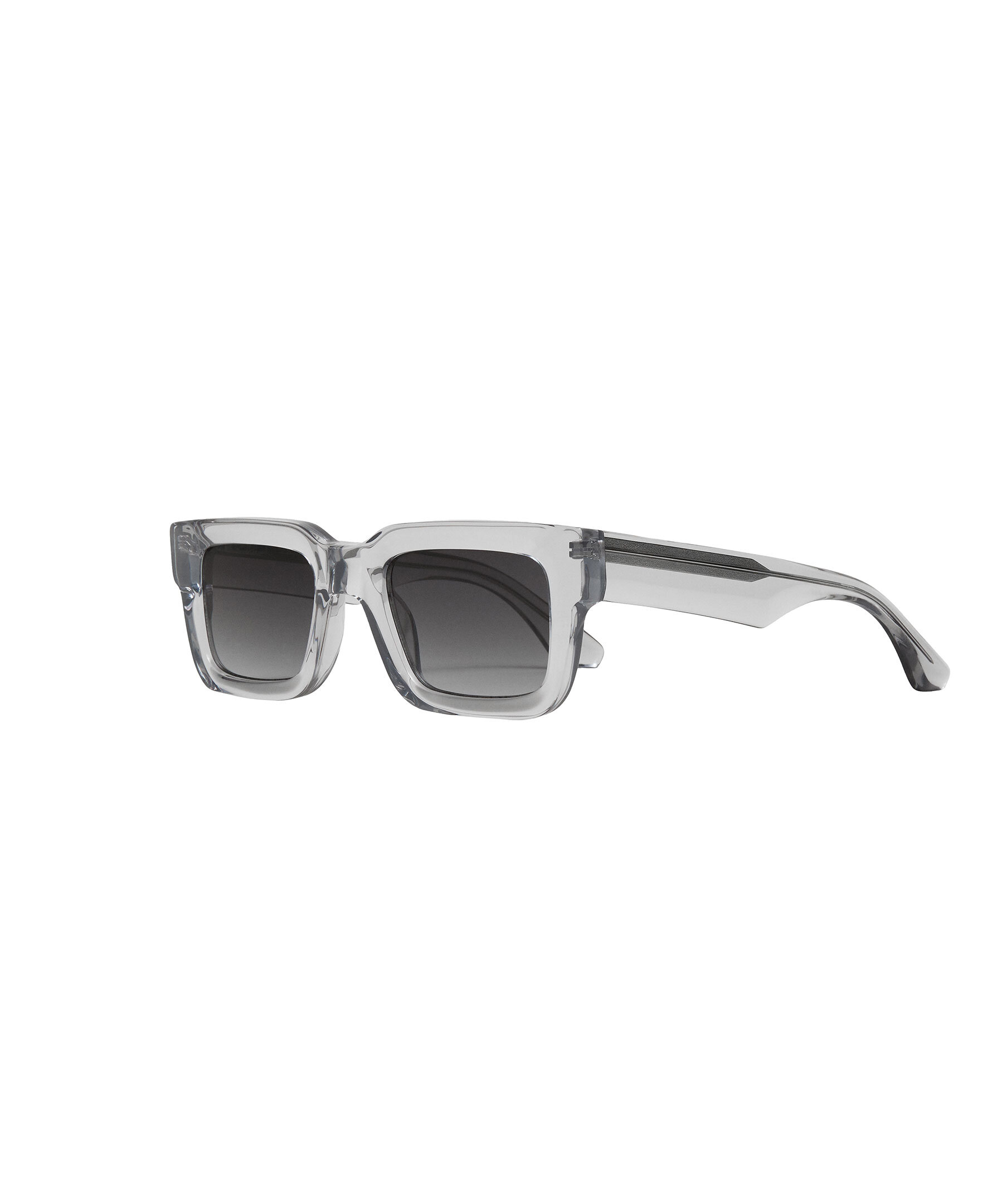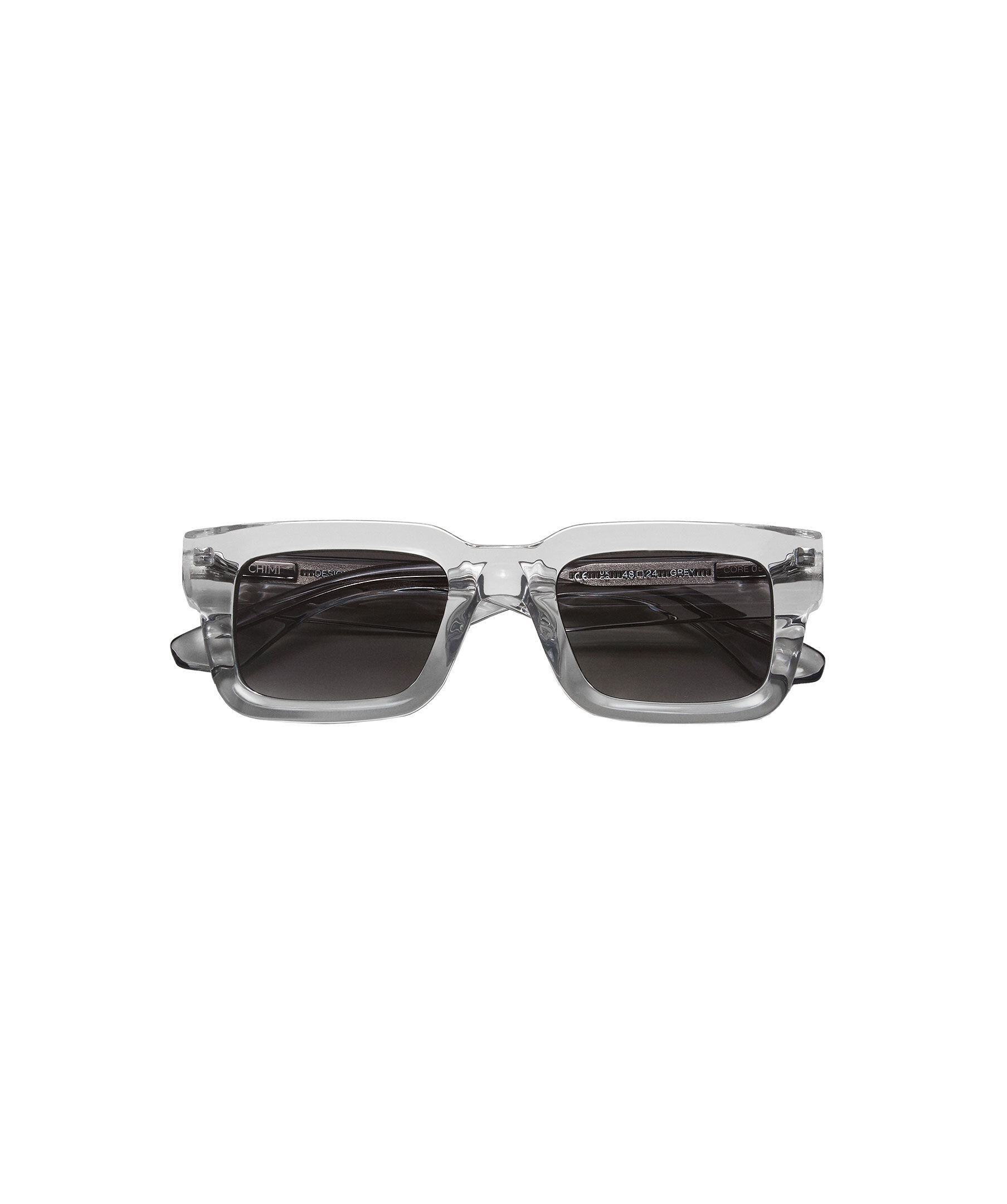 Gråa, transparenta solglasögon i modell 05 från Chimi. 05 är en strukturell kvadratisk siluett med tonvikt på arkitektoniska vinklar. Den minimalistiska ramen har distinkta linjära avfasningar vid skalmarna för en sartorisk look. Försedd med UV-skyddande CR39-linser.