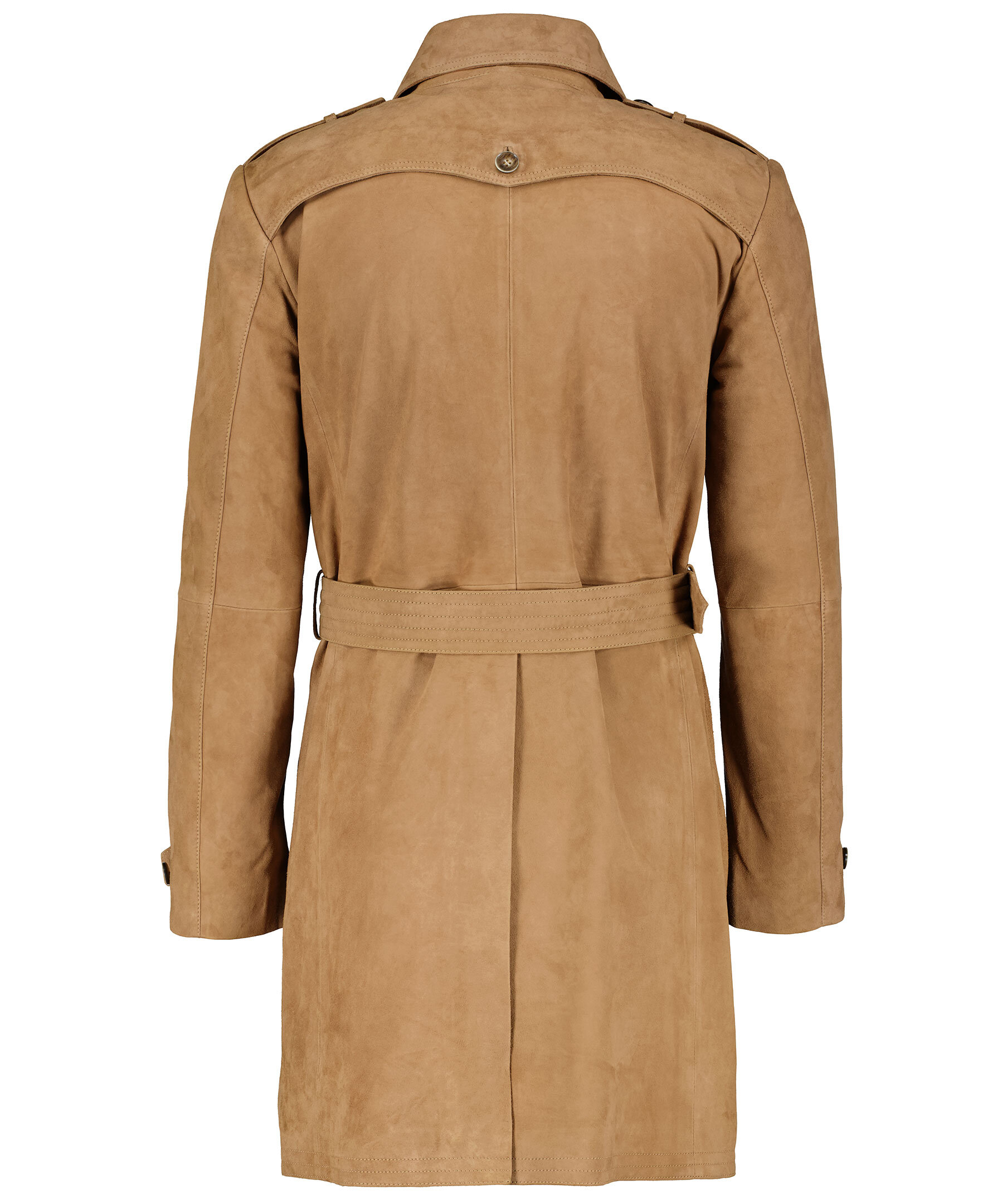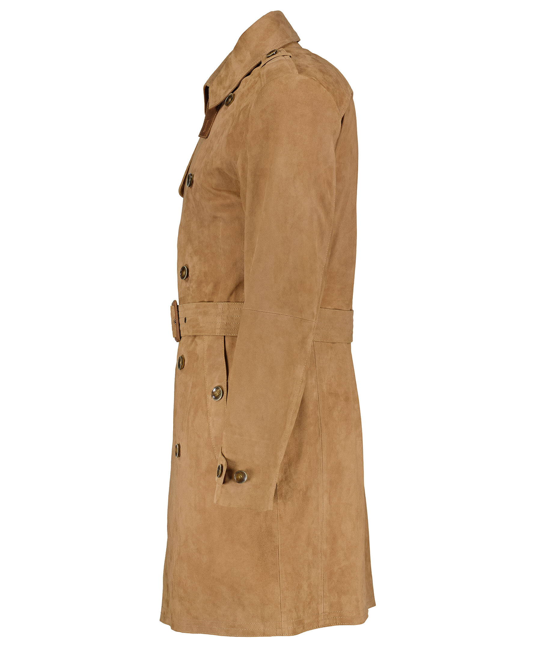 Brun trenchcoat i mocka från Coloniaire. Två sidfickor som stängs med knappar samt två innerfickor. Dubbelknäppt med bruna knappar och bälte i midjan.