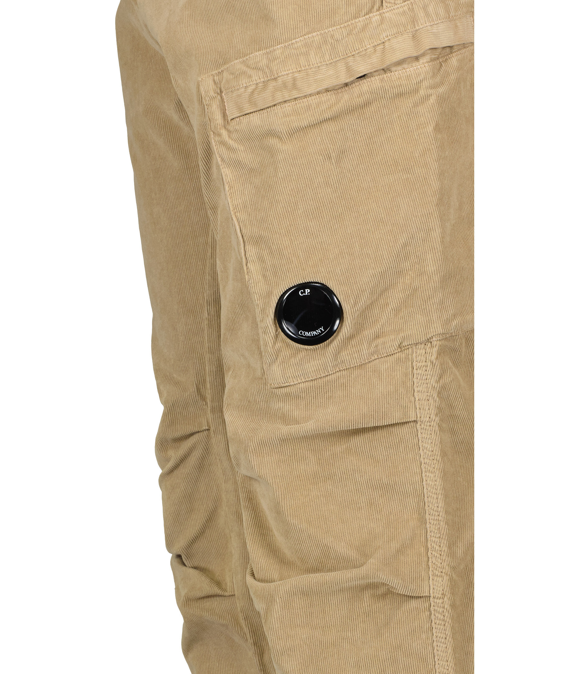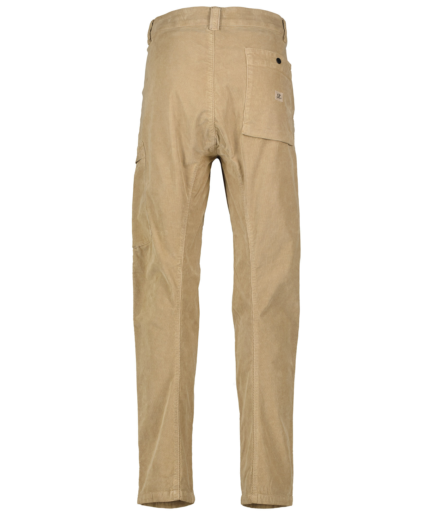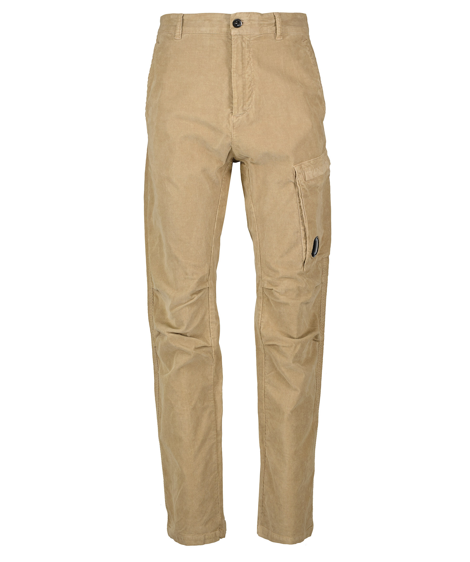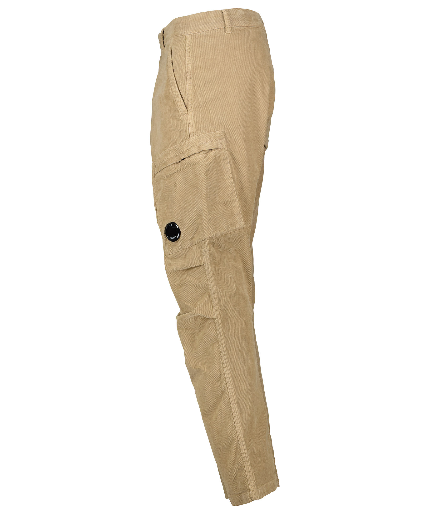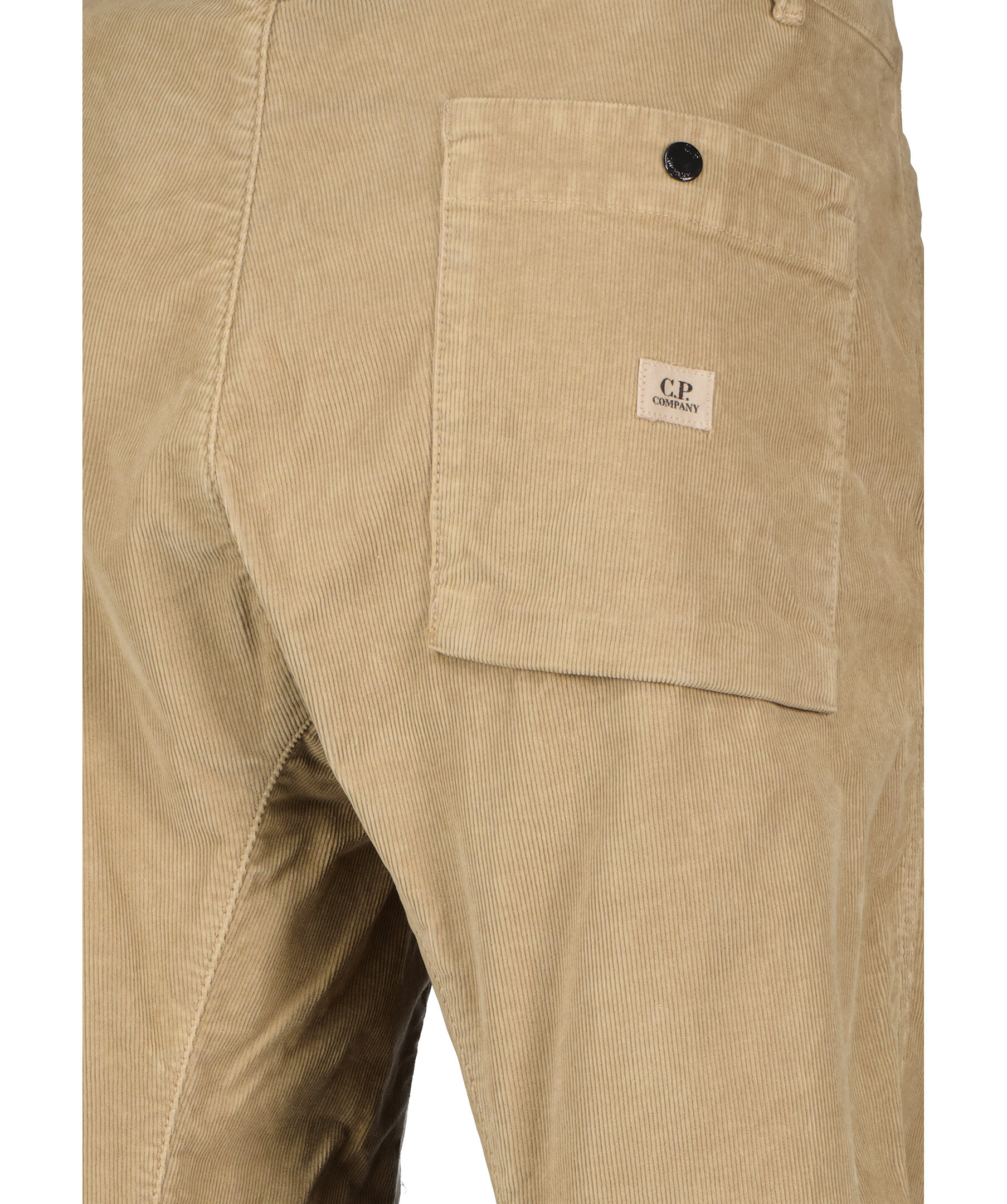 Beigea Manchester byxor från C.P Company. Hällor från bälte. Tre fickor framtill, en som stängs med tryckknapp med bricka på vänster ben. En ficka baktill som stängs med tryckknapp, patch med logotyp.